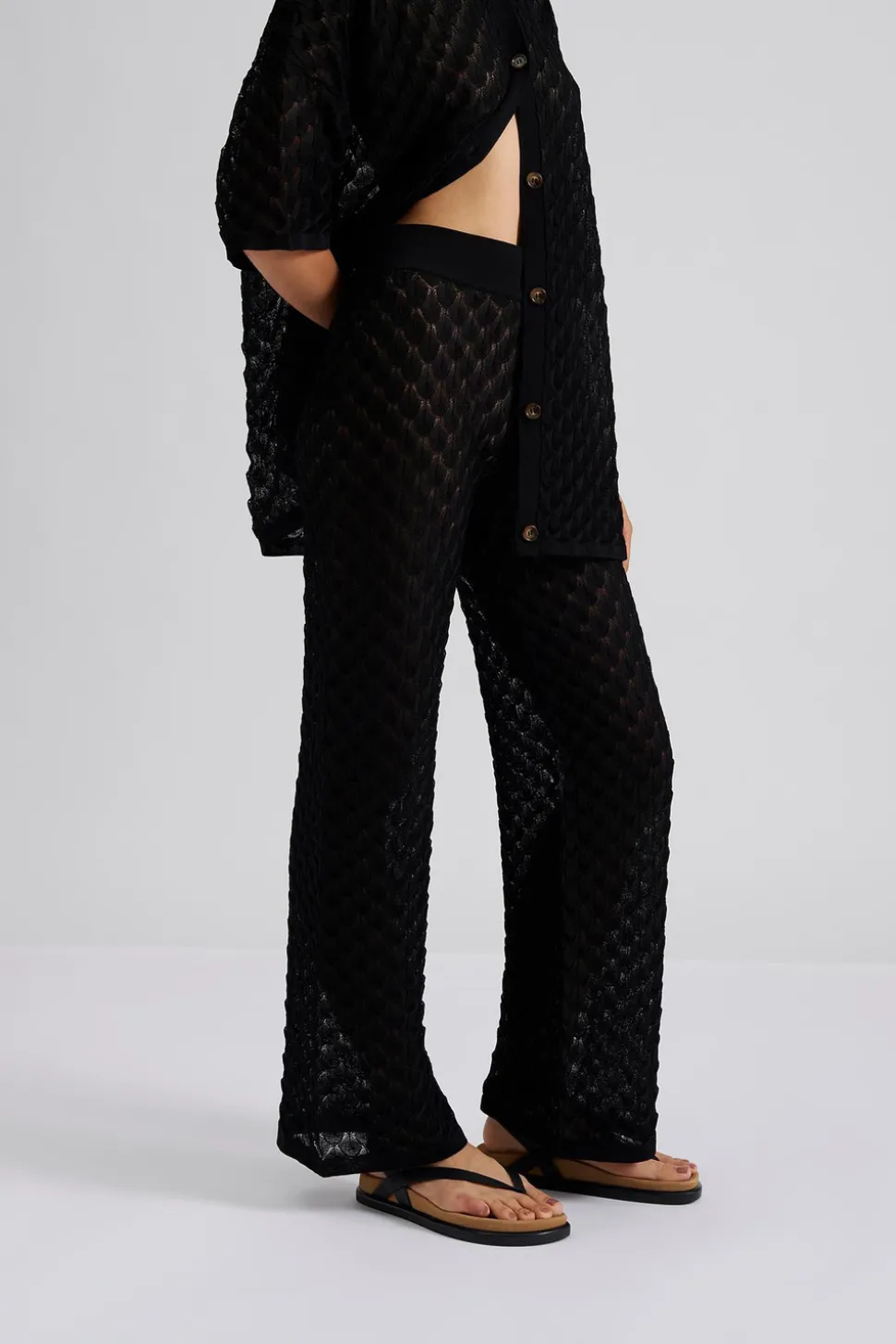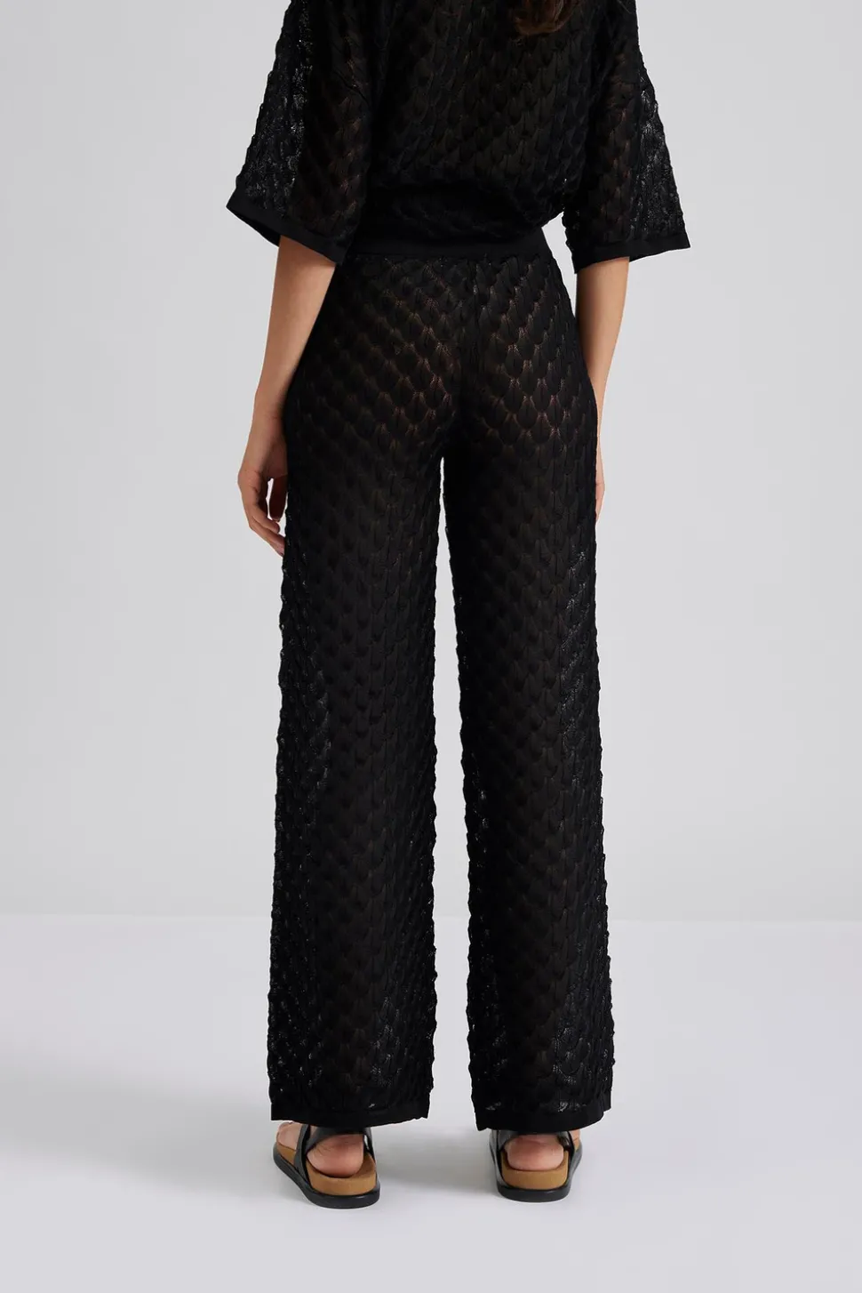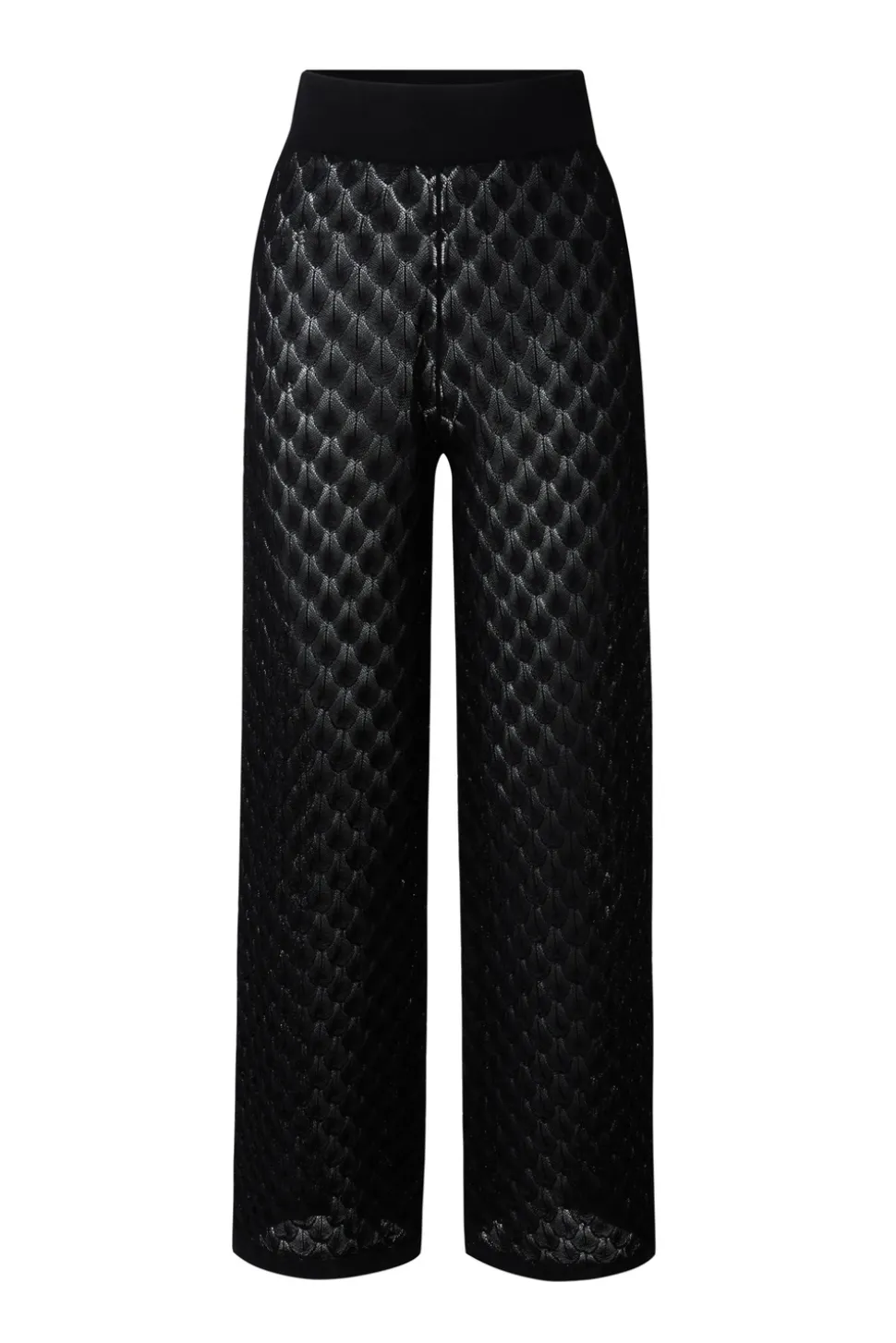 Högmidjade virkade byxor med elastisk midja.