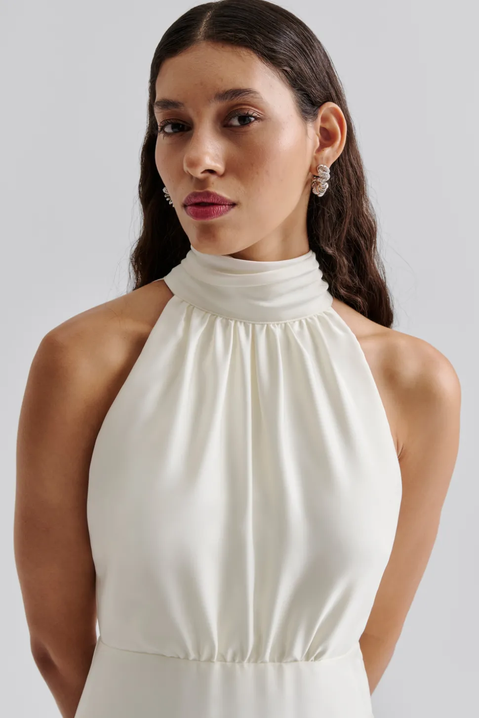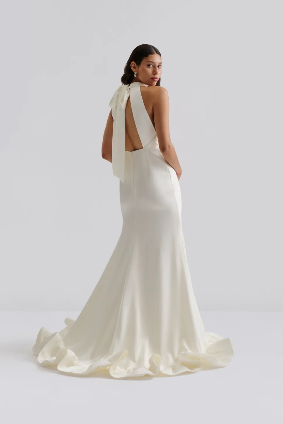 En glänsande satinklänning med halterneck, knytning i nacken, öppen rygg, lång volangkjol med släp och en figurnära midja.
