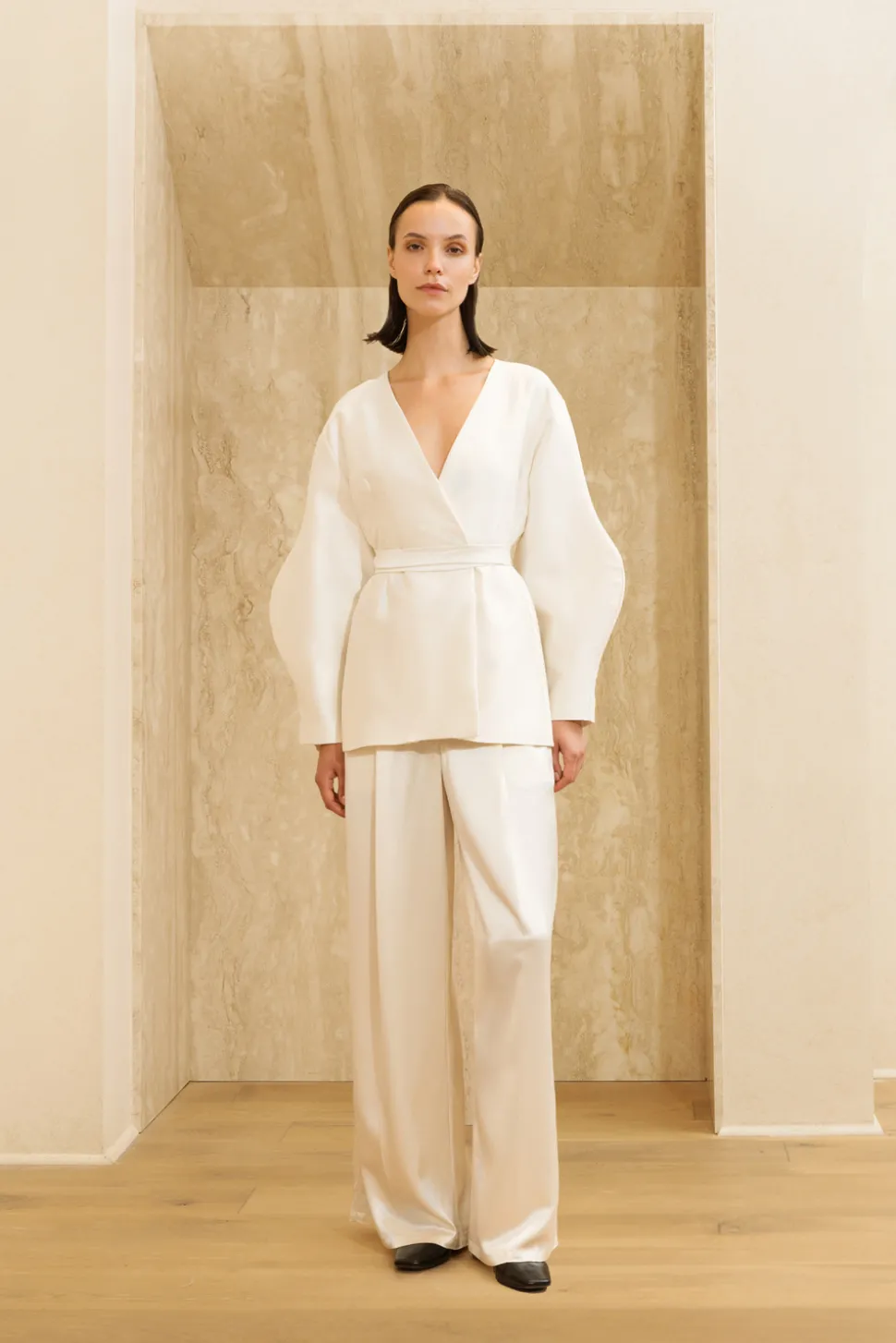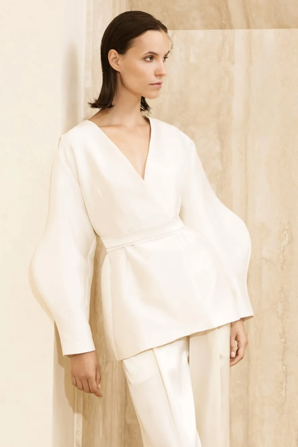 Satinkavaj i en sidenblandning med ballongärm och ett bälte i midjan.