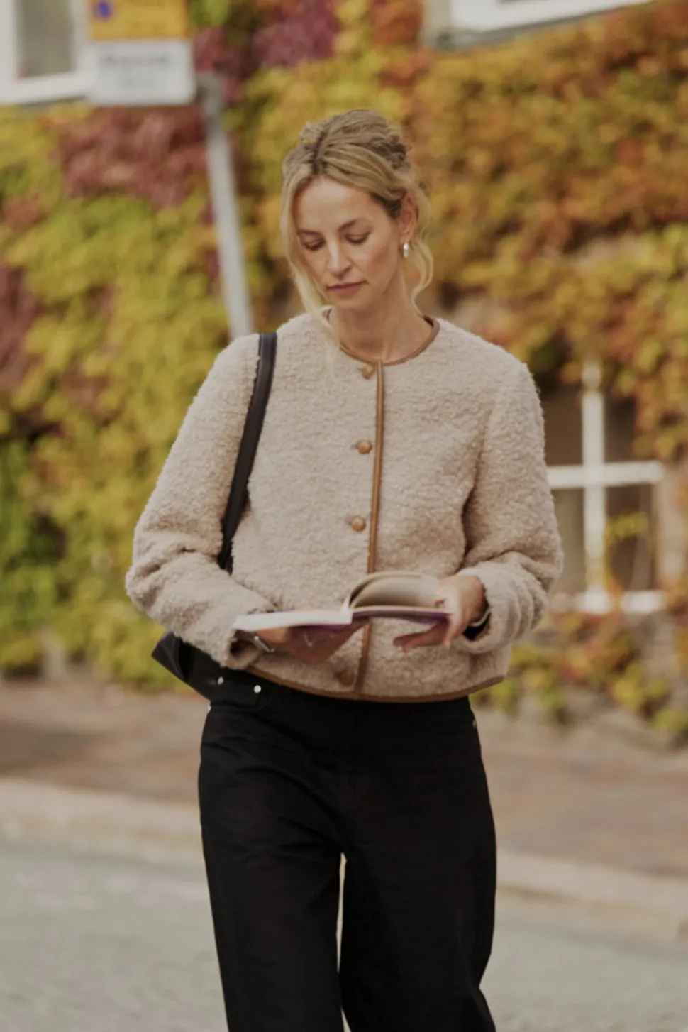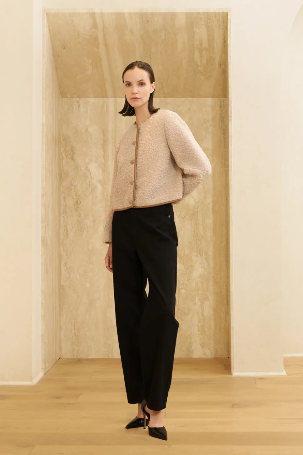 Jacka i ullblandning med läderdetaljer.