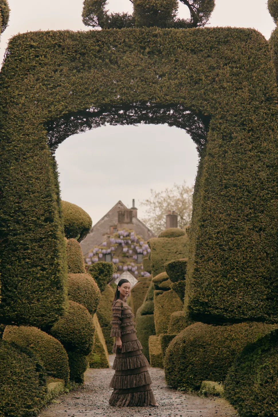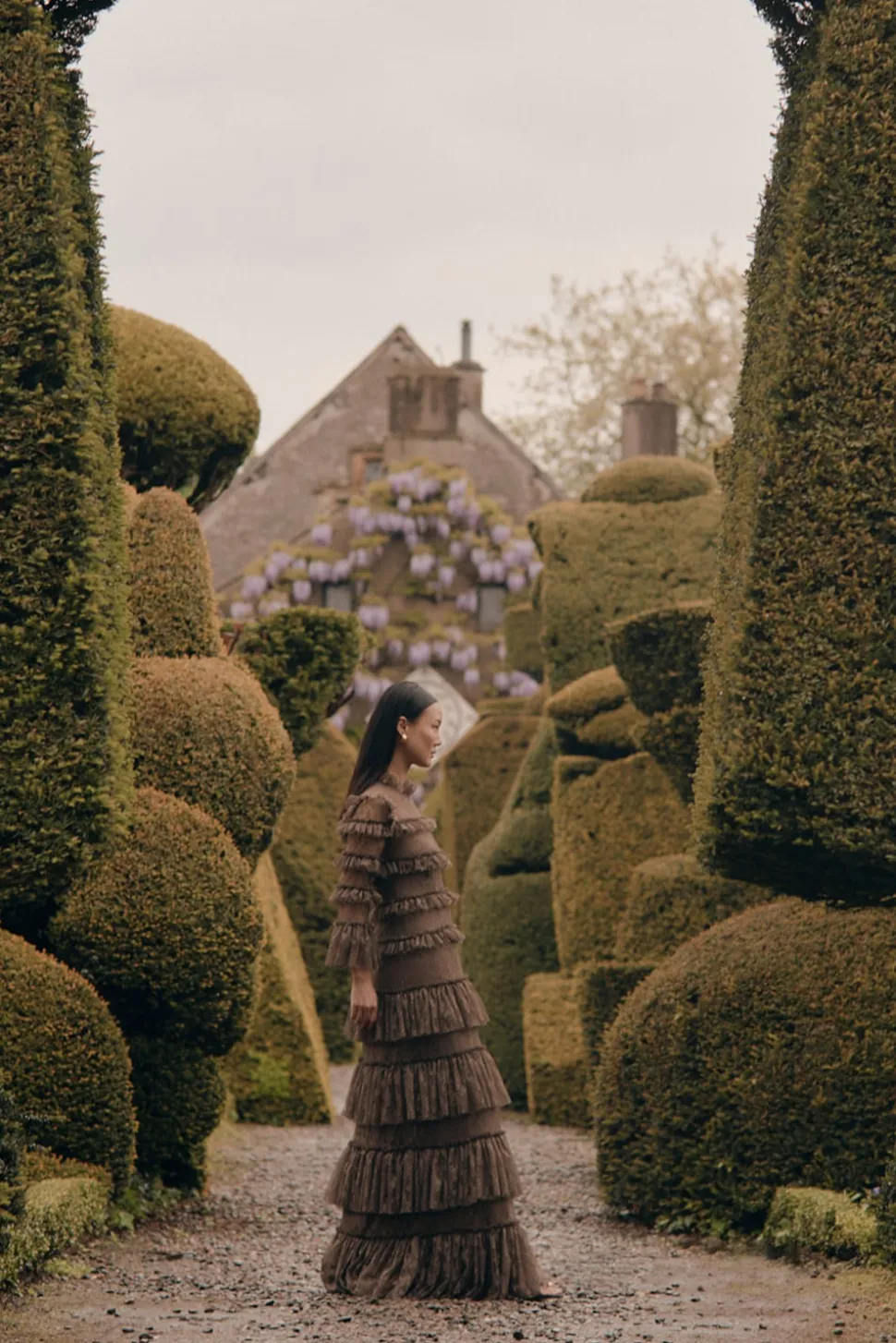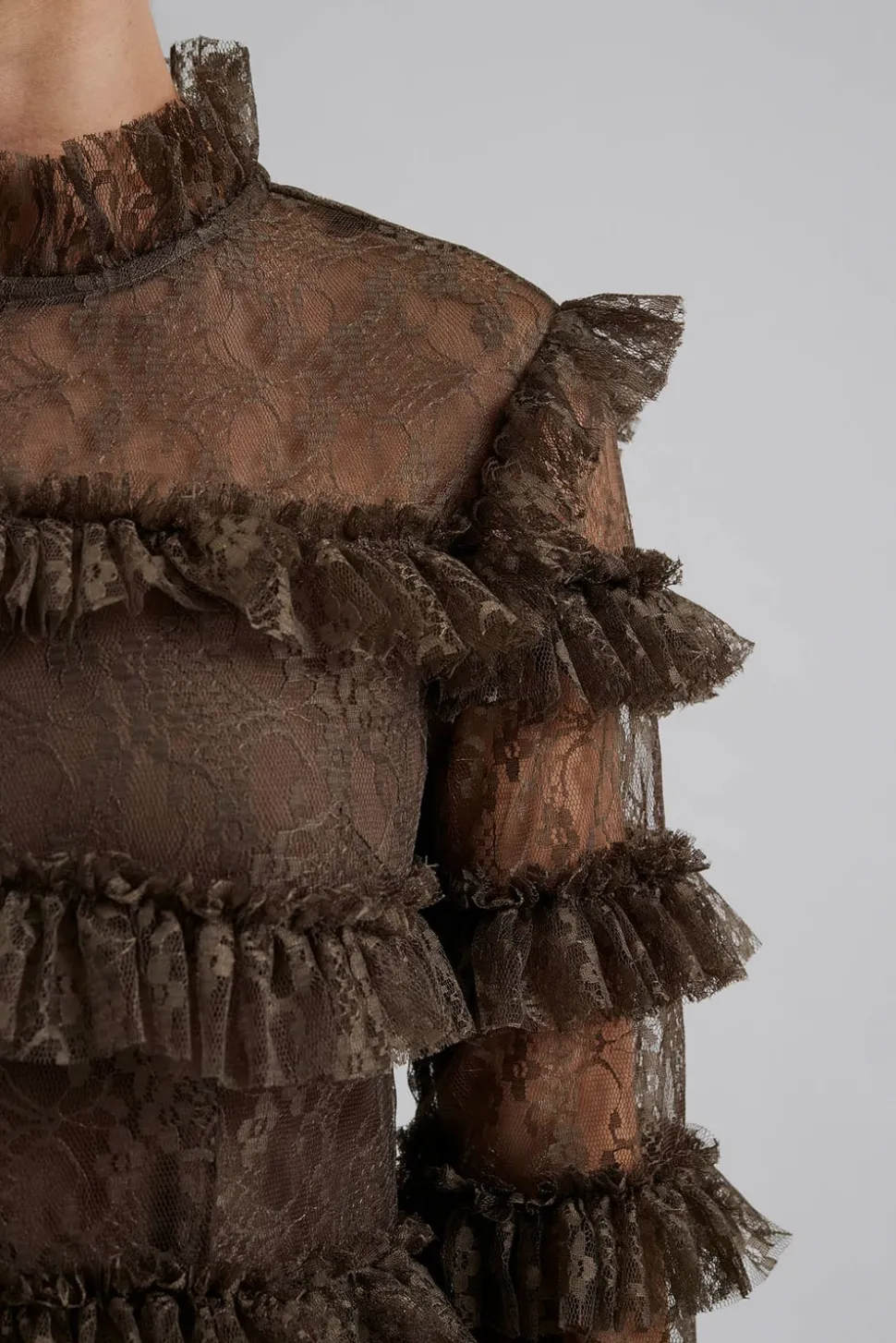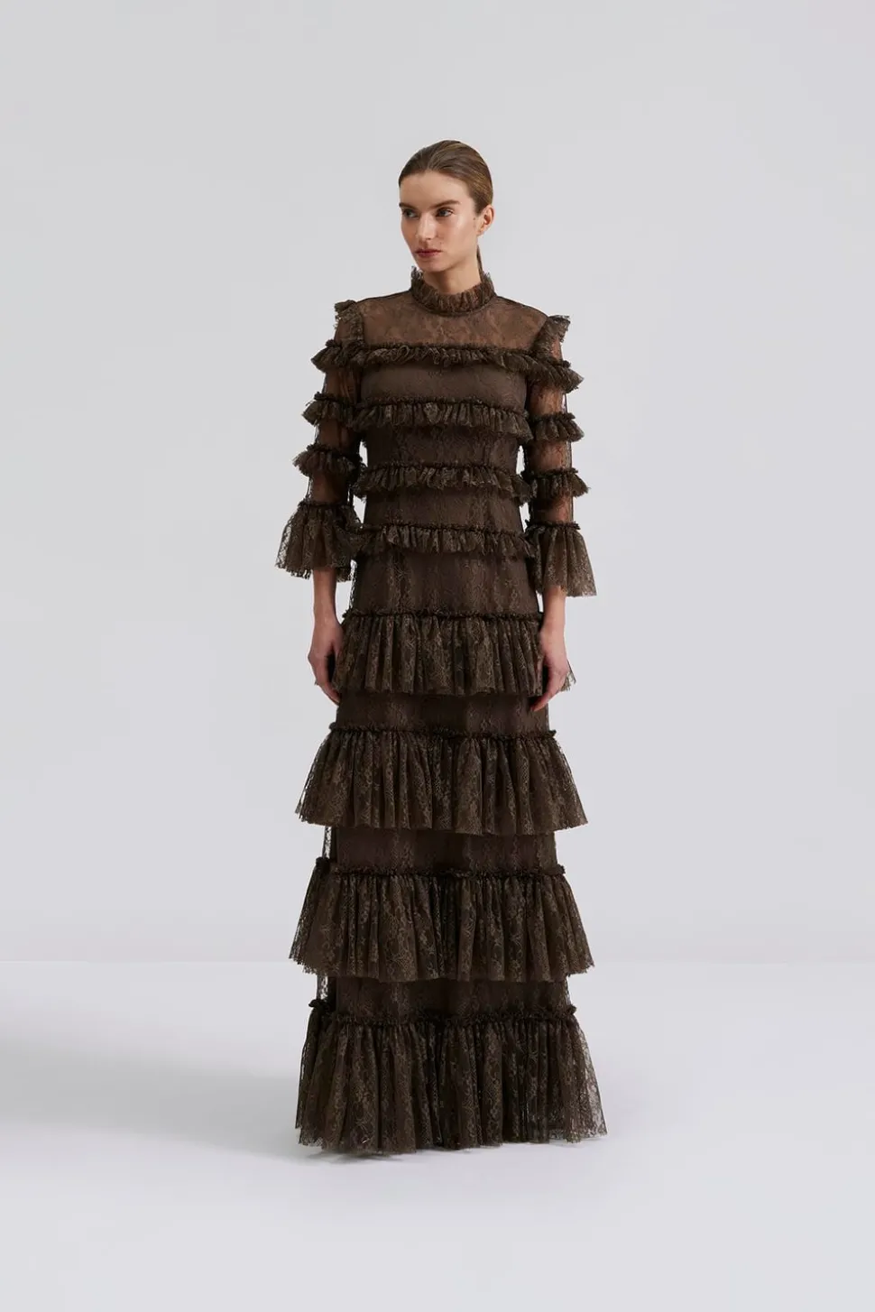 Maxiklänning med transparenta spetspartier runt hals och ärmar och har foder på resten. Feminim siluett med hög krage.
