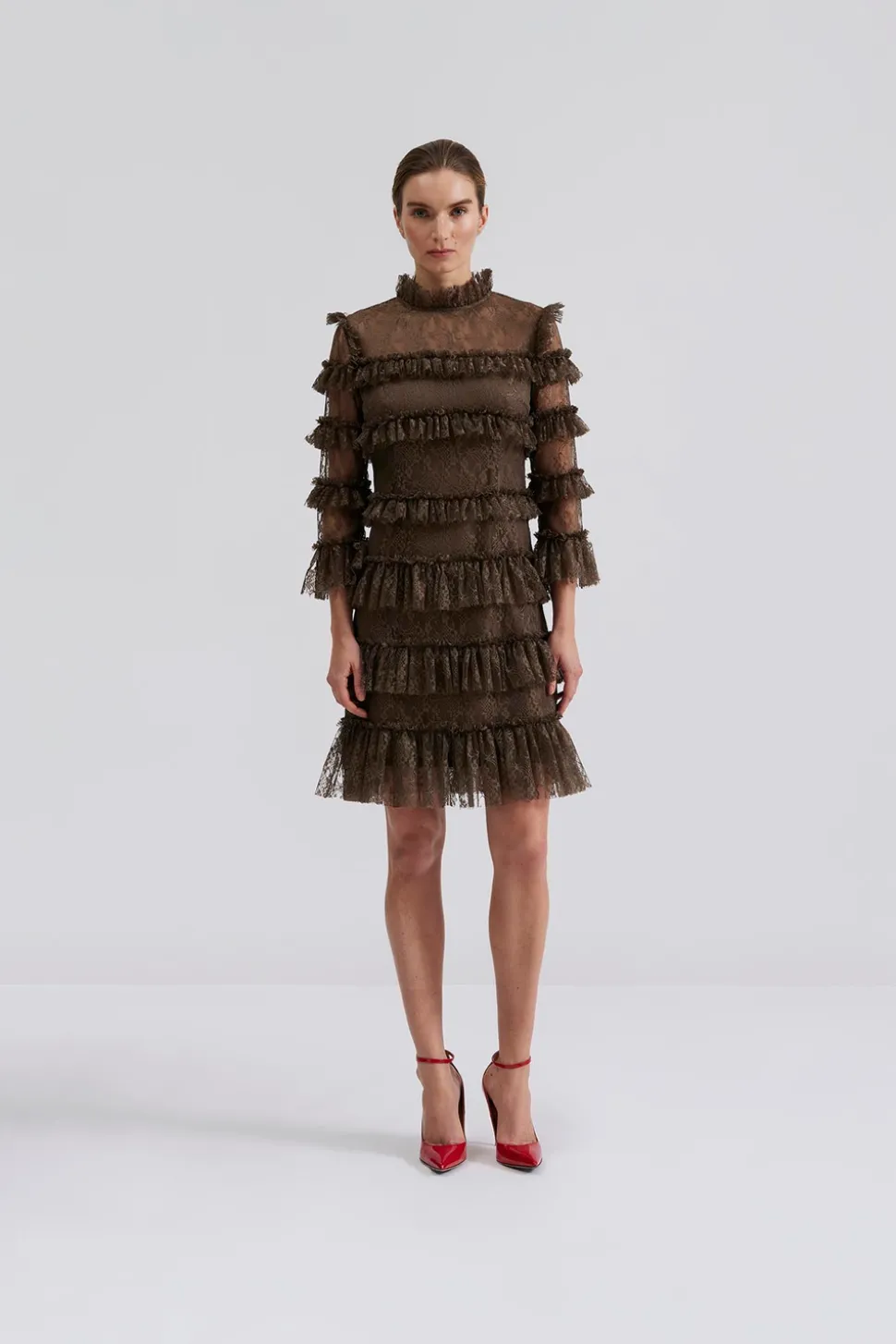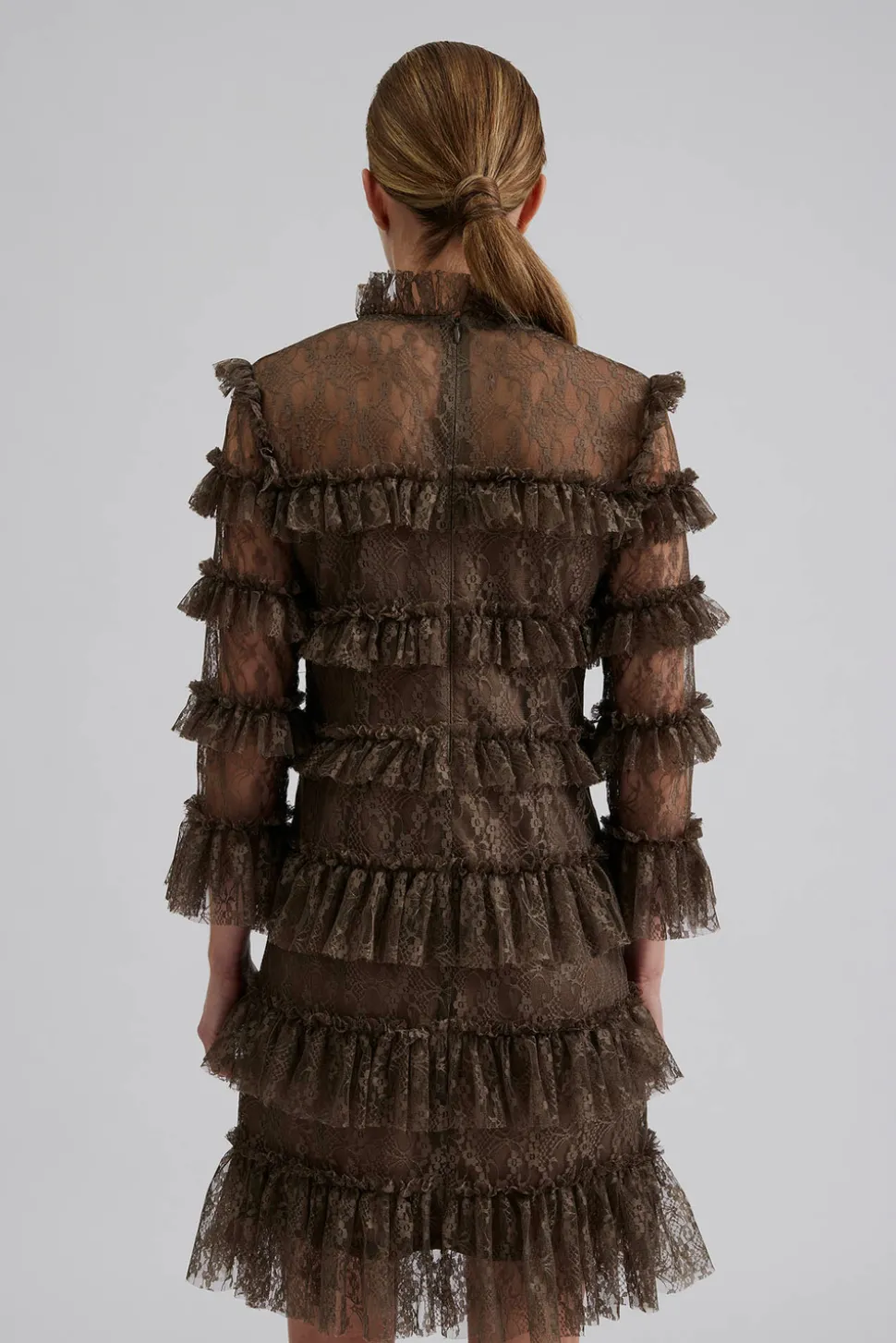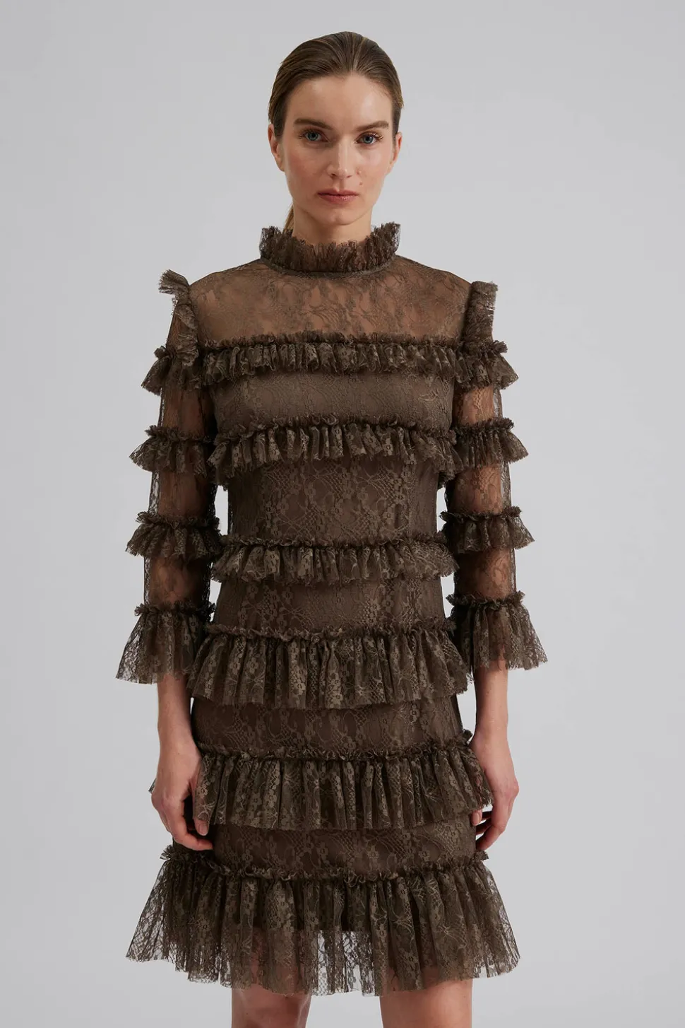 Miniklänning i spets med hög krage, långa ärmar och kort kjol täckt i volanger.