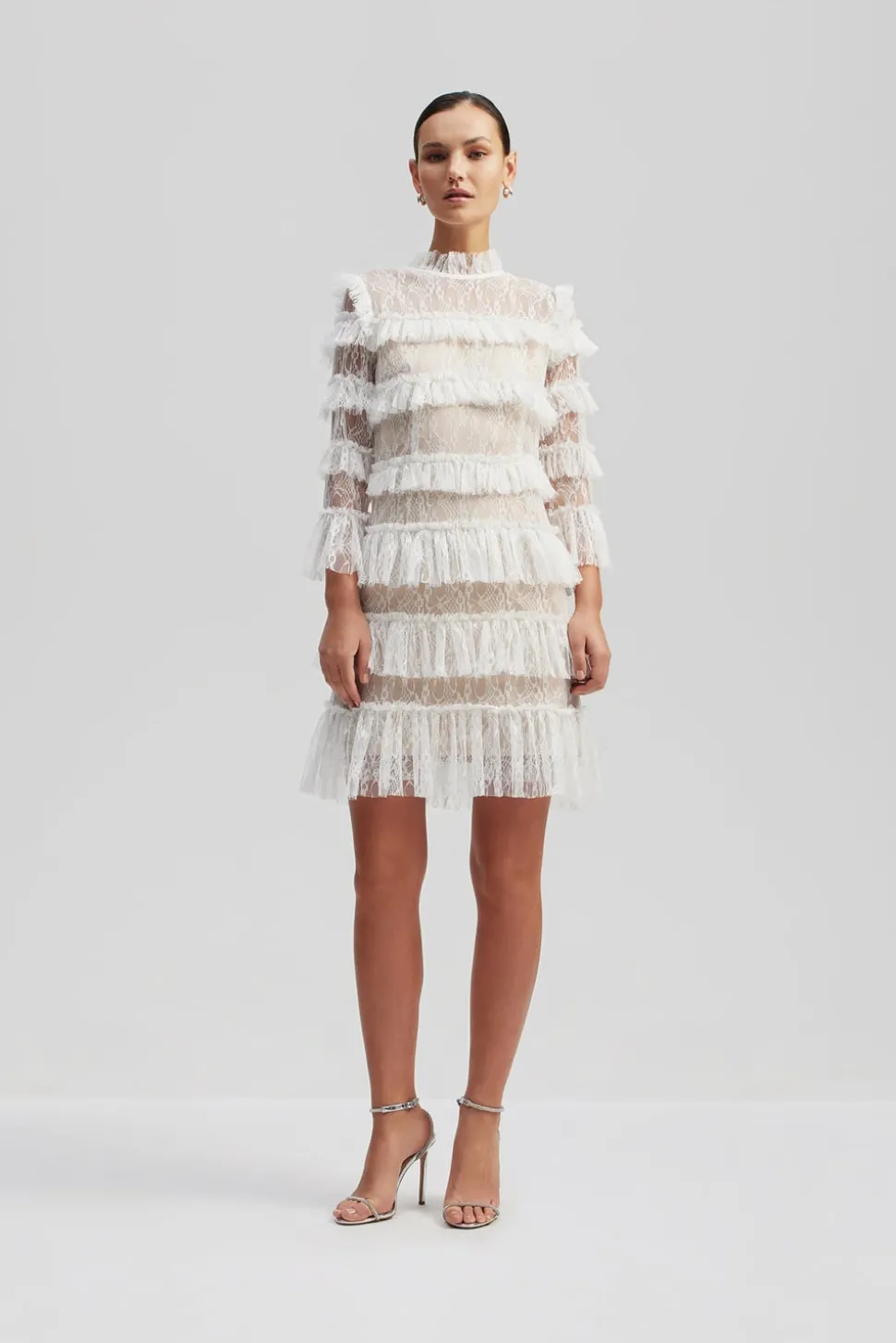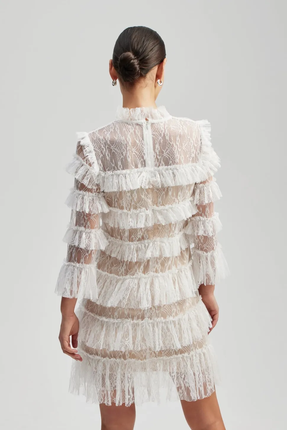 Miniklänning i spets med hög krage, långa ärmar och kort kjol täckt i volanger.