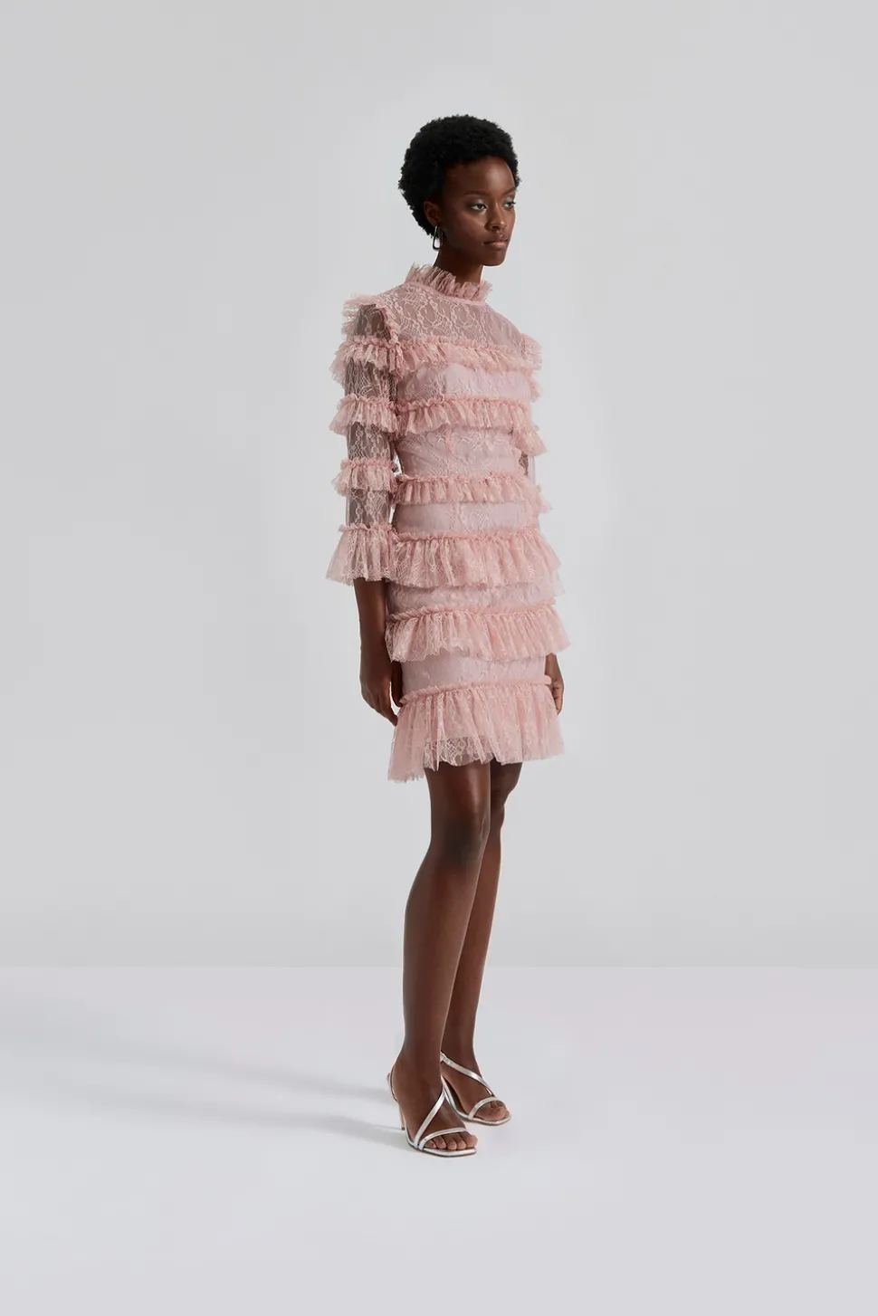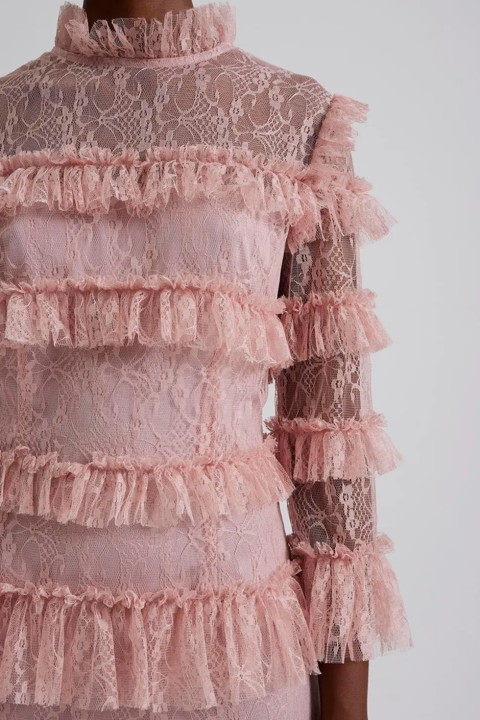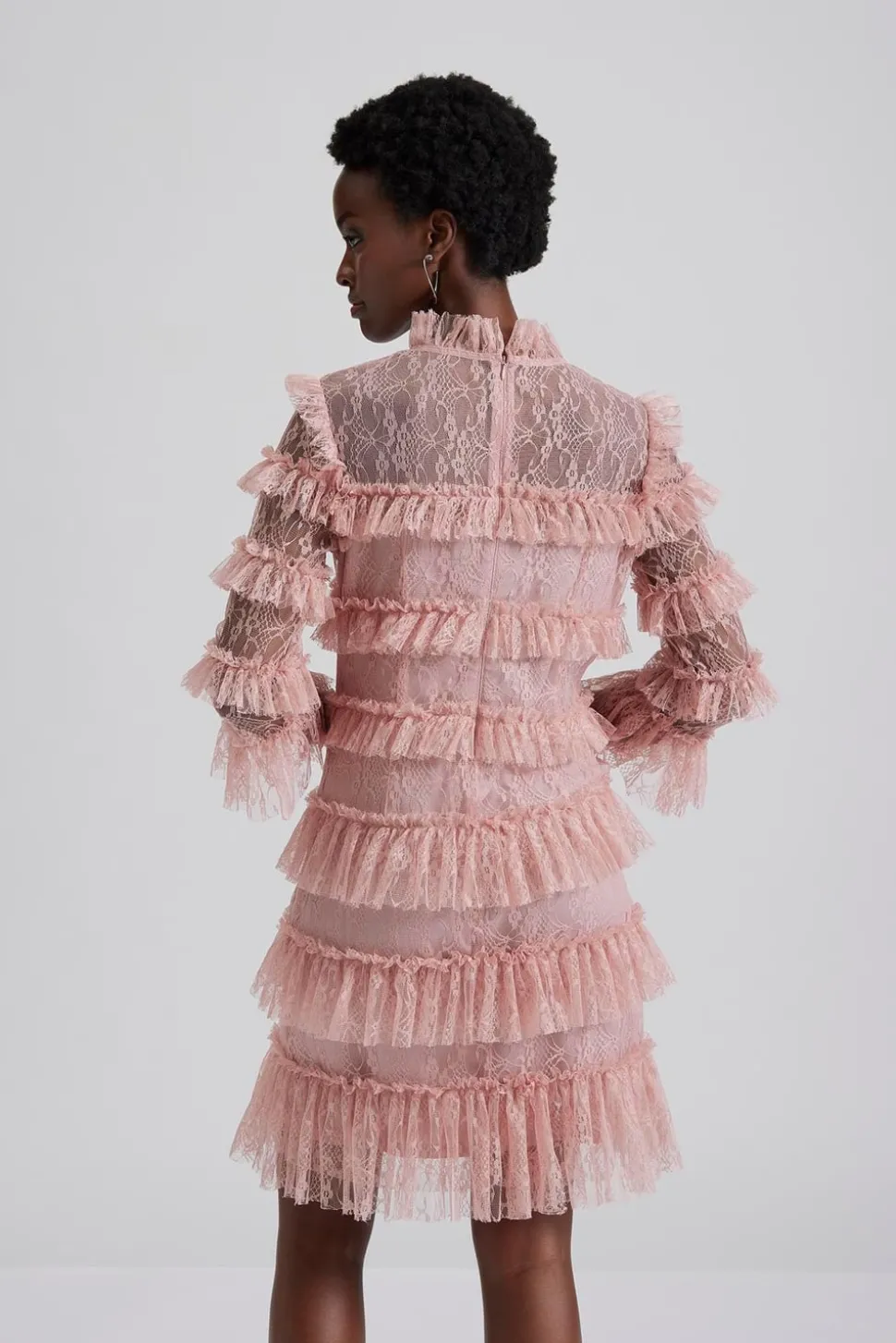 Miniklänning i spets med hög krage, långa ärmar och kort kjol täckt i volanger.
