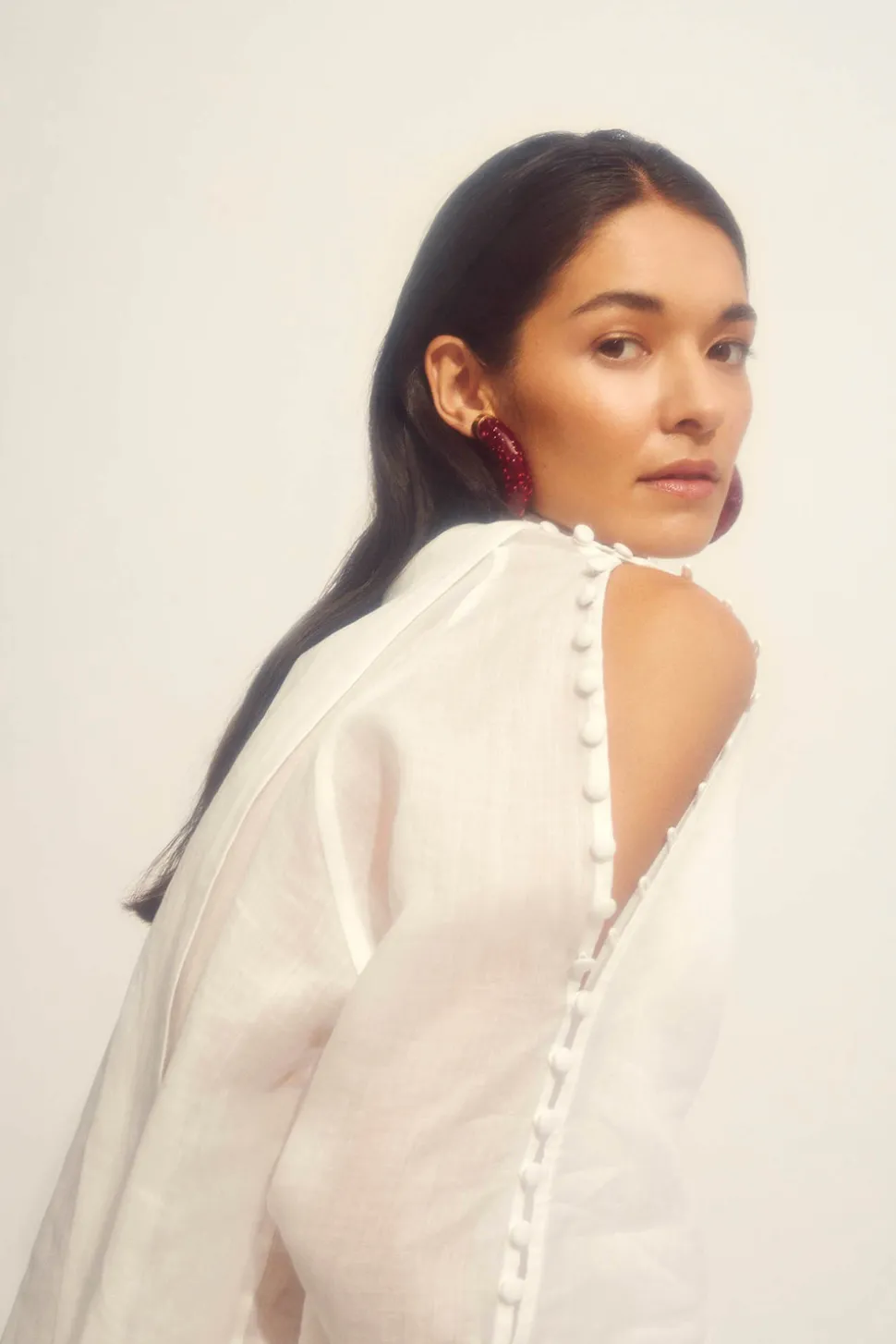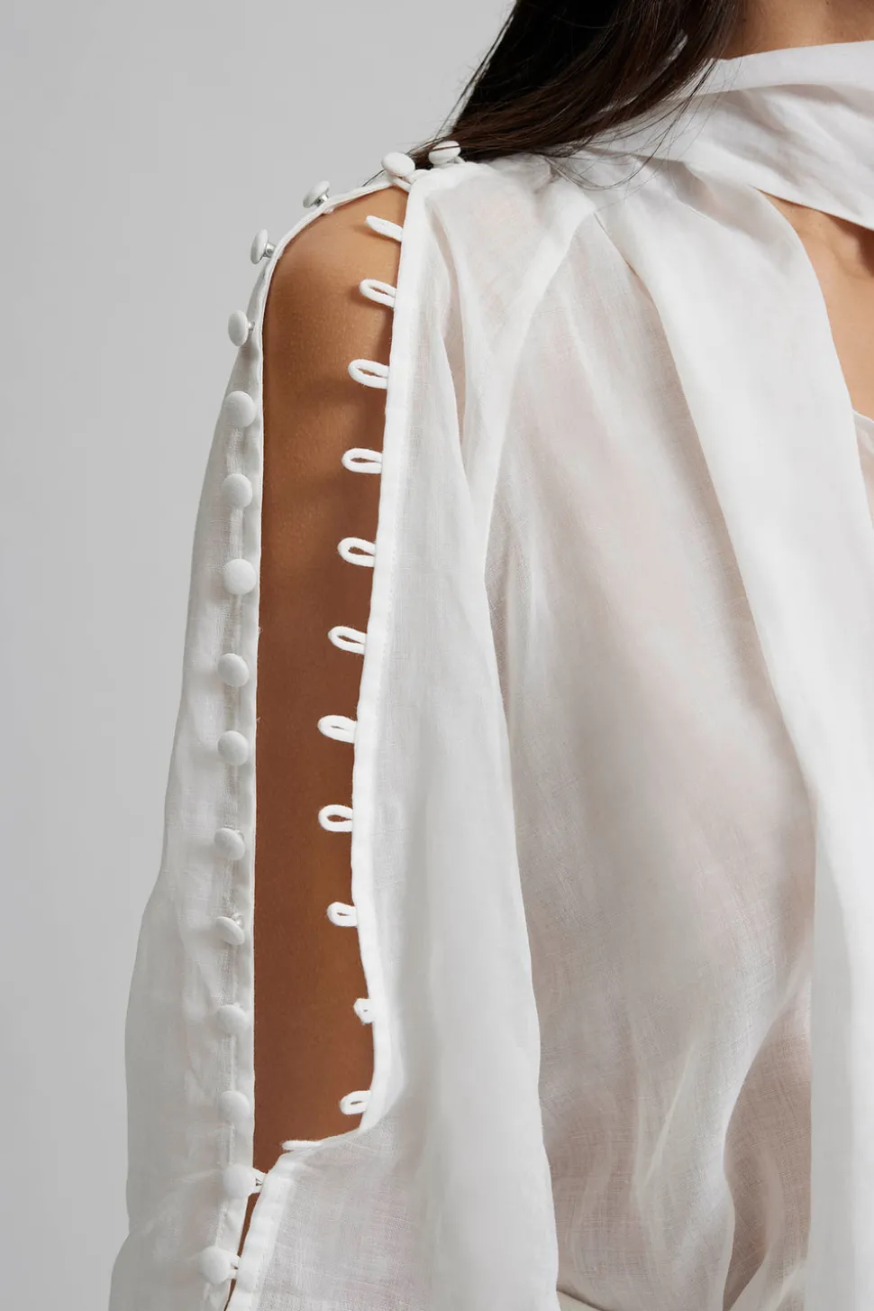 Långärmad blus med öppen axel, knyts i halsen och med knappdetaljer.