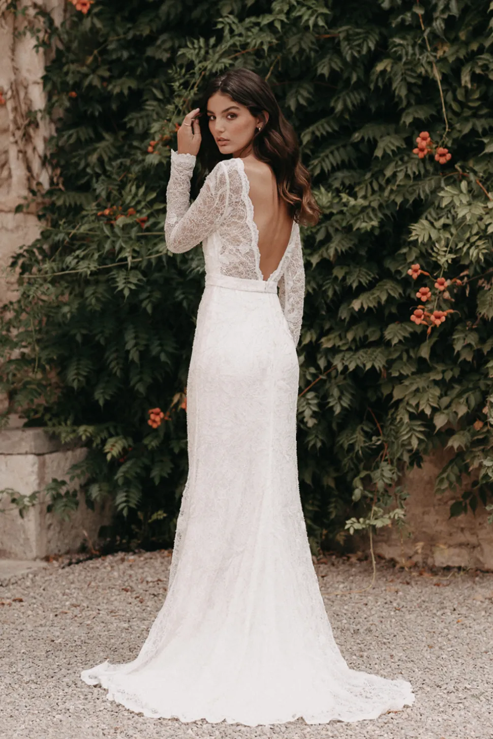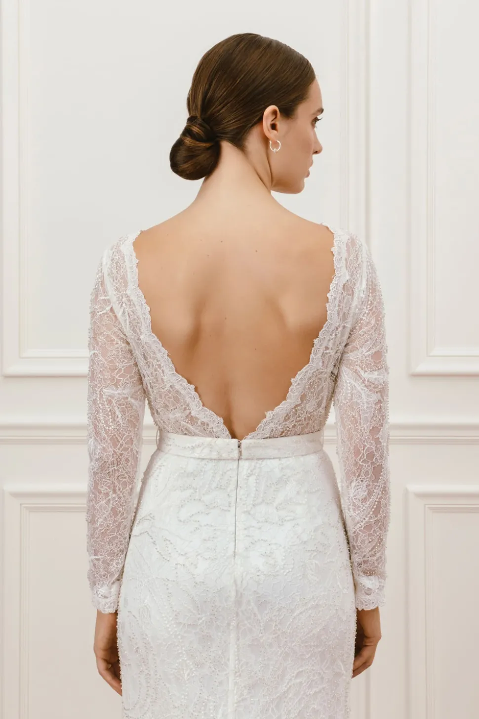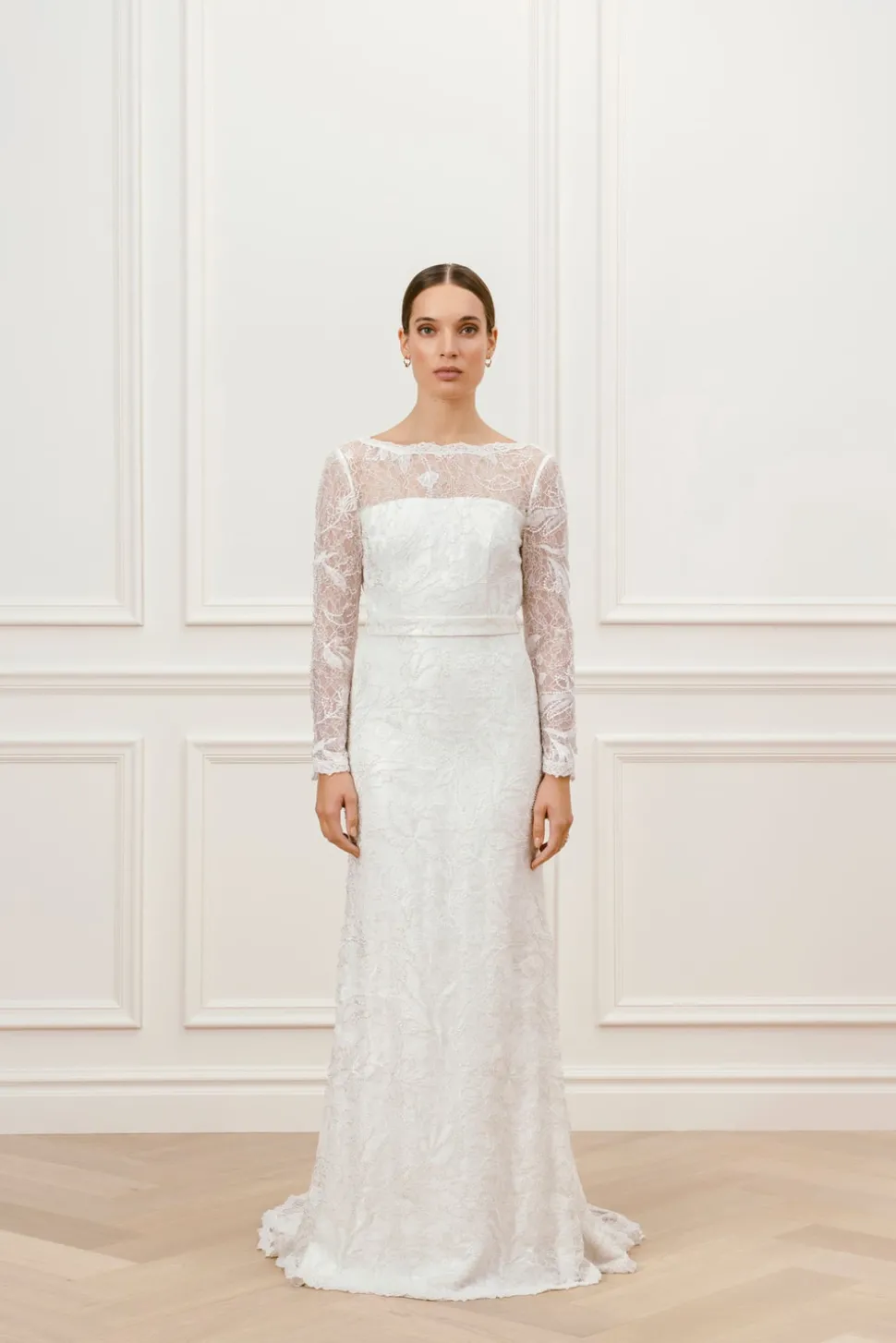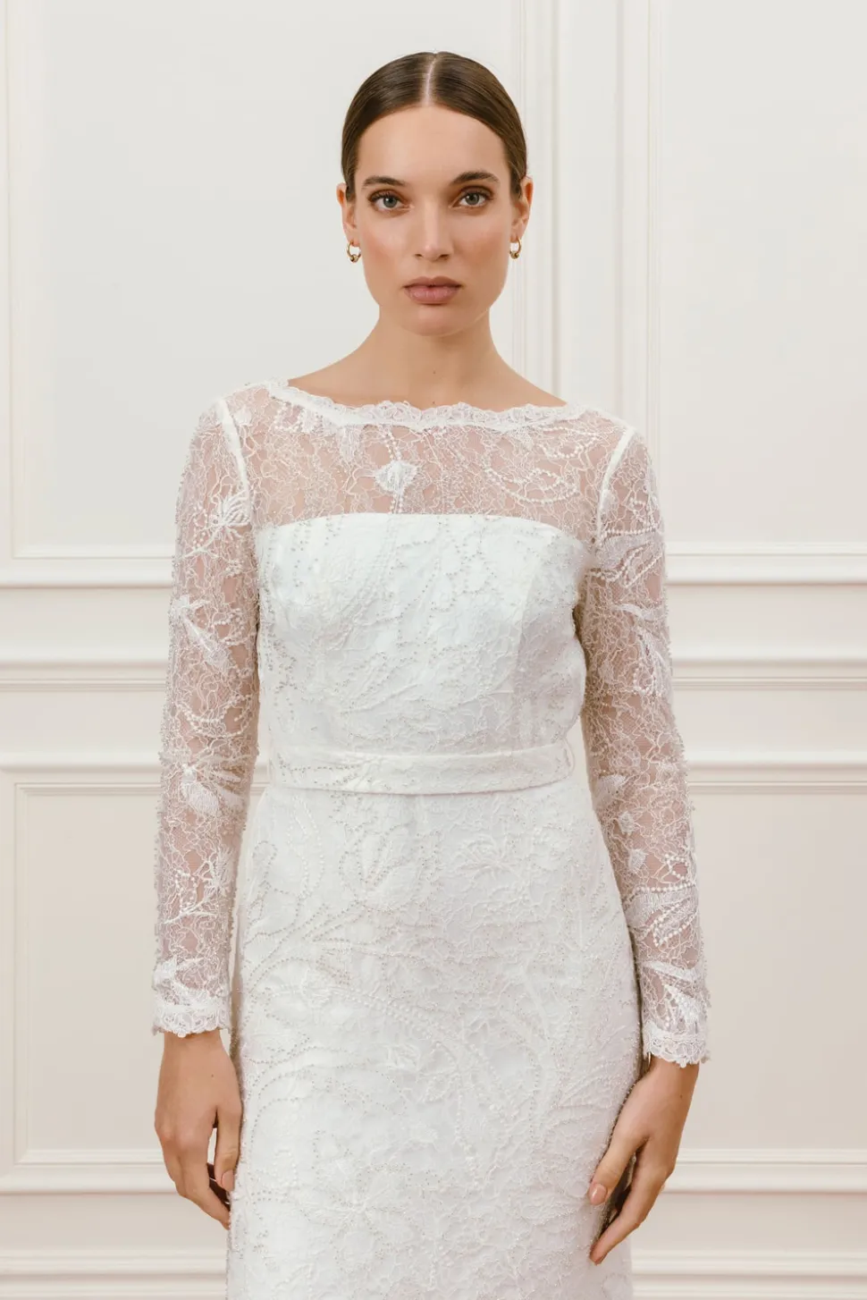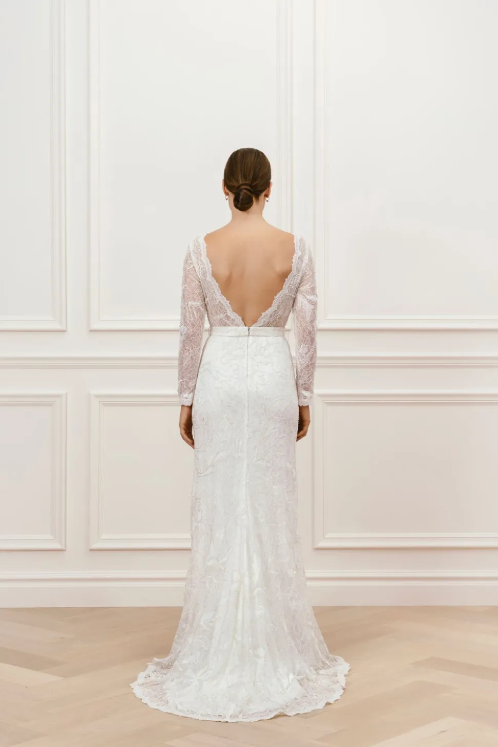 En lyxig klänning med pärlbroderad spets. Daniela gown har vackra långa ärmar och en elegant båtringning. Denna klänning har en underbar öppen rygg, figurnära silhouett och ett avtagbart midjeband.