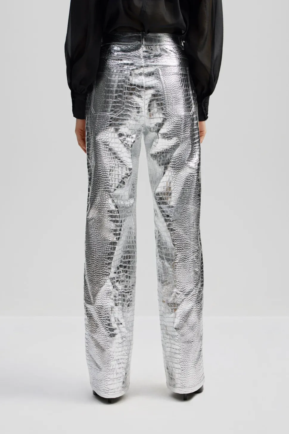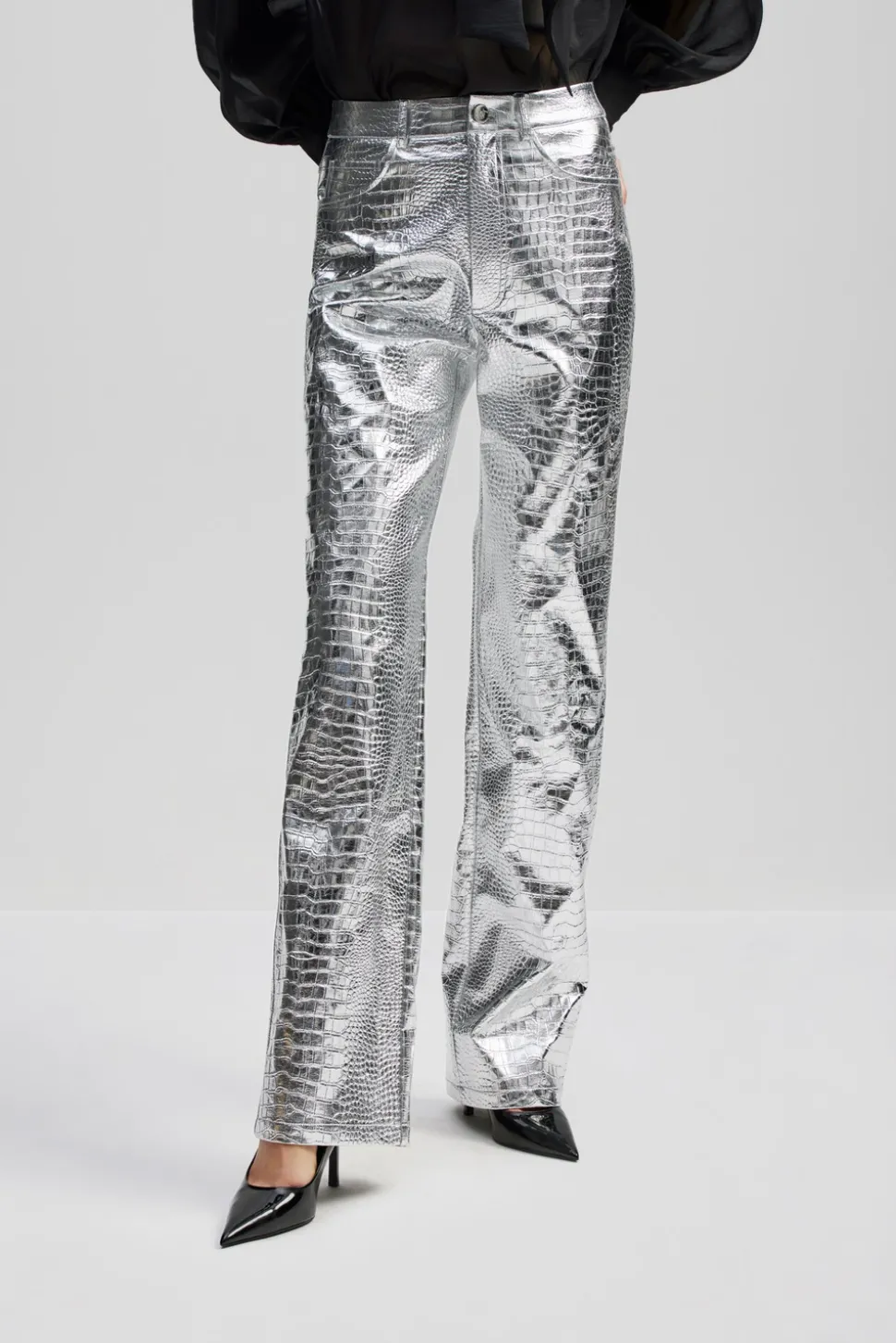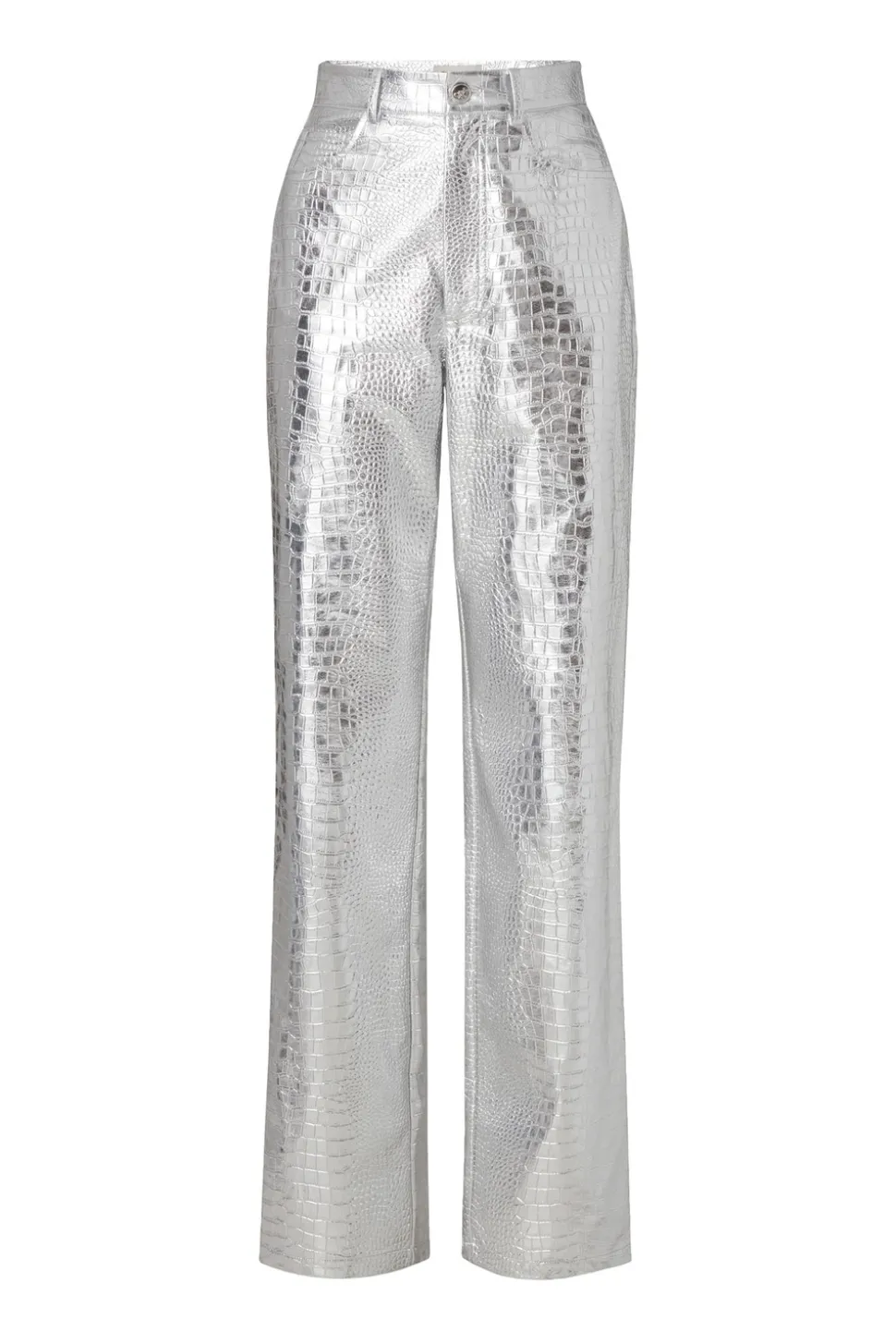 Högmidjade och silvriga, metalliska byxor i crocomönster med raka ben.