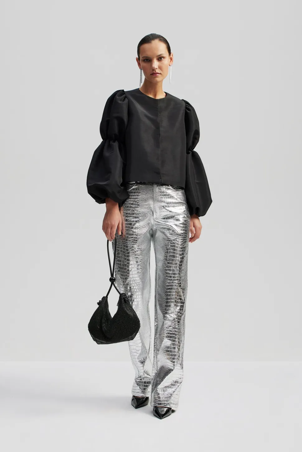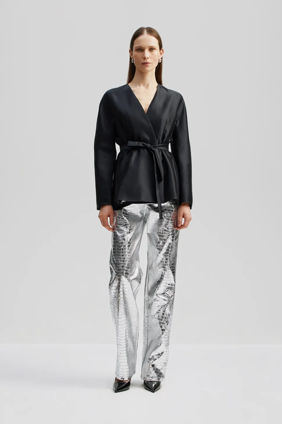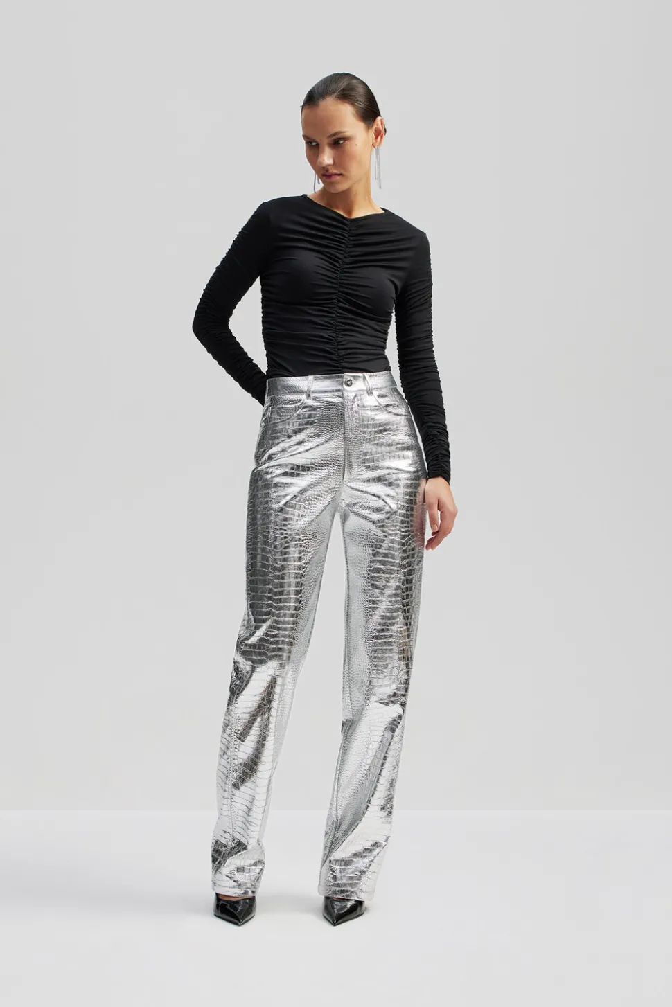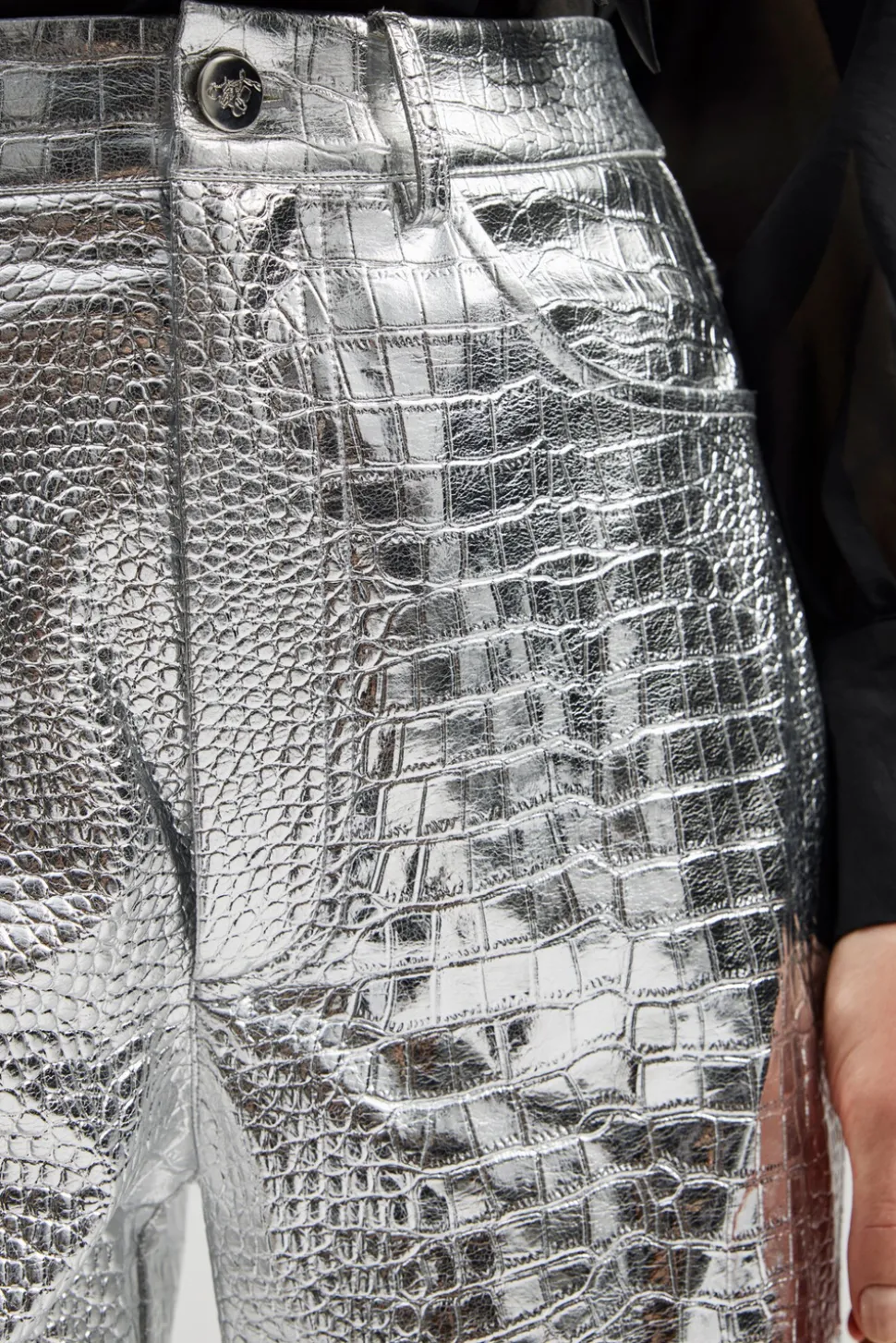Högmidjade och silvriga, metalliska byxor i crocomönster med raka ben.