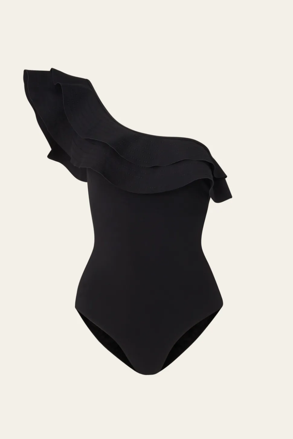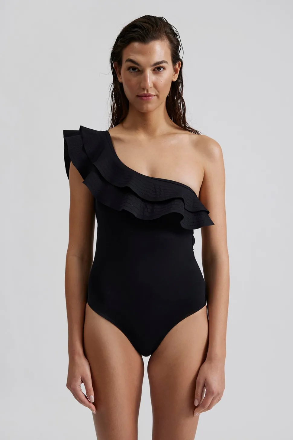 Enaxlad baddräkt med volangdetaljer och utskärning i ryggen