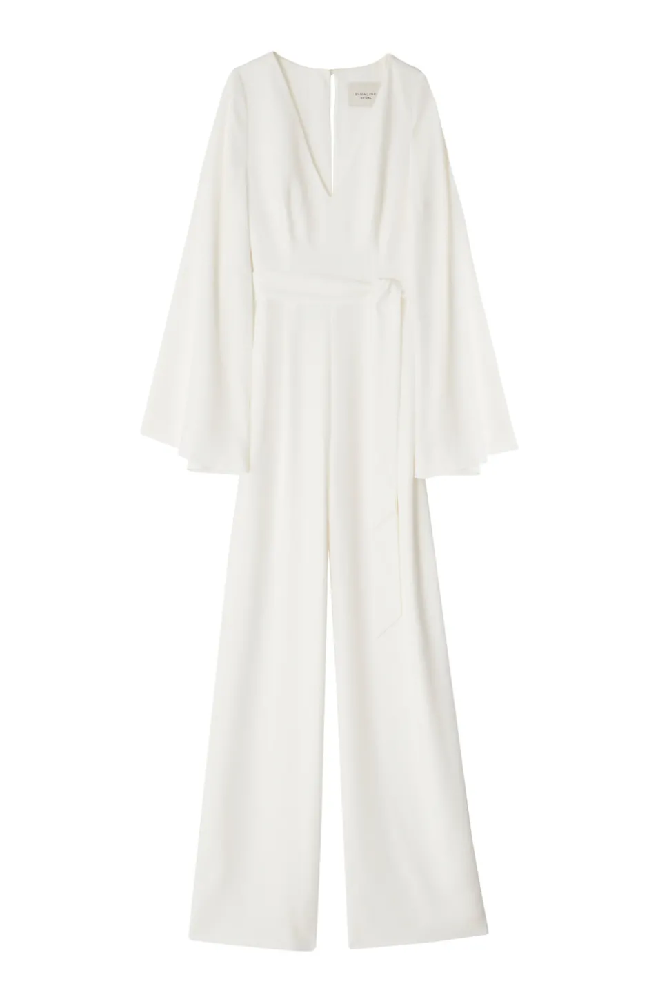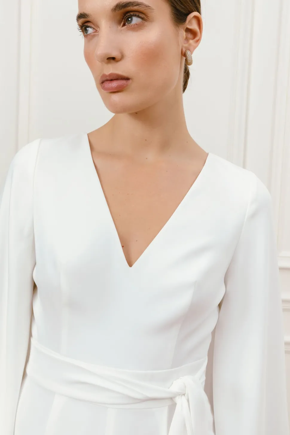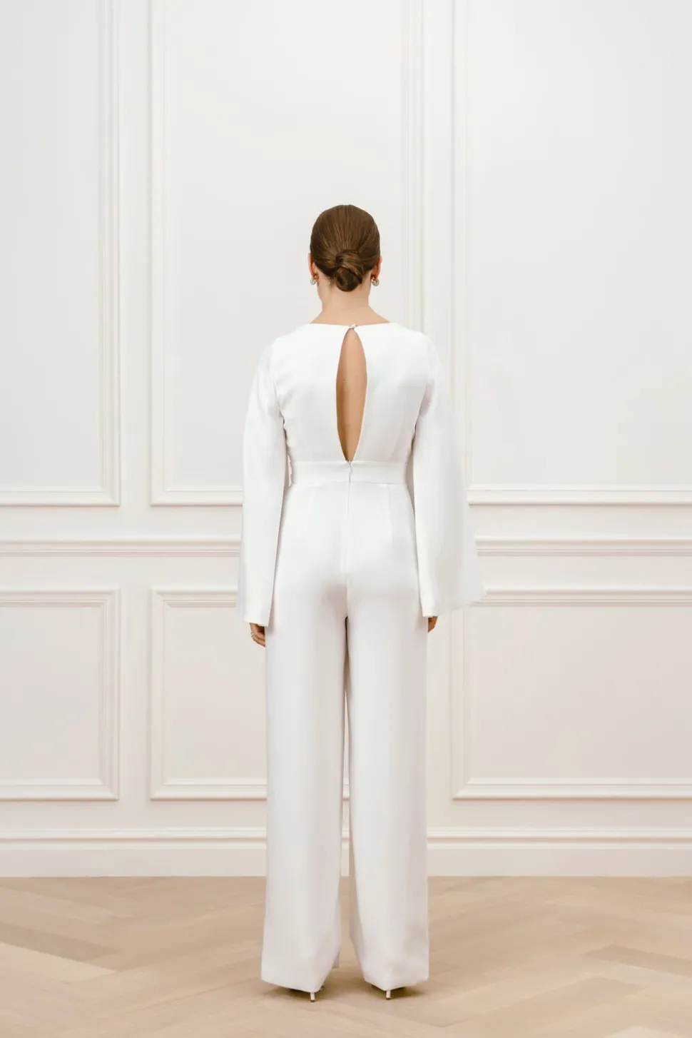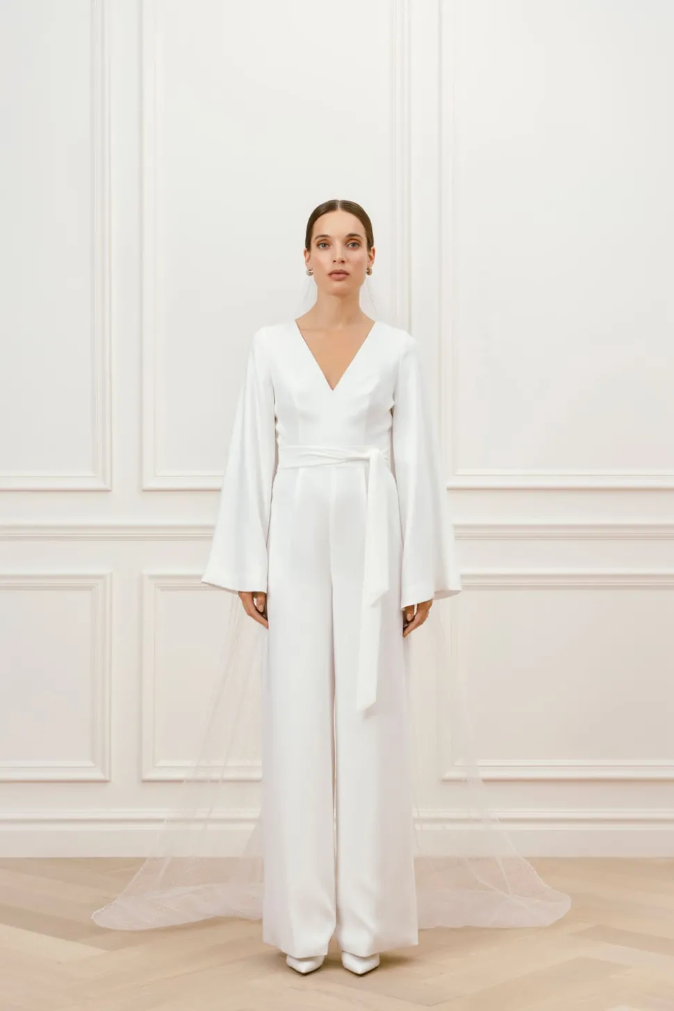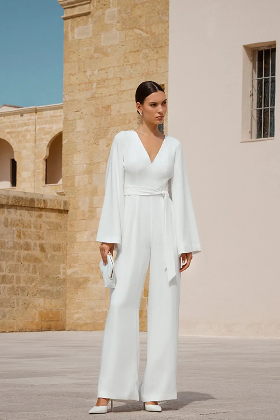 Jumpsuit med V-ringning, långa vida ärmar och midjeband.