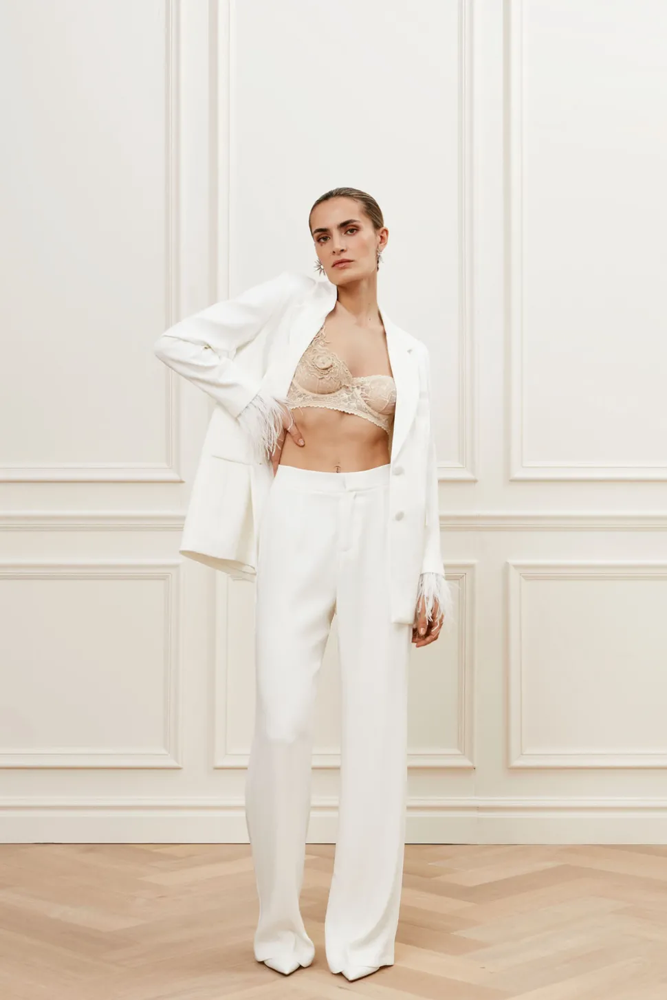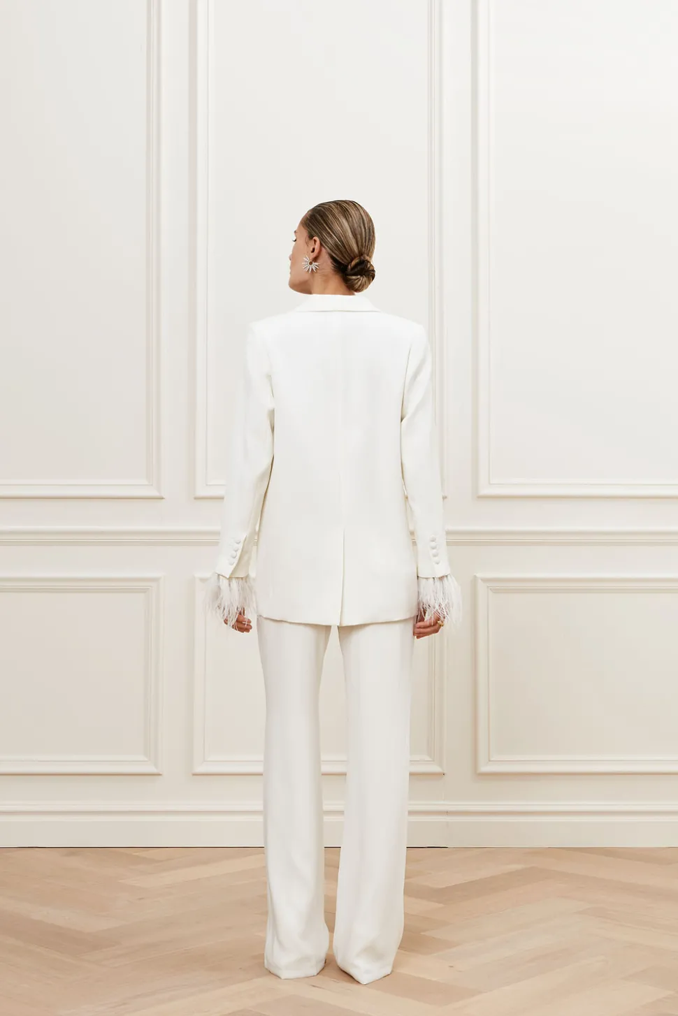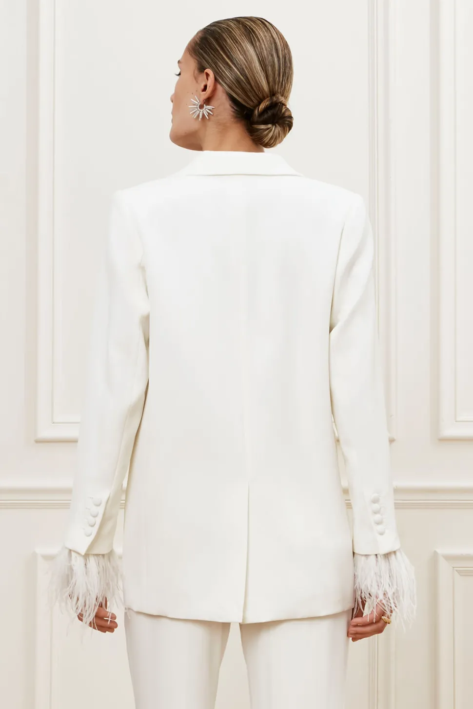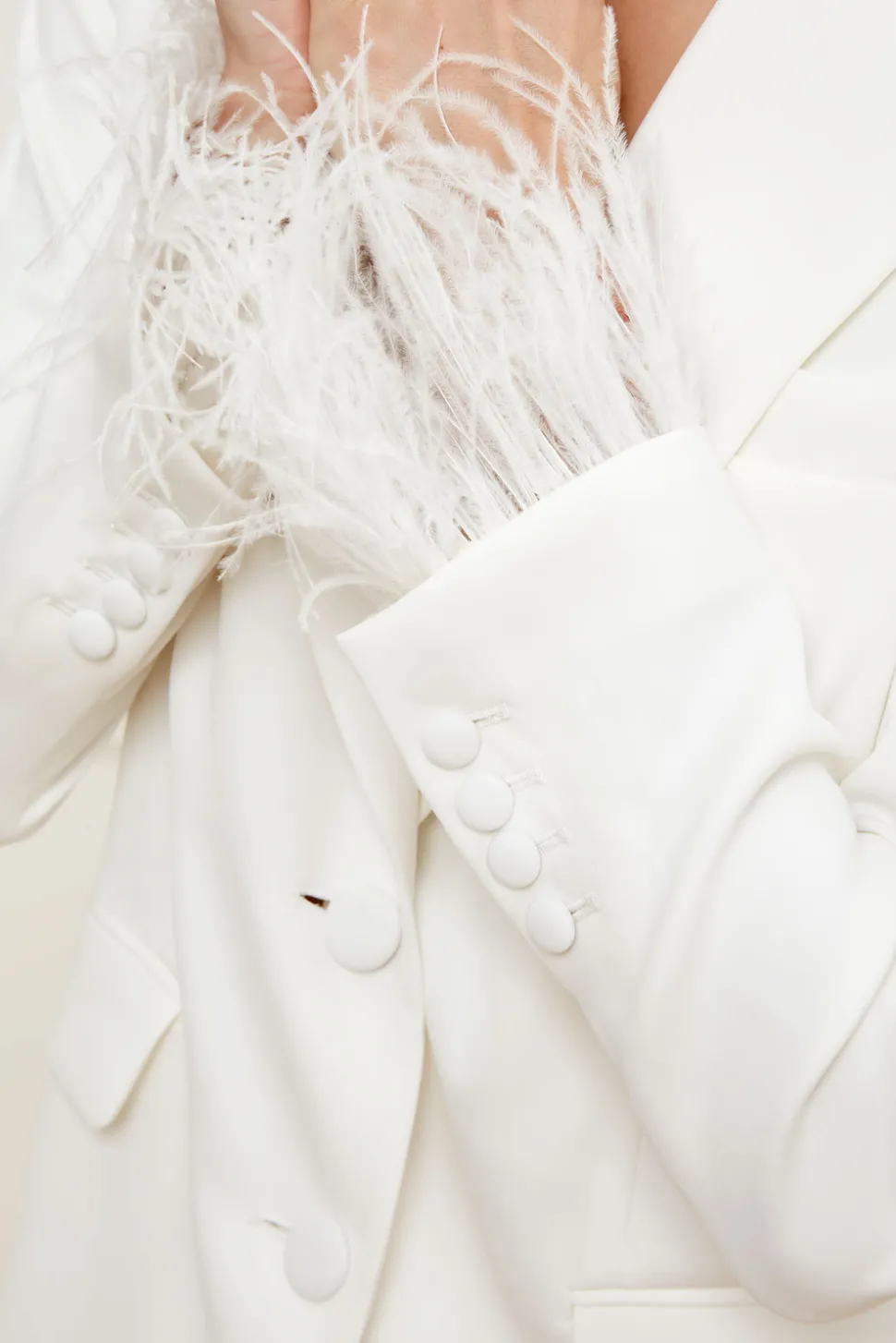 Blazer med fjäderdetaljer på ärmarna som är avtagbara. Matcha med byxor eller som cover-up till klänningen.
