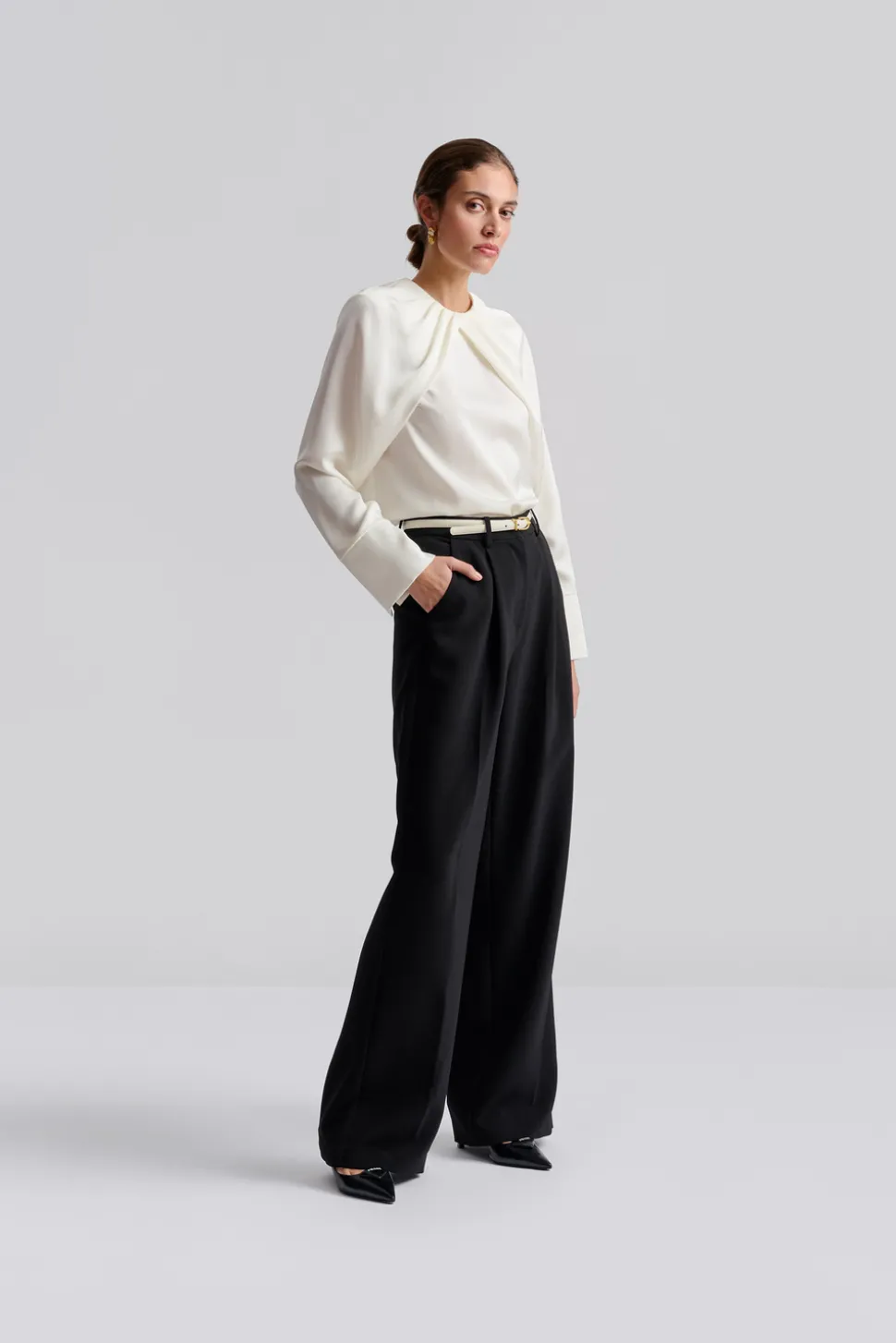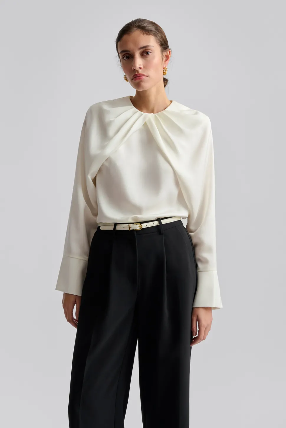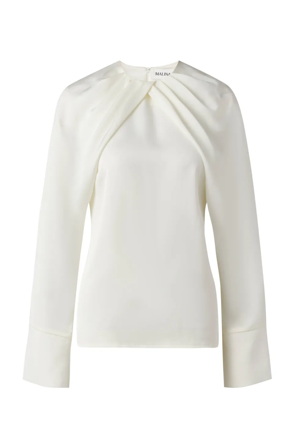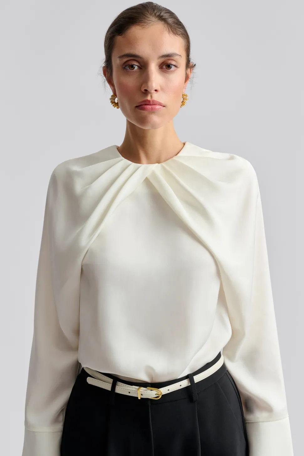Blus i lös passform med veckad halsringning och långa ärmar.