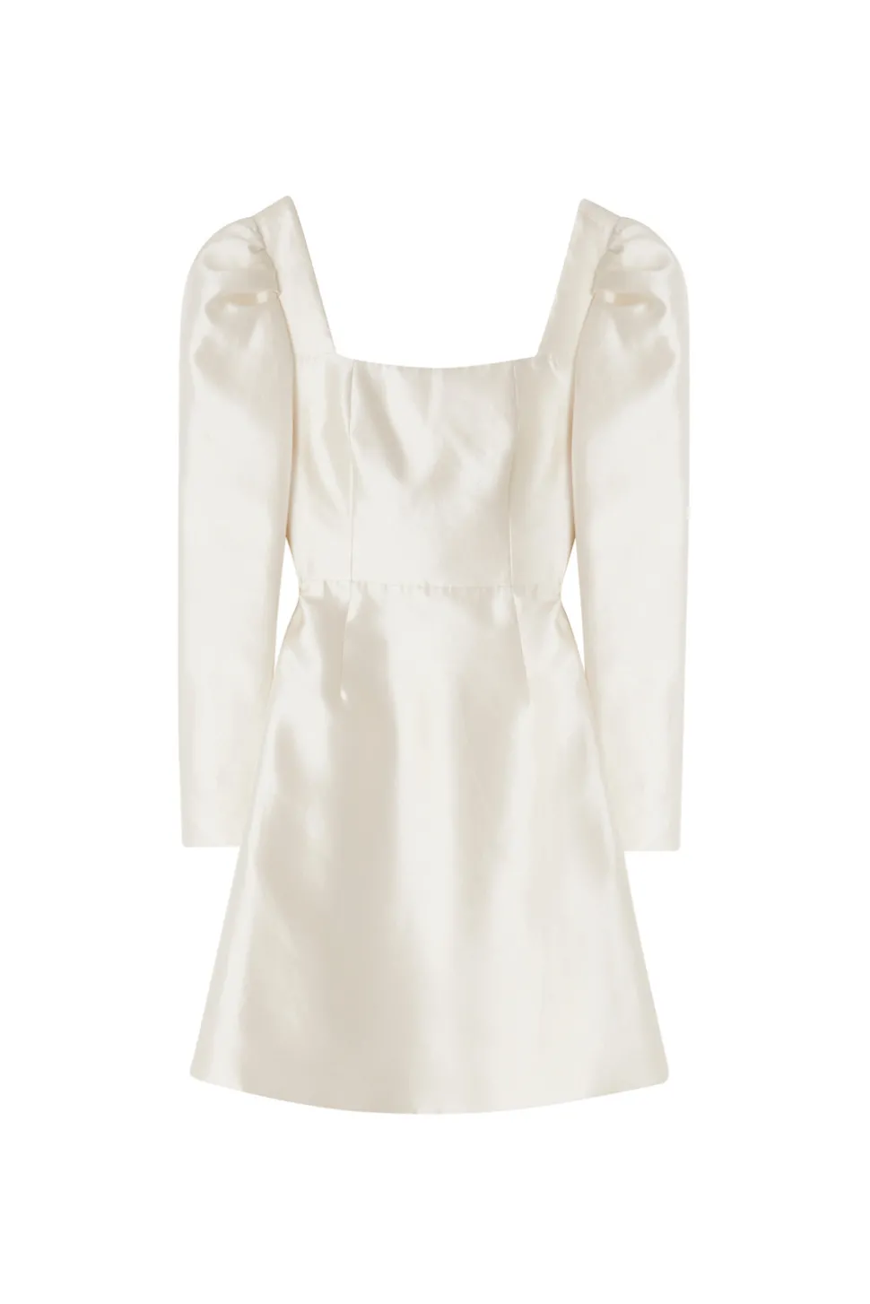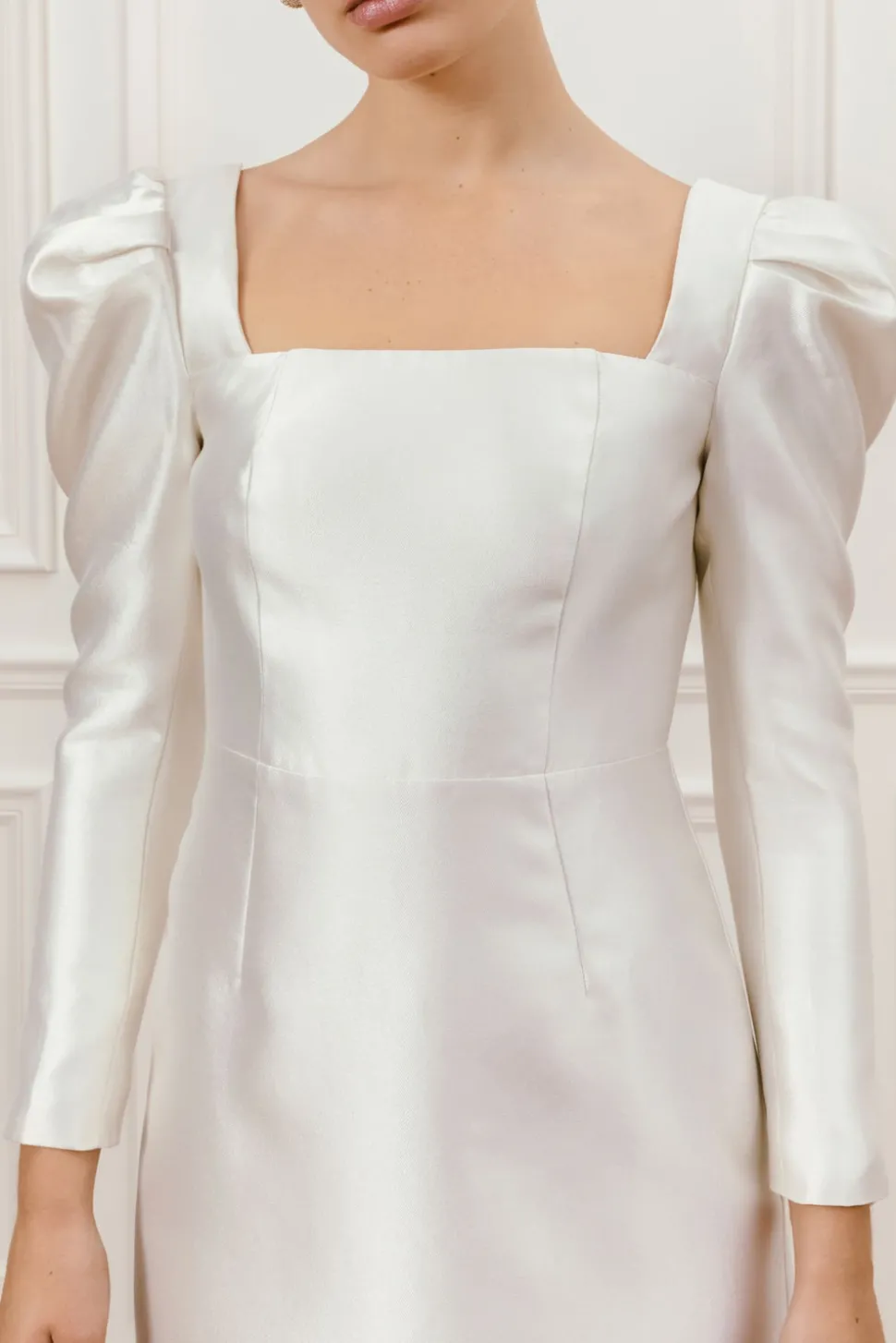 Bröllopsklänning med fyrkanting ringning och öppen rygg. Långa ärmar med puff och markerad midja för en smickrande siluett.