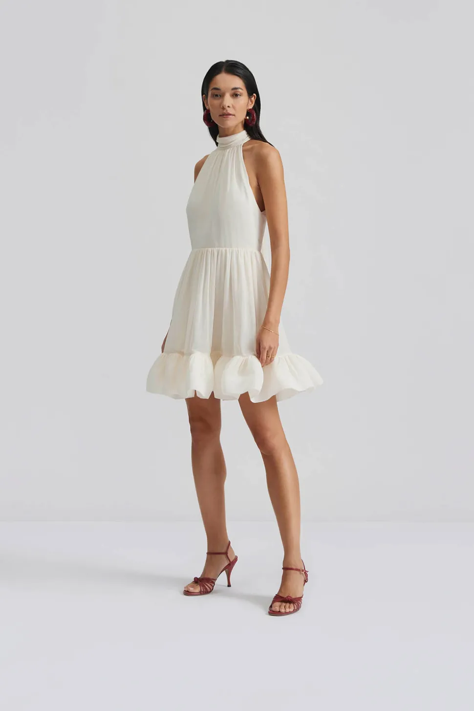 Halterneck miniklänning med öppen rygg, volangkjol och markerad midja som knyts i nacken.