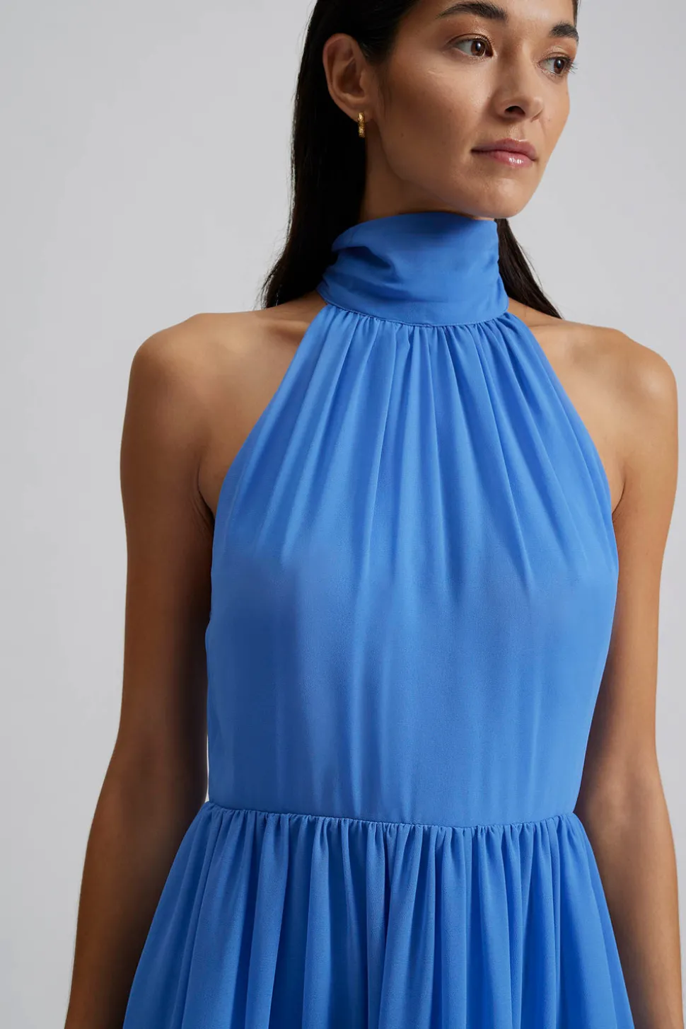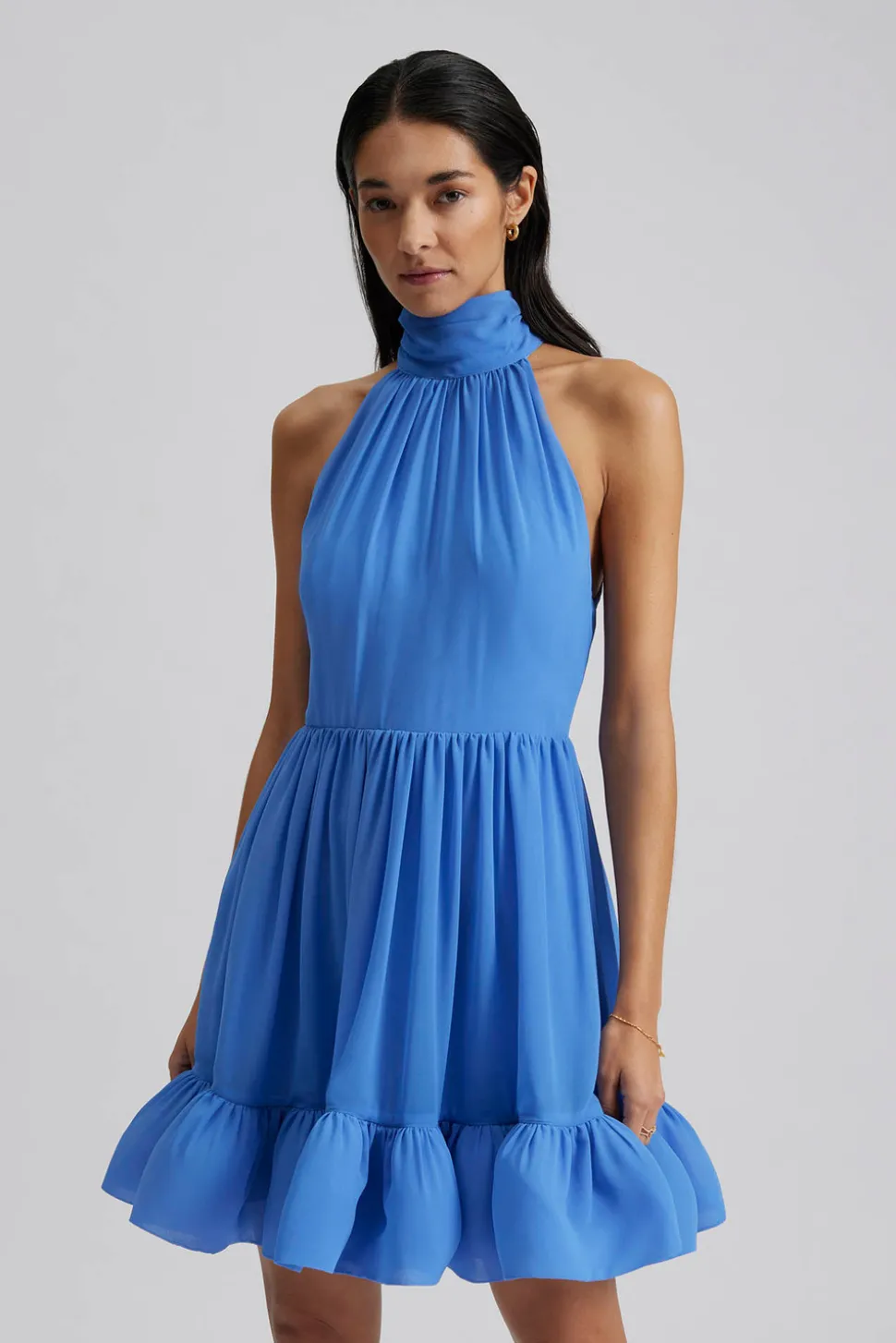 Halterneck miniklänning med öppen rygg, volangkjol och markerad midja som knyts i nacken.