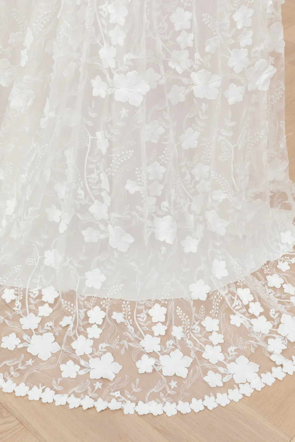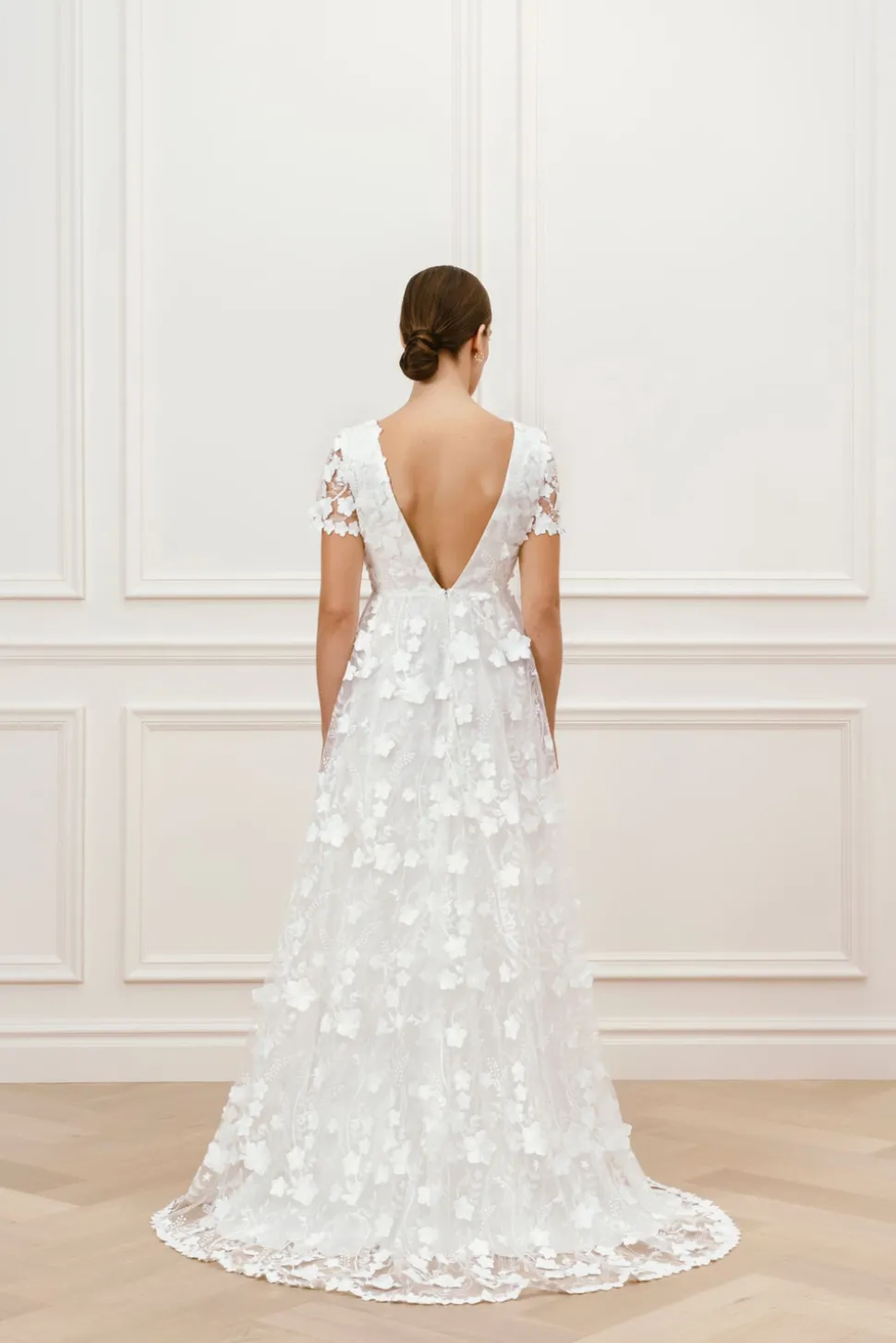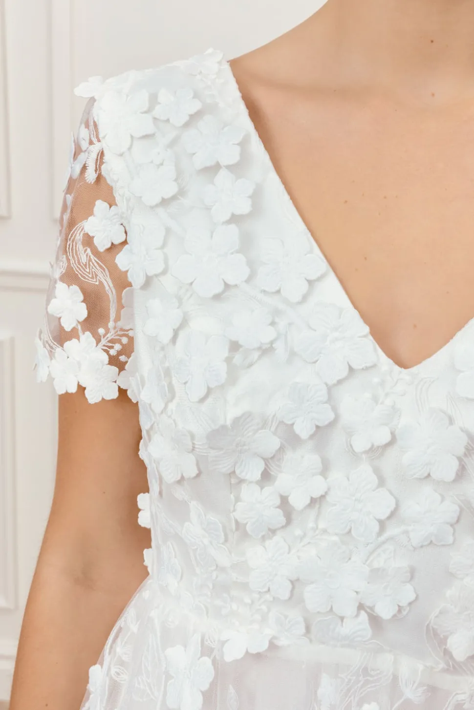 Bröllopsklänning med A-linjeformad tyllkjol dekorerad med 3D-blommor, V-ringning och korta ärmar. Klänningen har en djupt öppen rygg och kanterna på klänningen är dekorerade med fina blommor.