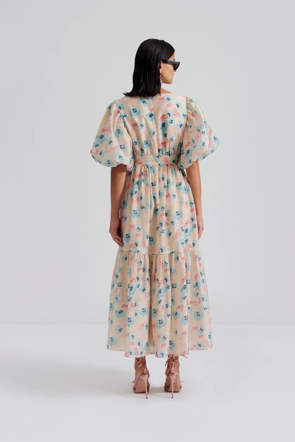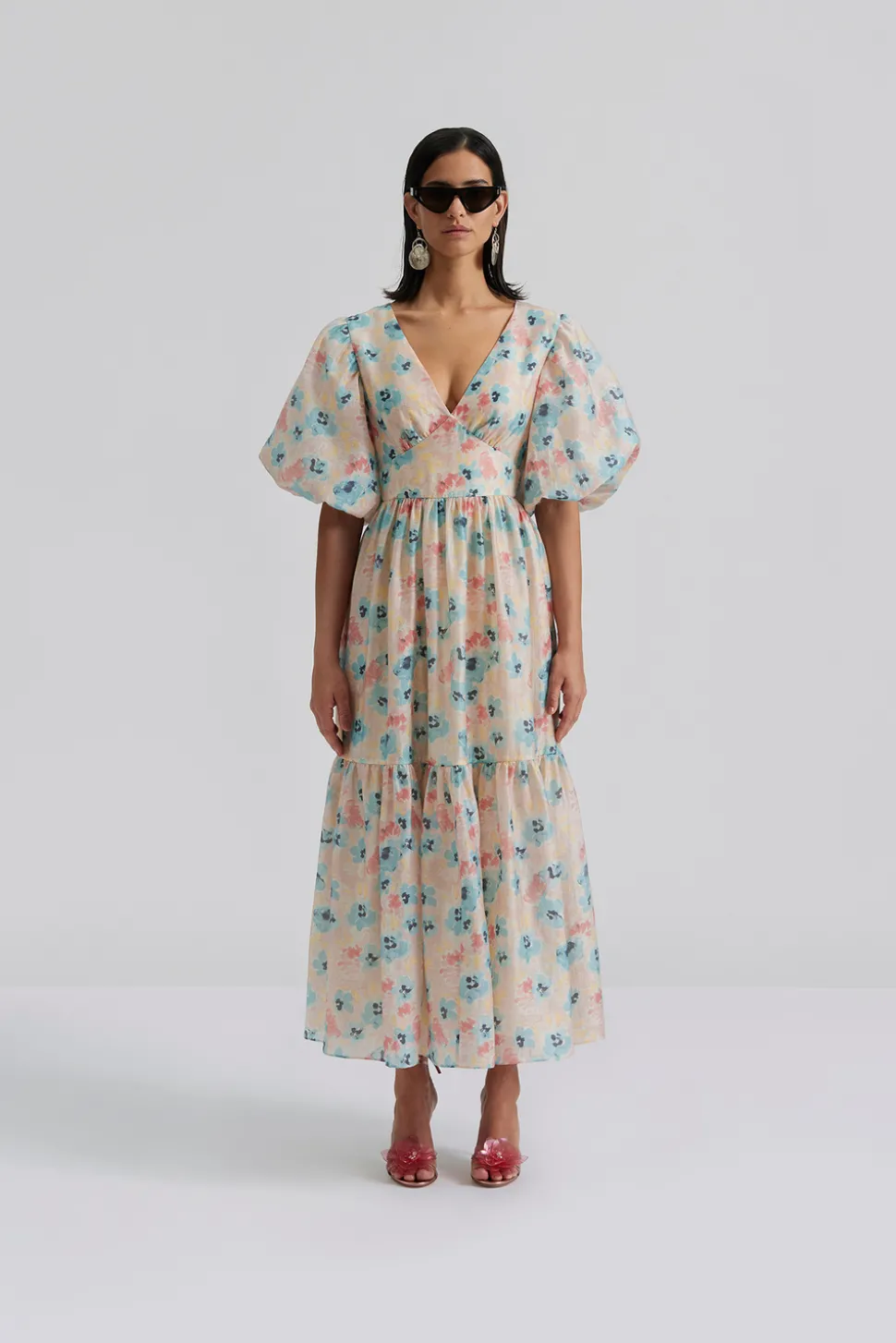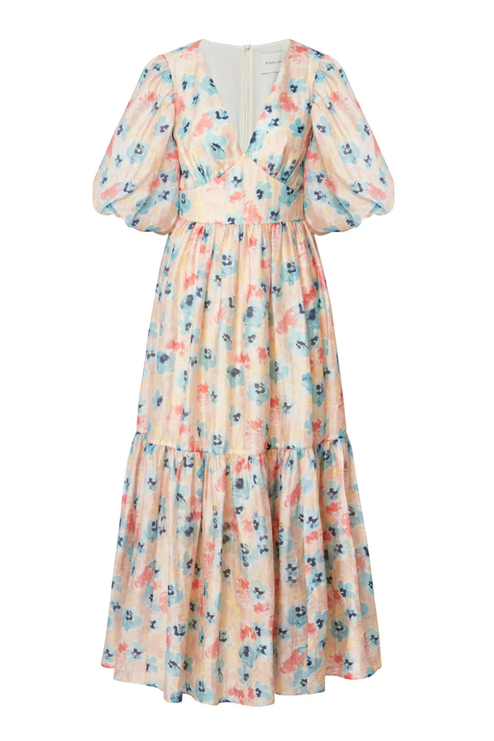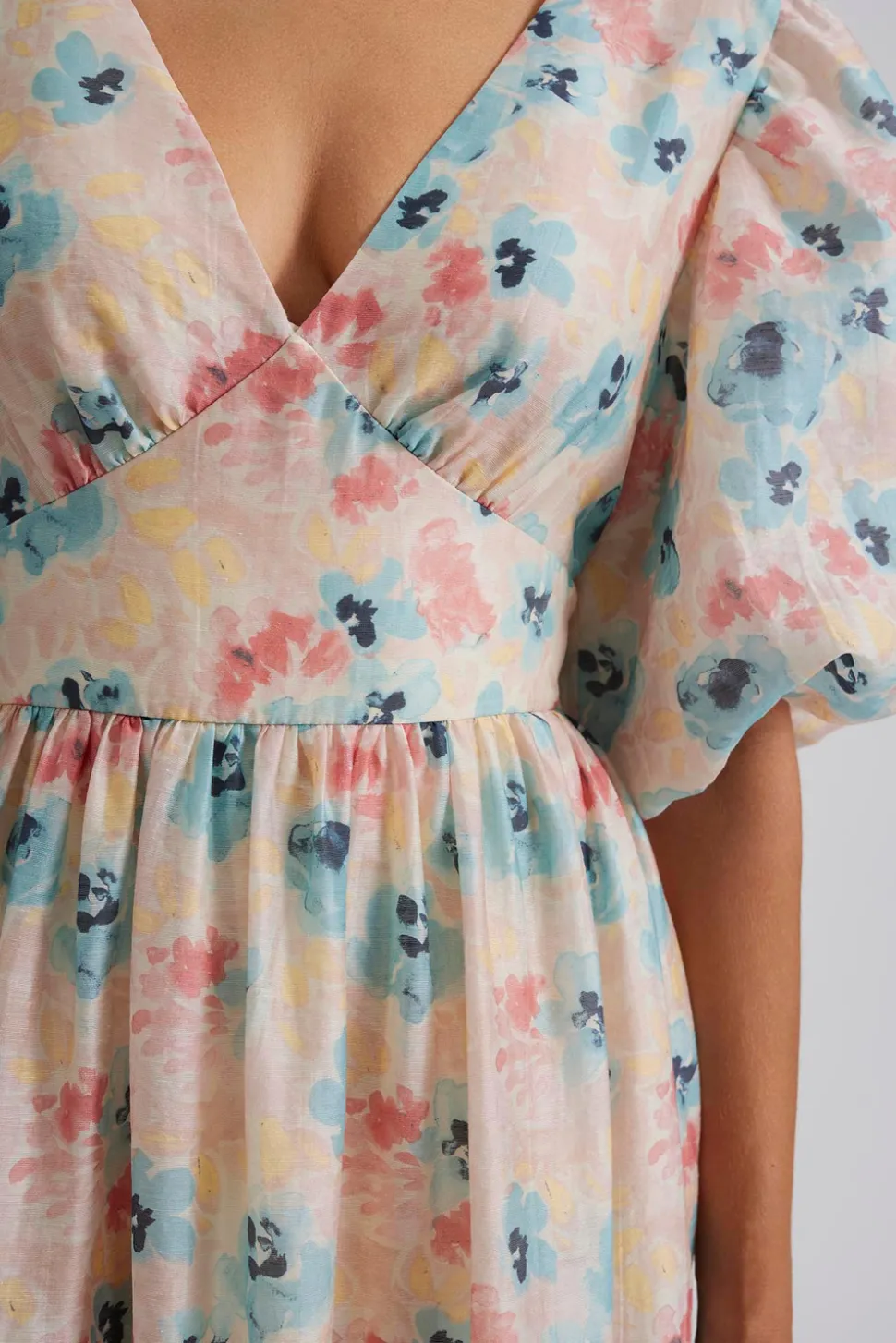 Mönstrad midiklänning i siden med v-ringning och puffärm.