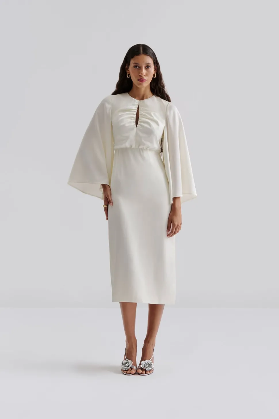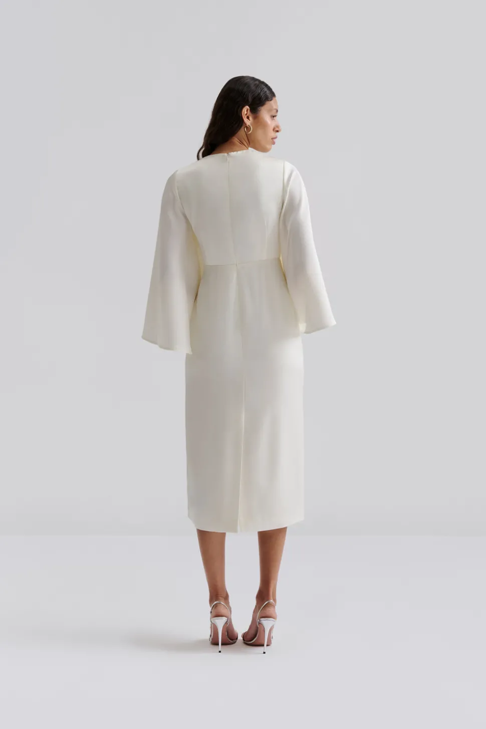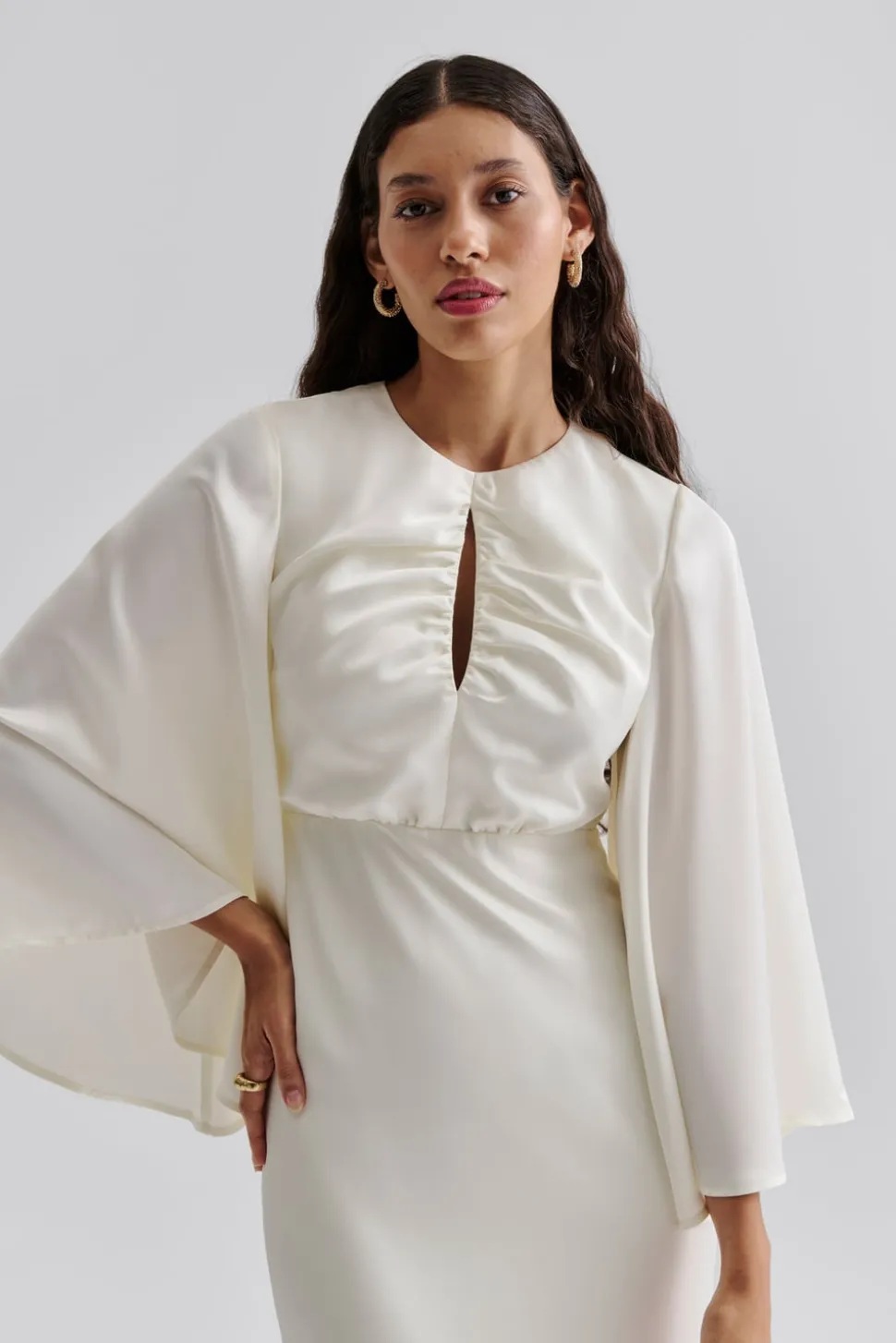 Satinbrudklänning i midilängd med långa vida ärmar och cut-out detalj över bröstet.