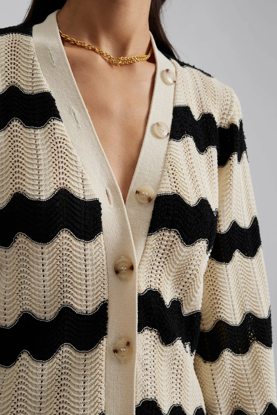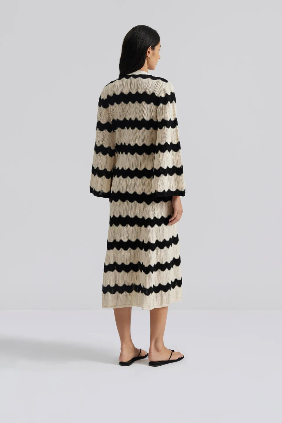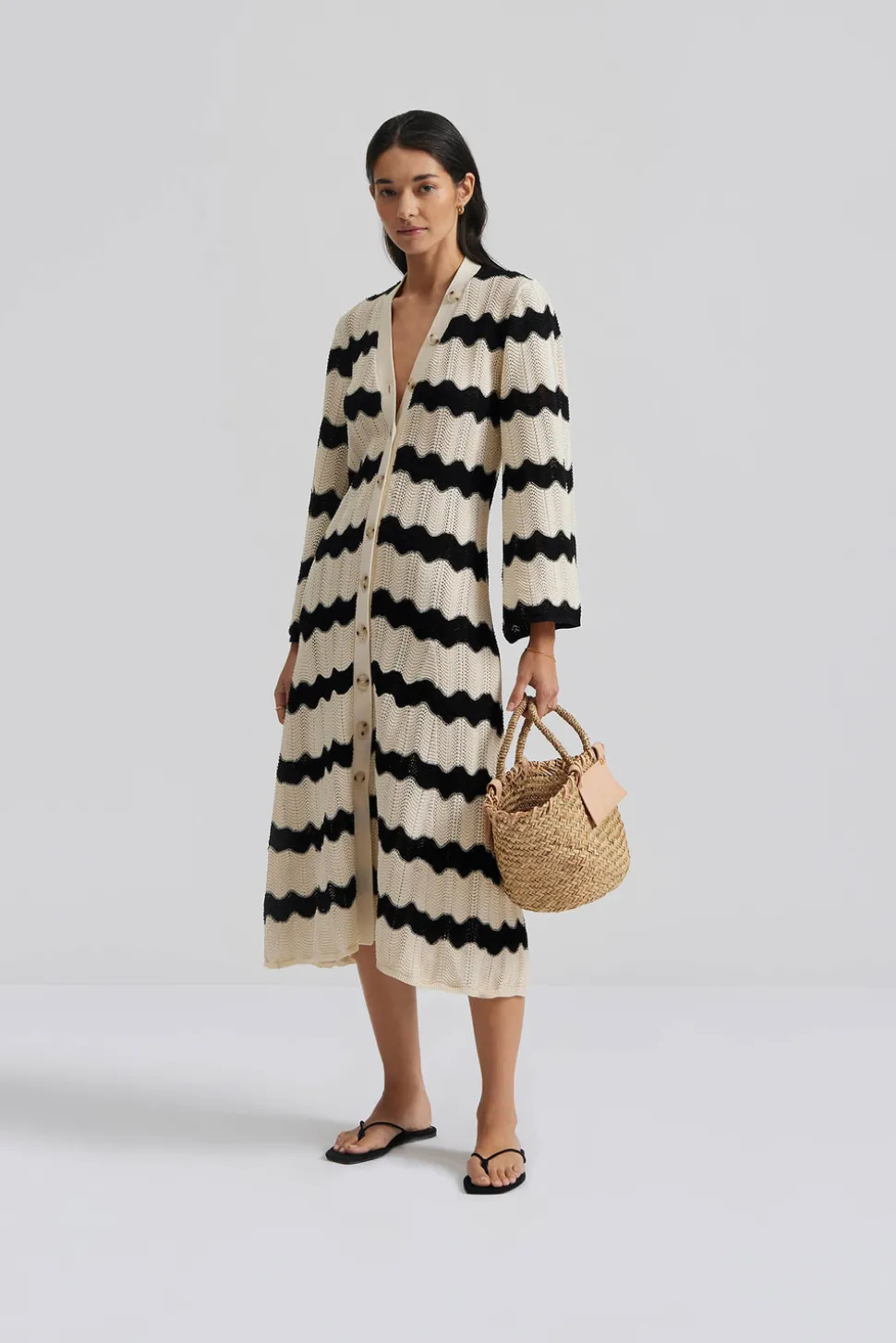 Stickad midiklänning med lång vid ärm och vågig kant.