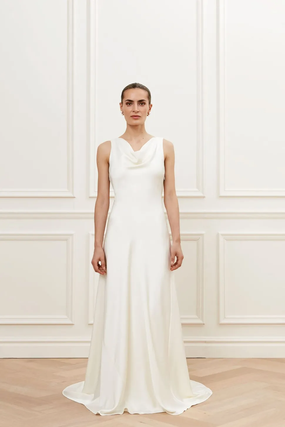 A-linjeformad bröllopsklänning i satin med draperad halsringning både fram och bak.