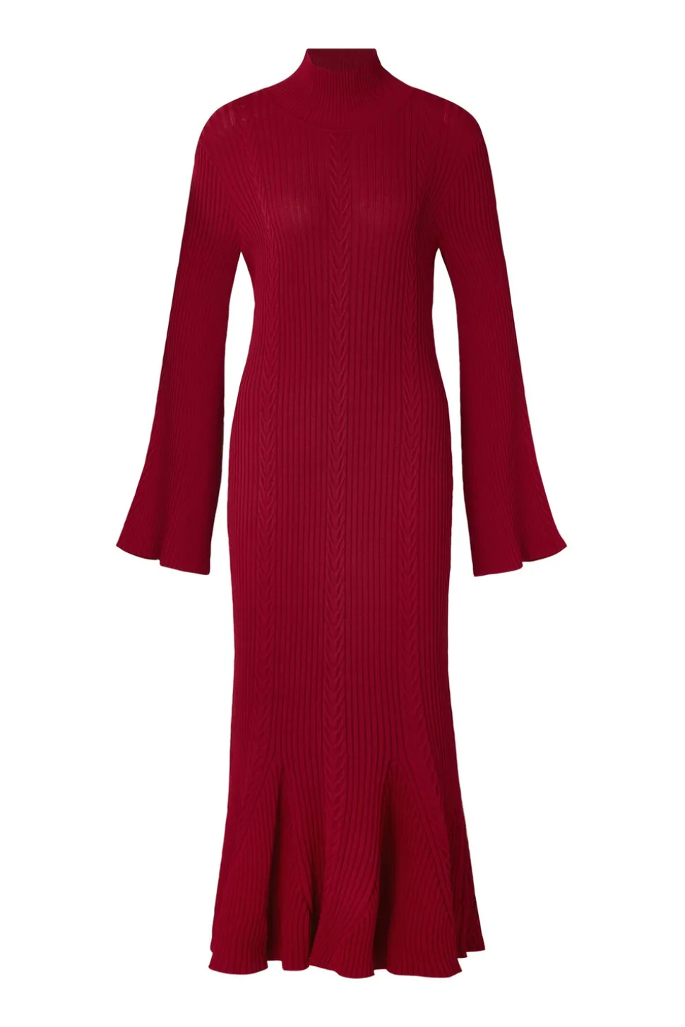 Kabelstickad maxiklänning med polo krage och långa vida ärmar.