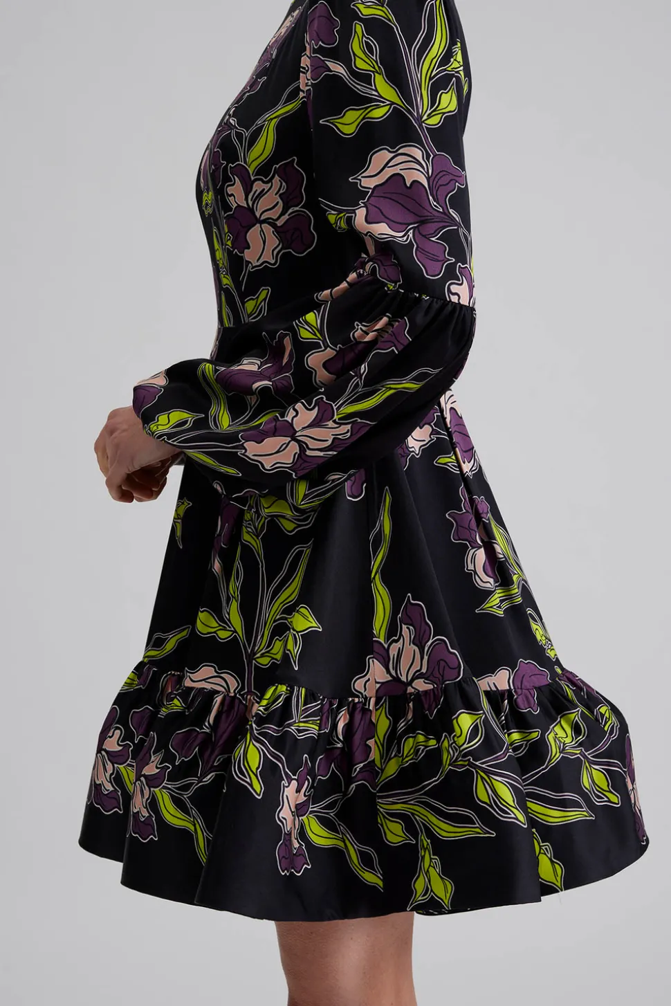 Miniklänning med långa ballongärmar och volangdetaljer.
