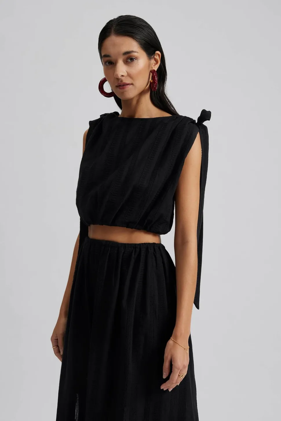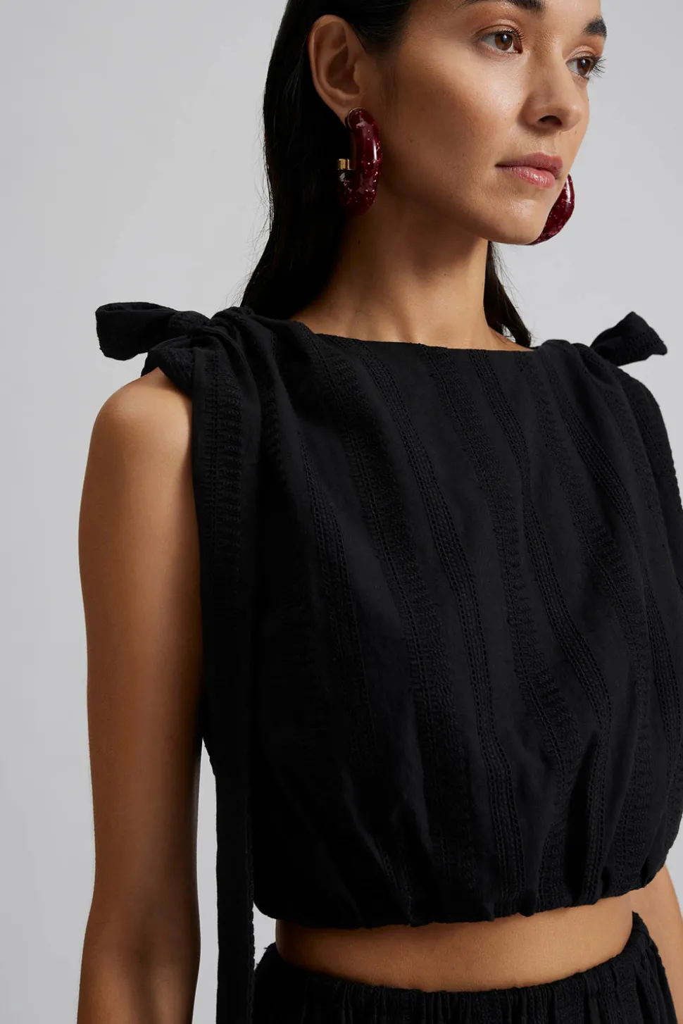 Broderad croppad topp med rynk- och snörningsdetaljer på axlarna.