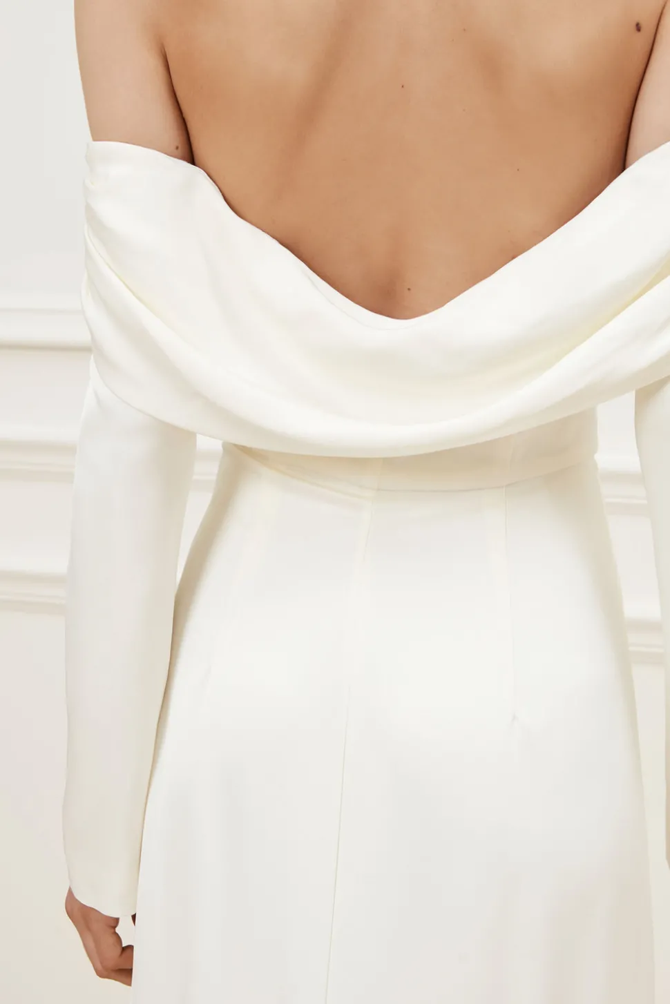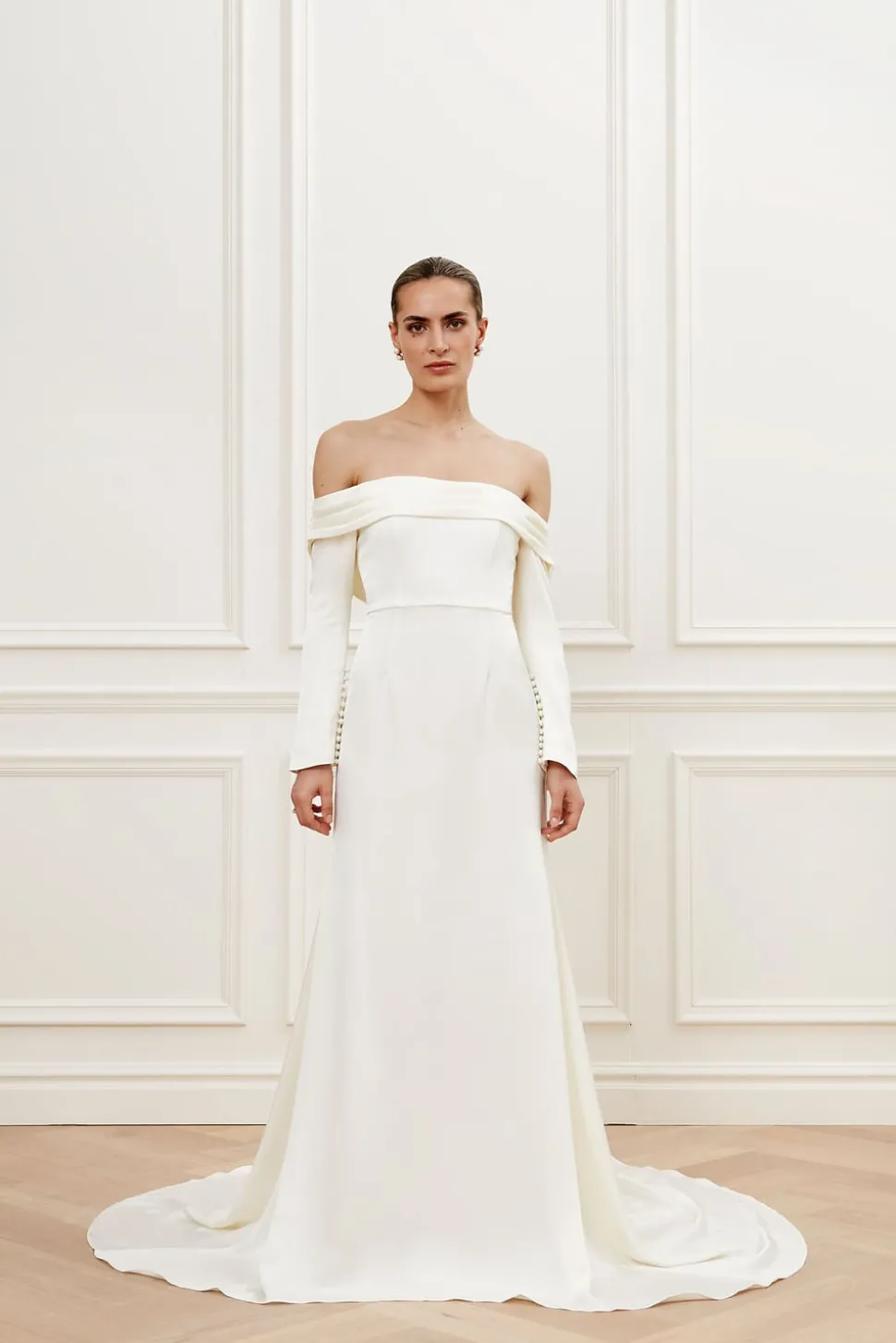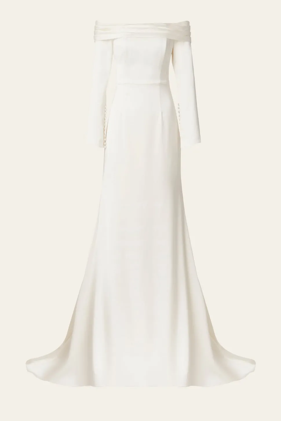 Långärmad off shoulder-klänning med drapering. En satinklänning med ärmar, klädda knappar och a-linjeformad siluett