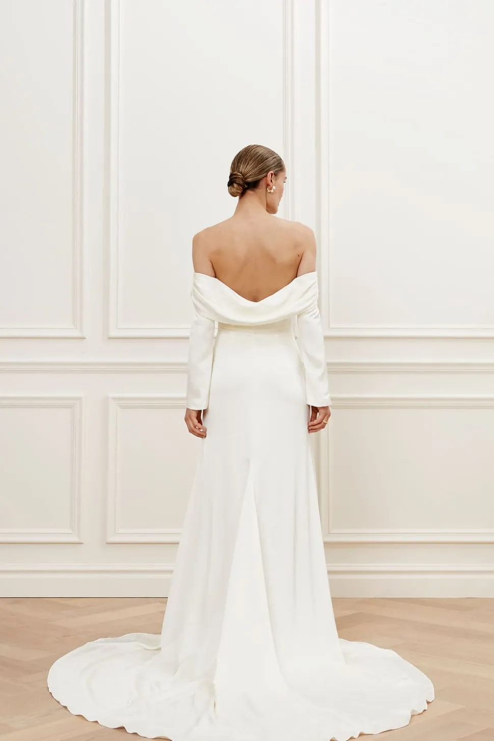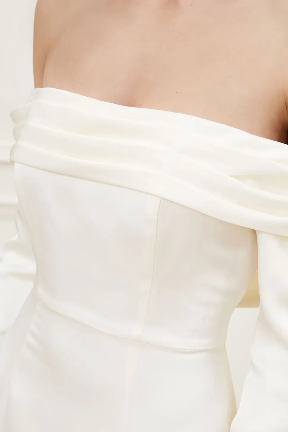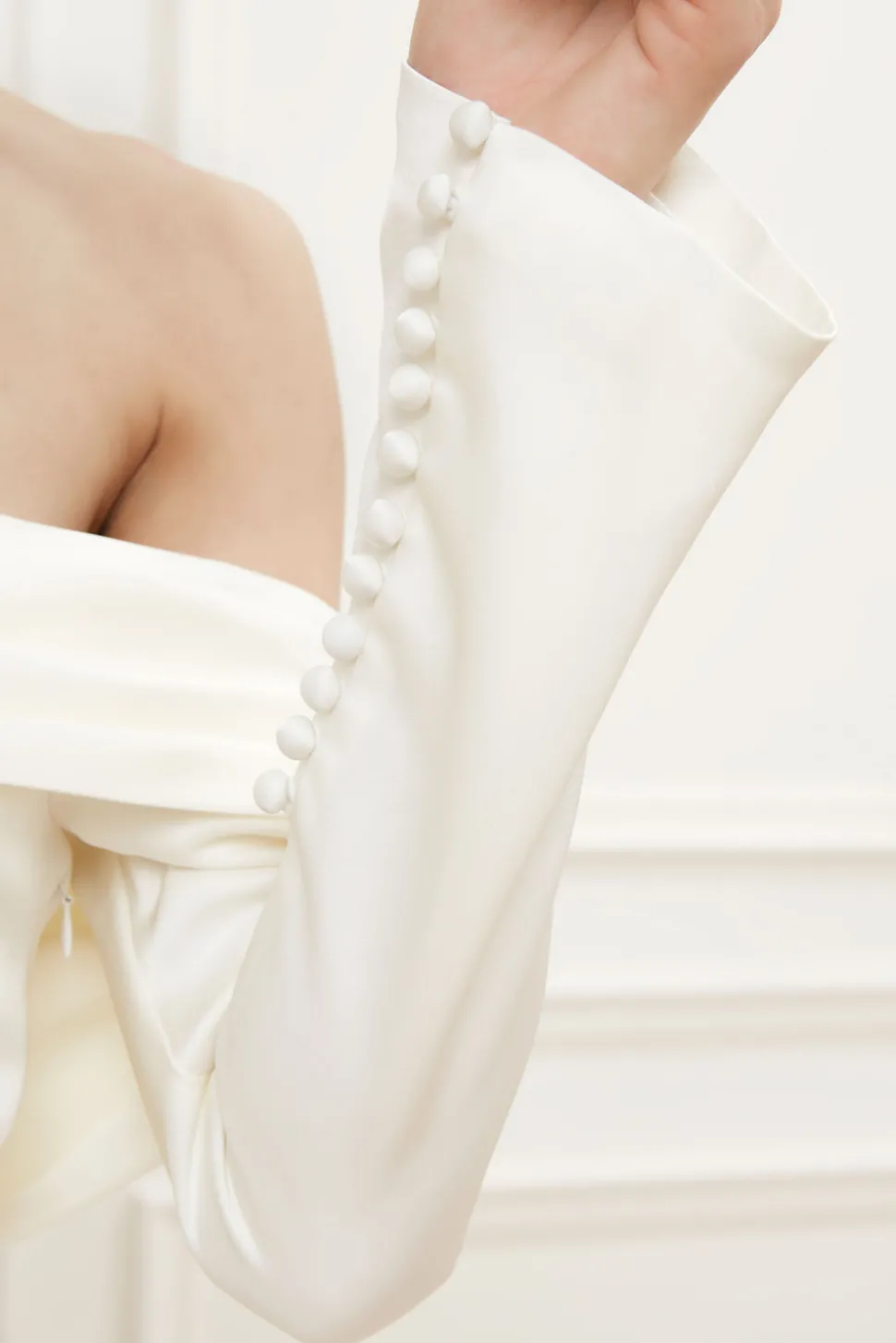 Långärmad off shoulder-klänning med drapering. En satinklänning med ärmar, klädda knappar och a-linjeformad siluett