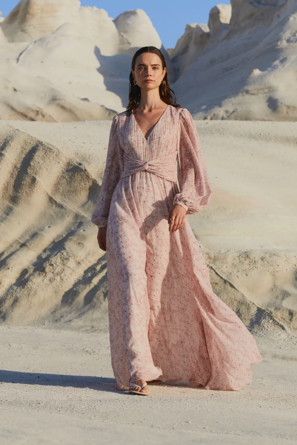 Blommig maxiklänning med v-ringning, ballongärm och detaljerad midja.