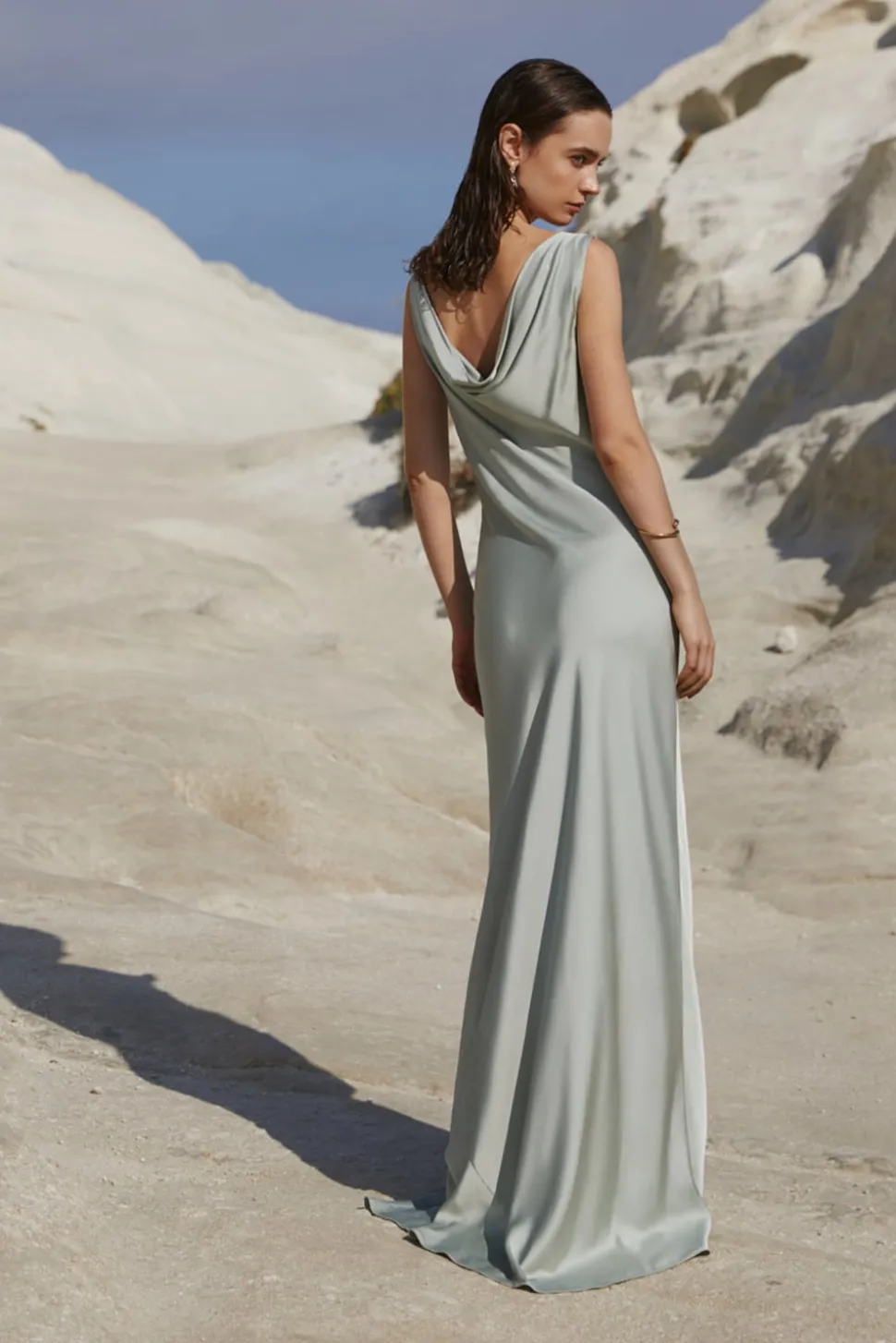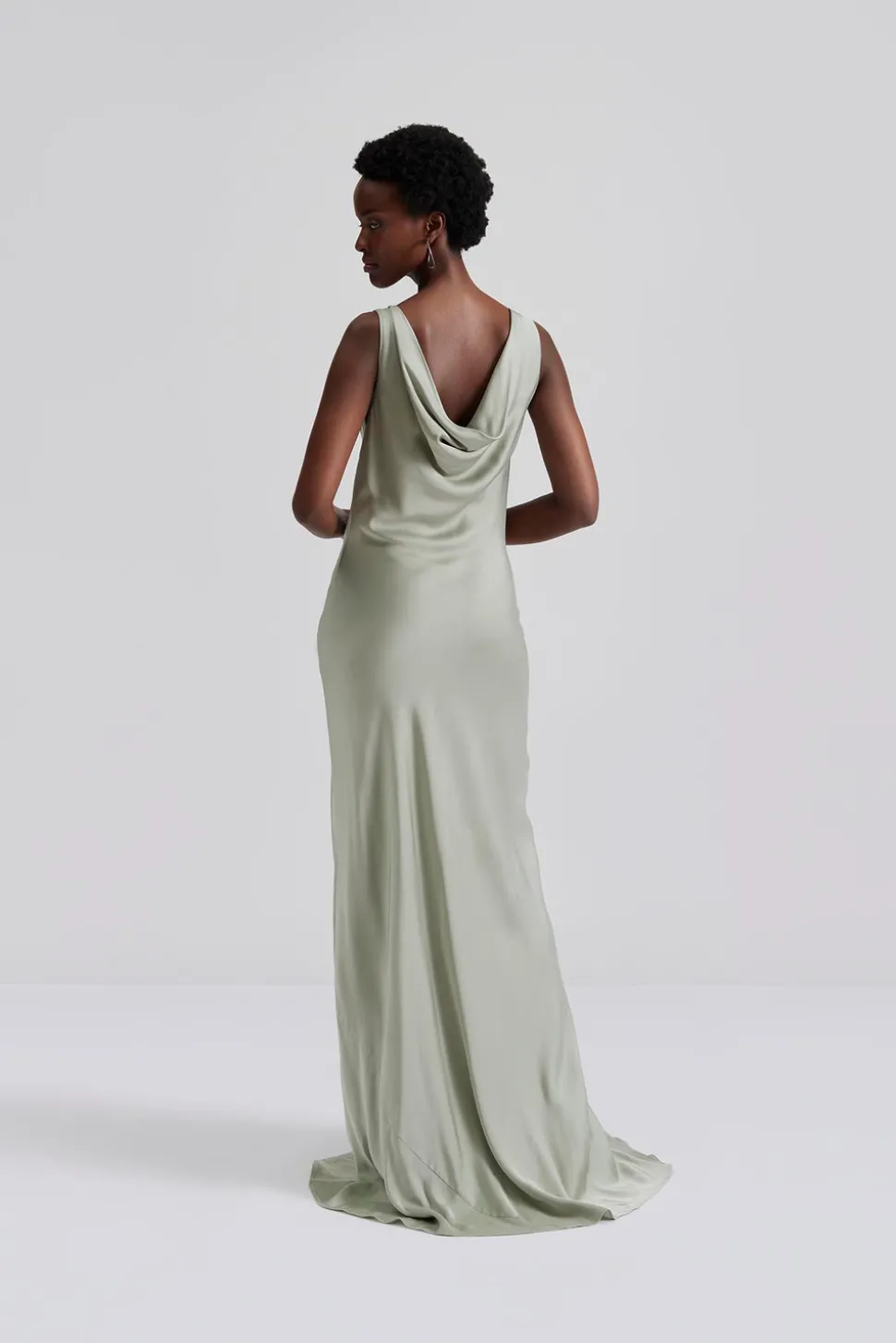 Ärmlös maxiklänning i satin med en draperad halsringning.