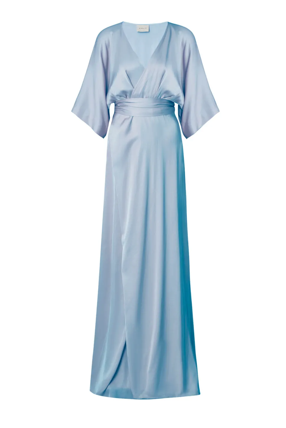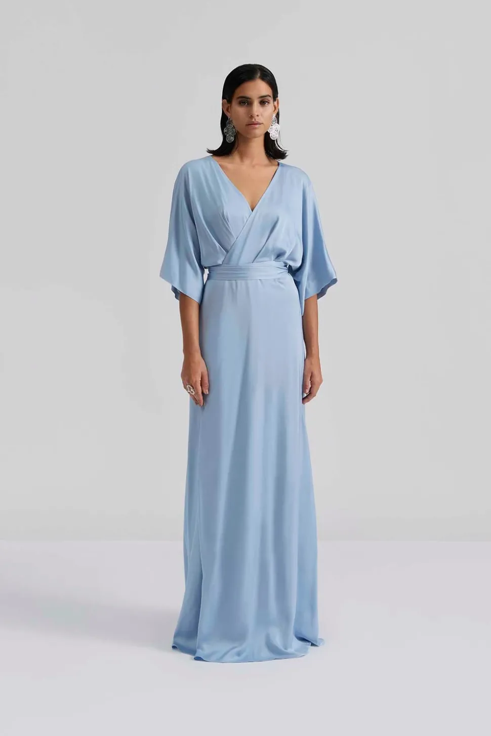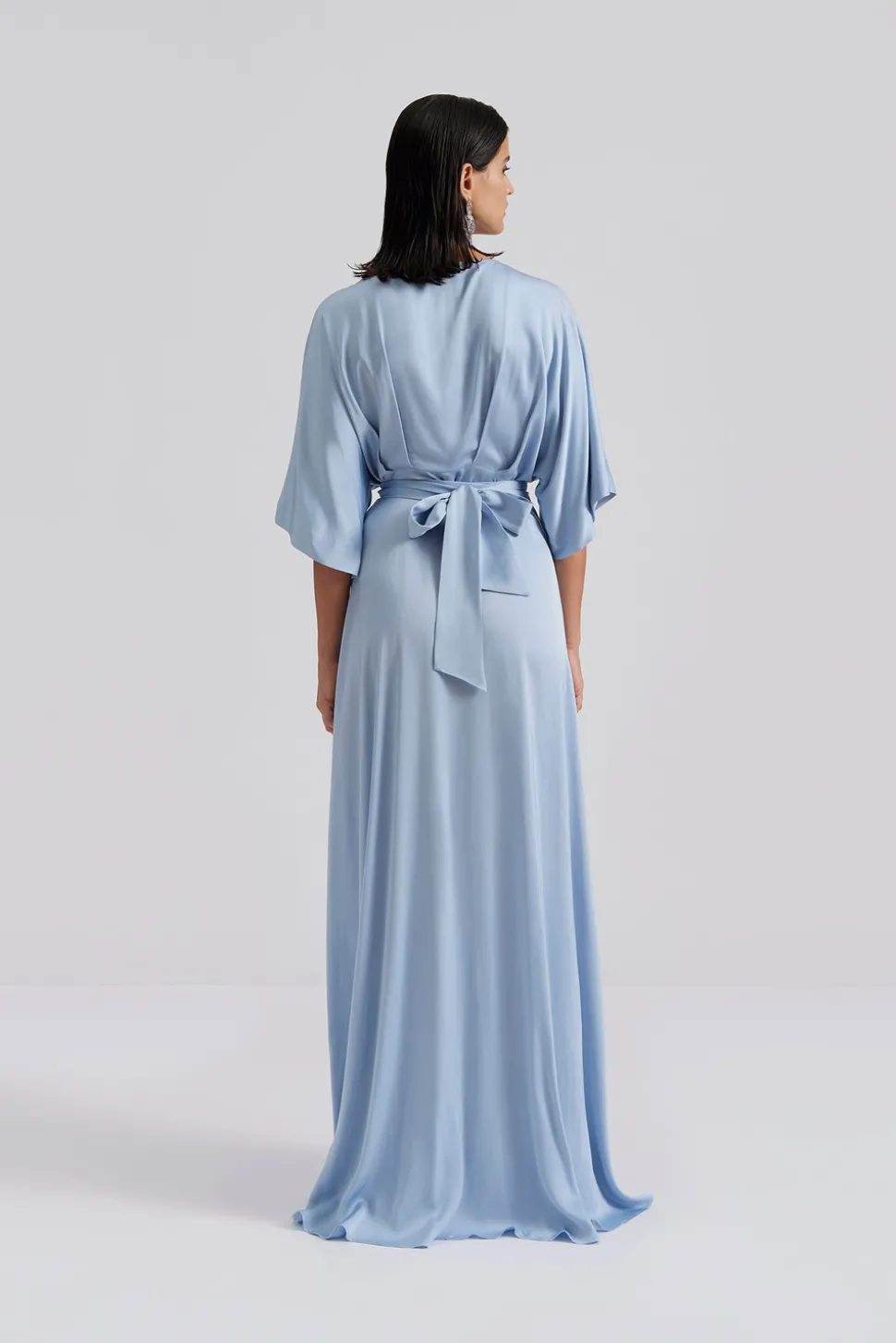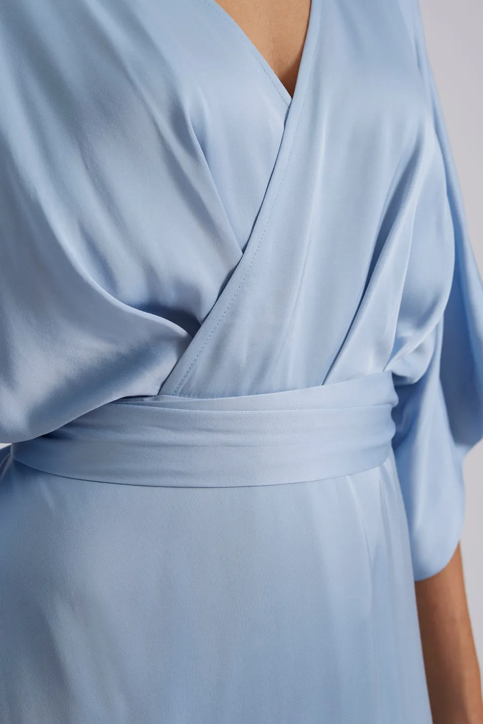 Maxiklänning i satin med omlottdesign, vid ärm och en figursydd midja.