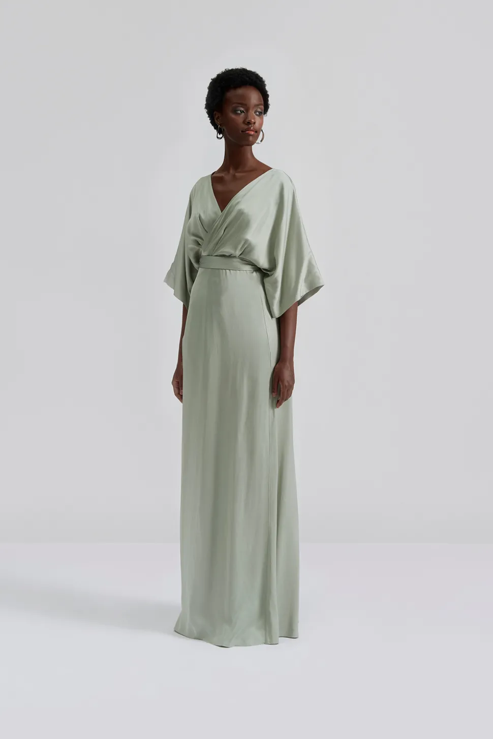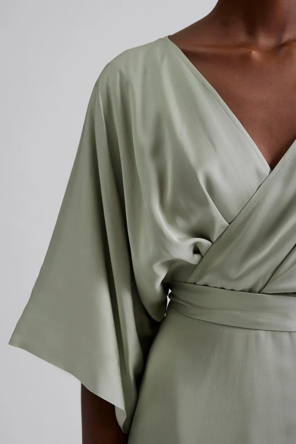 Maxiklänning i satin med omlottdesign, vid ärm och en figursydd midja.