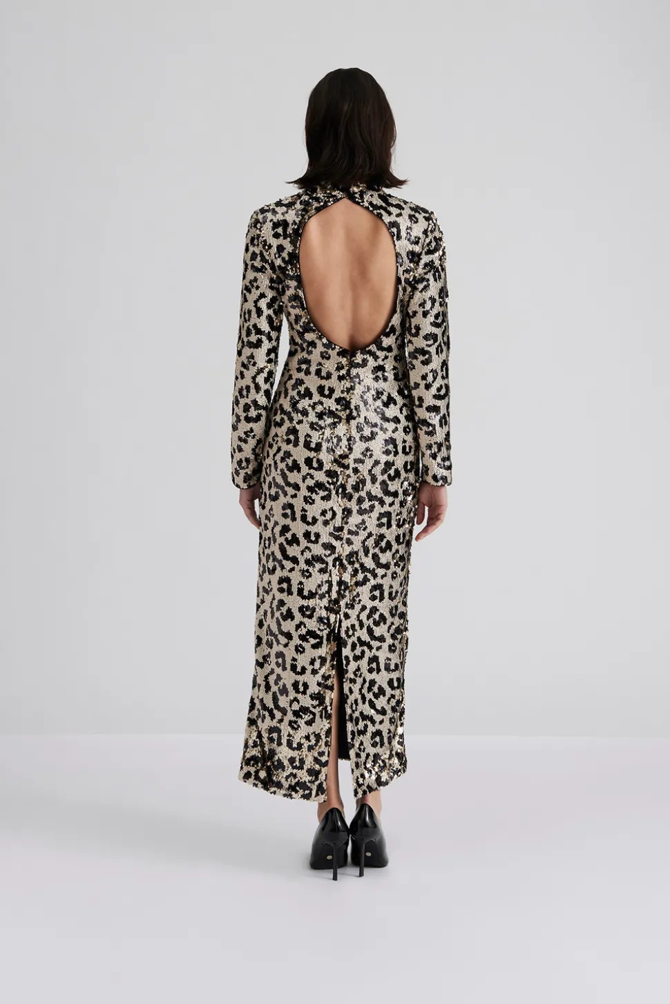 Maxiklänning i paljett med öppen rygg, långa ärmar och slits bak.