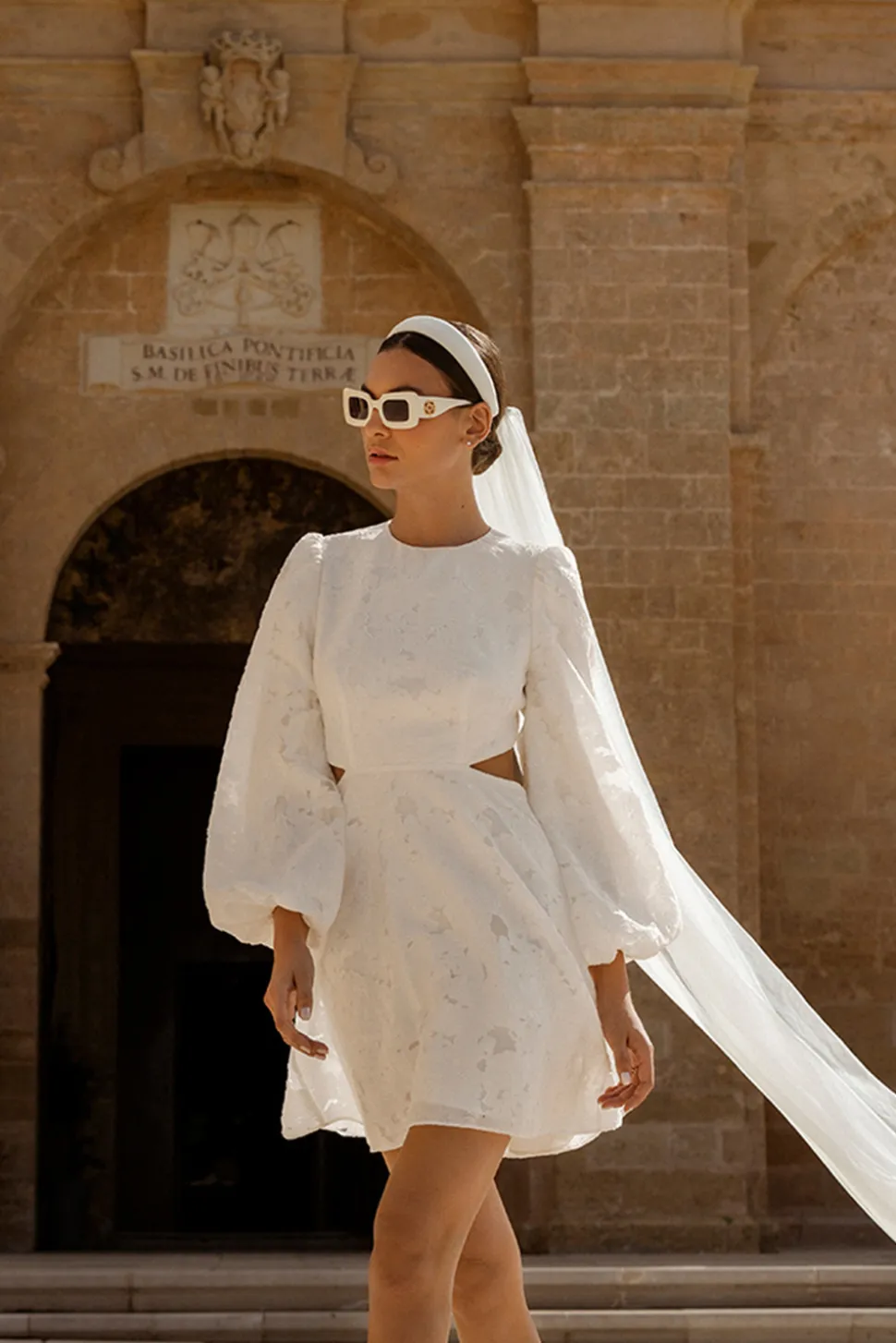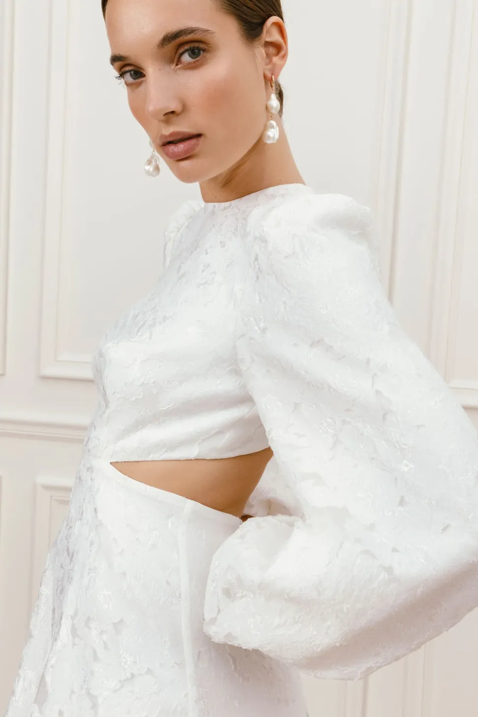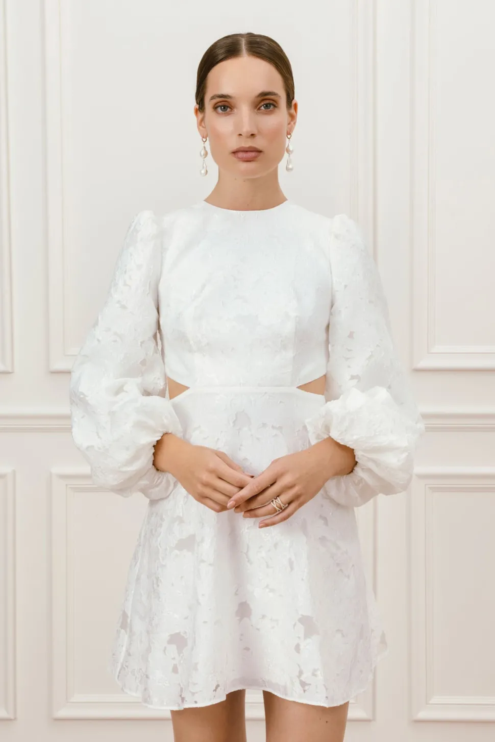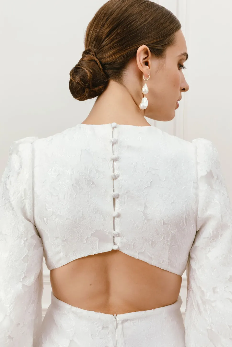 Kort bröllopsklänning med stora ballongärmar och en utskuren detalj i ryggen. Ryggen har dekorerats med klädda knappar.