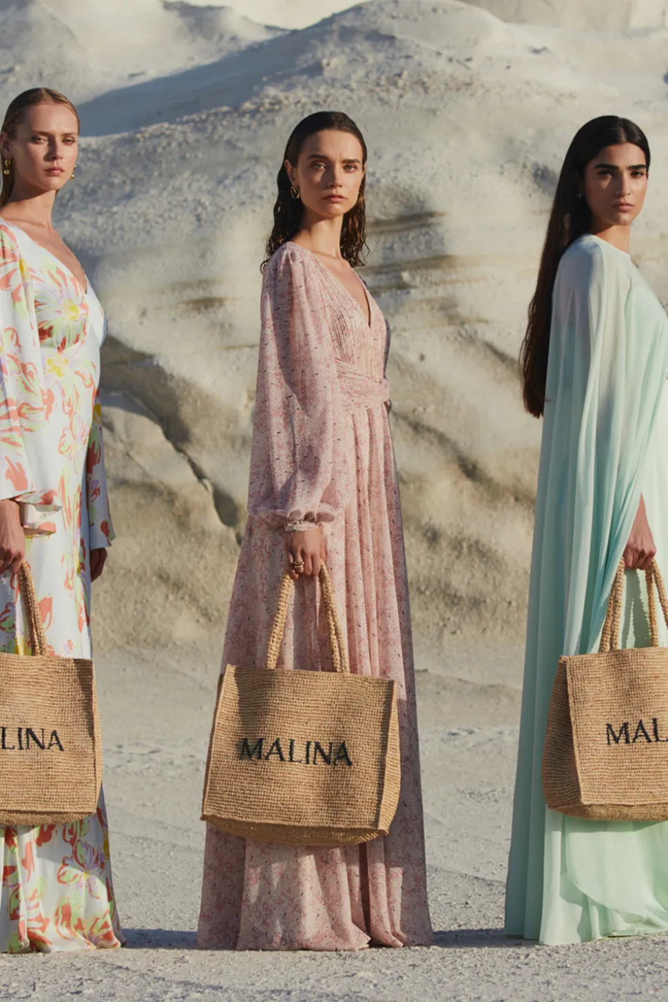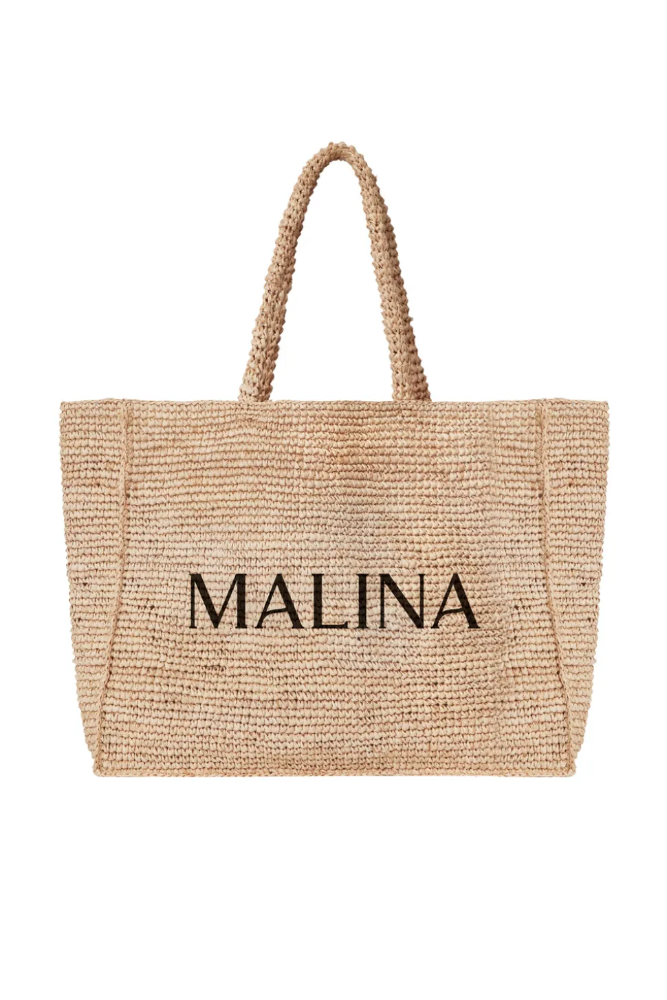 Handgjord stråväska med Malina-logotyp.