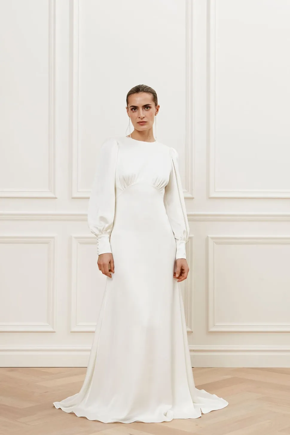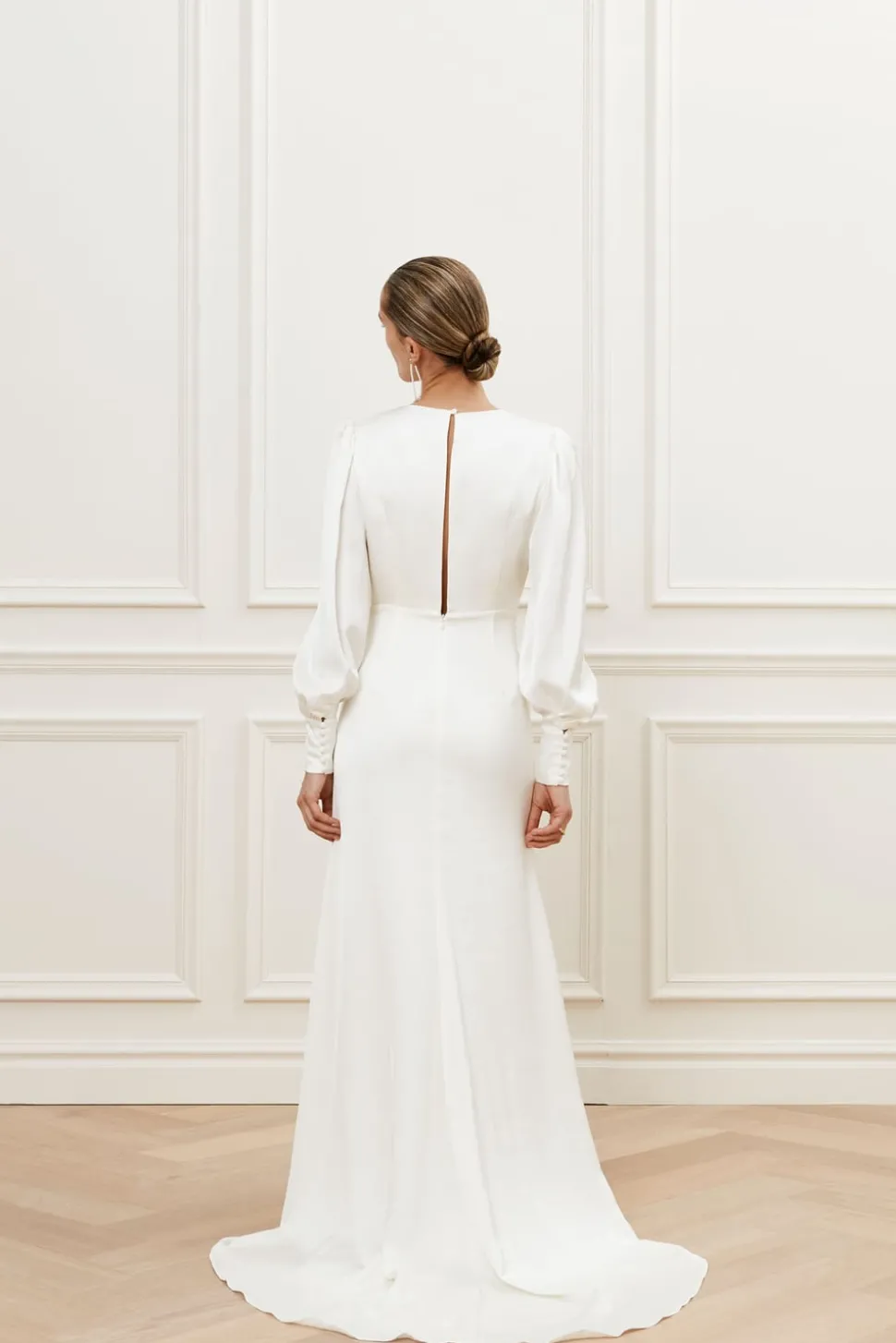 Figurnära bröllopsklänning med släp. Klänningen har ballongärmar som avslutas med bredare manchetter och klädda knappar.
