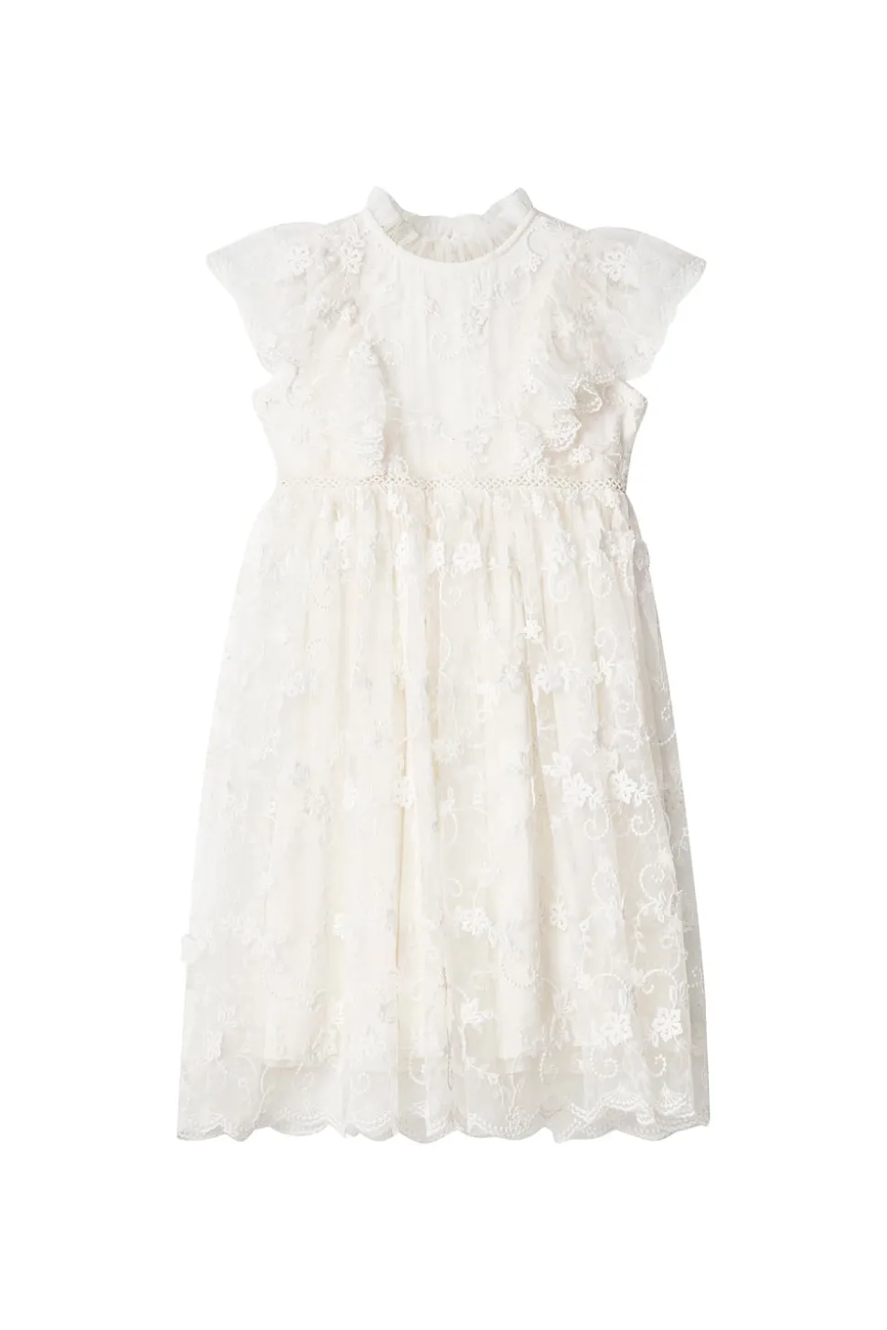 Brudnäbbsklänning detaljerad med broderad spets, hög hals och söta volanger på ärmar.
