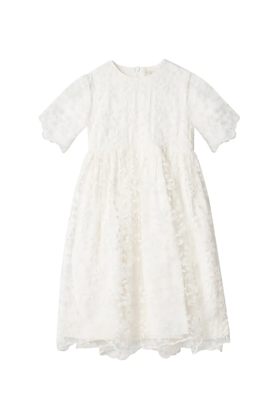 Brudnäbbsklänning med detaljerad blomspets och korta ärmar.