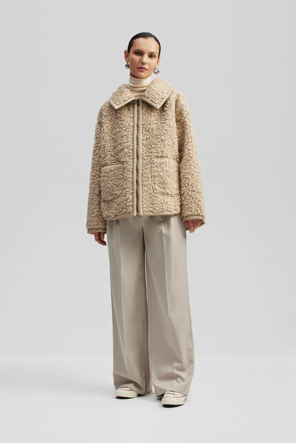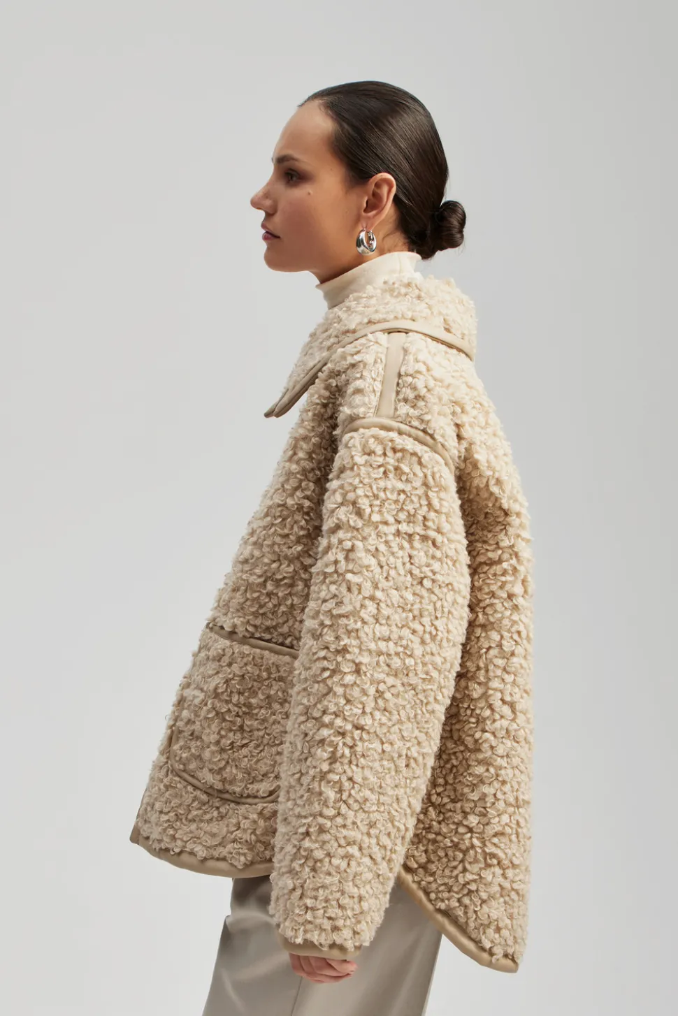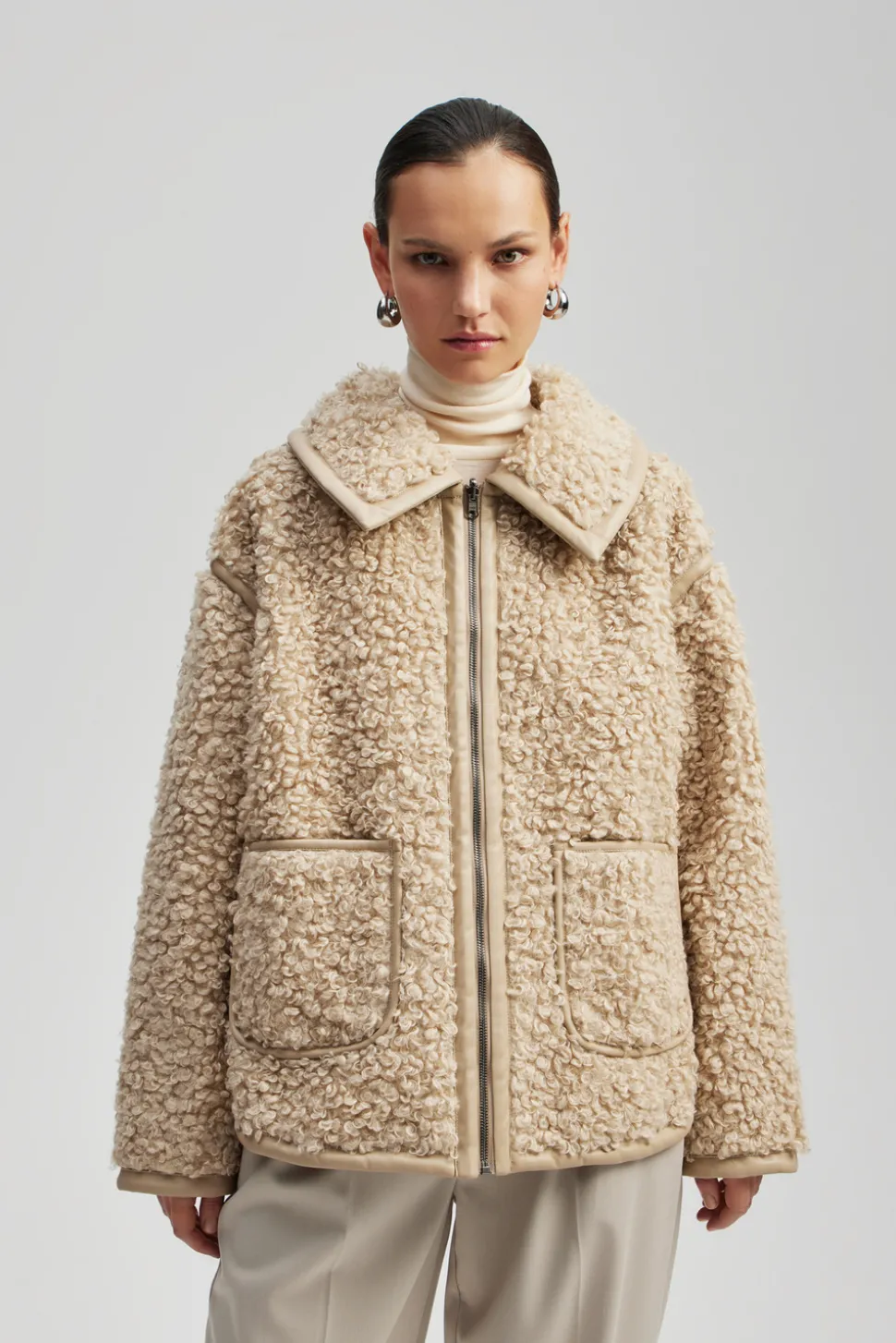 Jacka i pälsimmitation med krage och fickor i oversized design.
