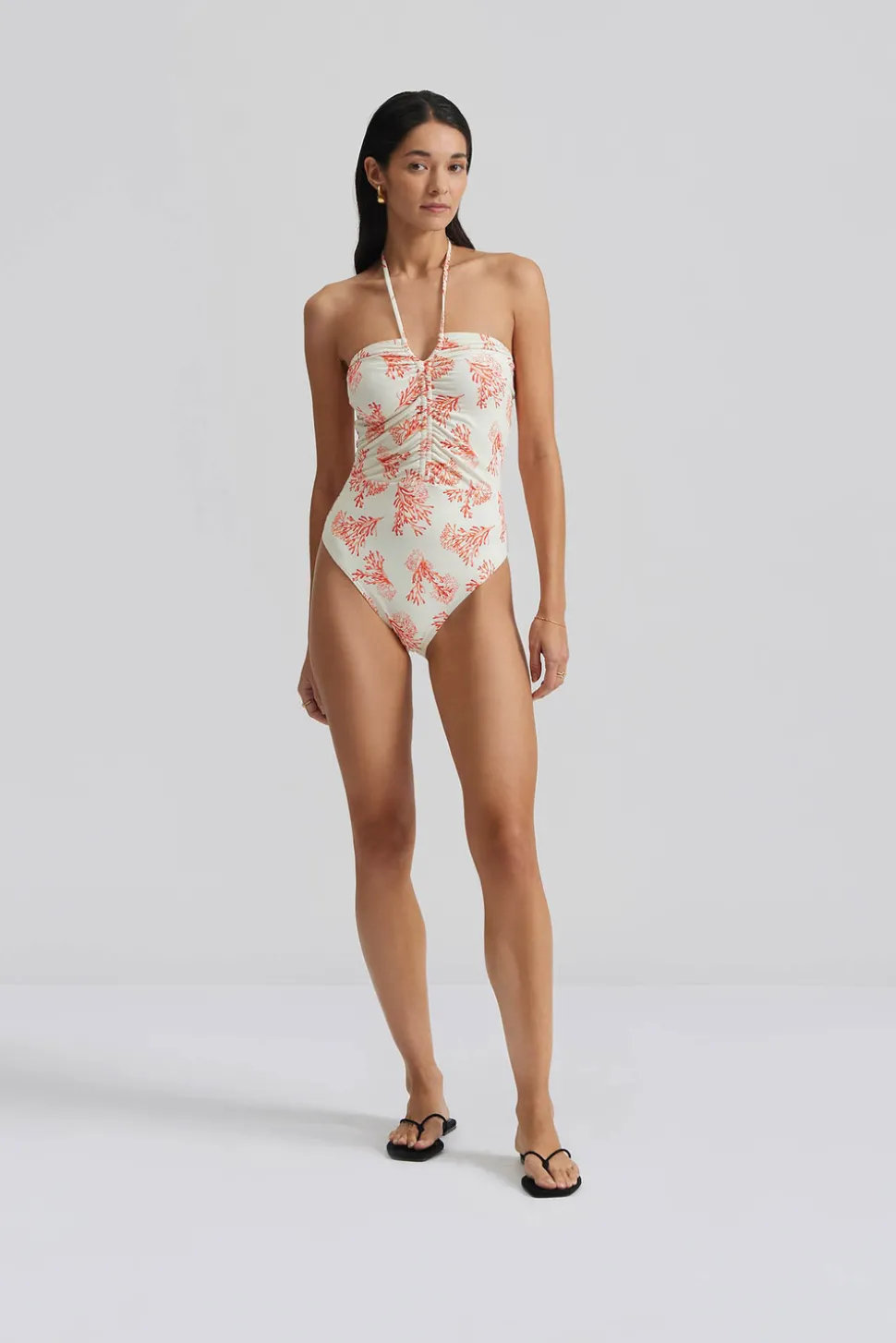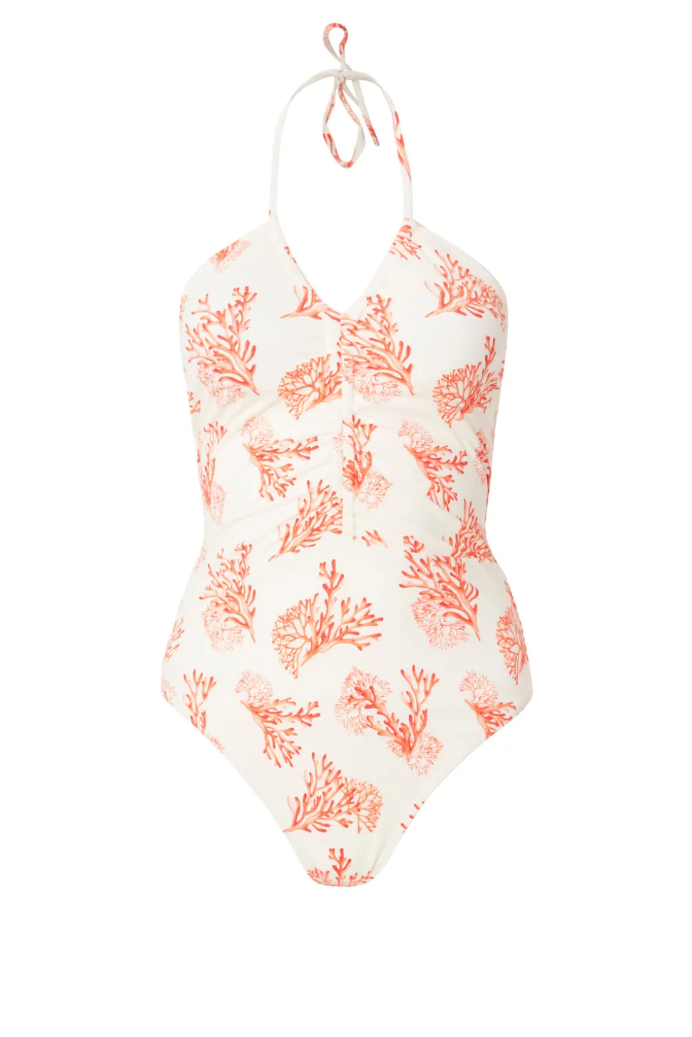 Mönstrad baddräkt med halterneck och rynkad detalj.