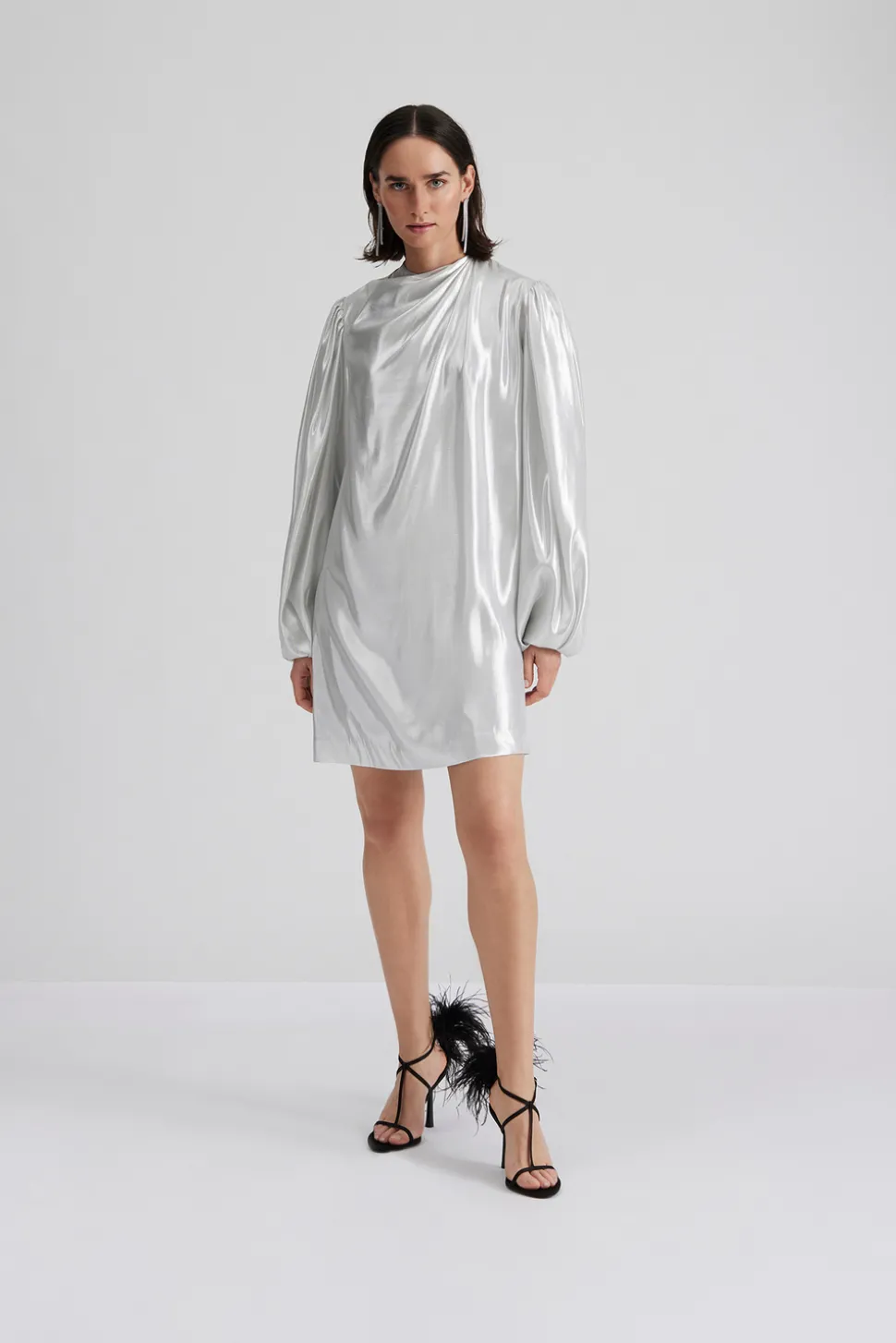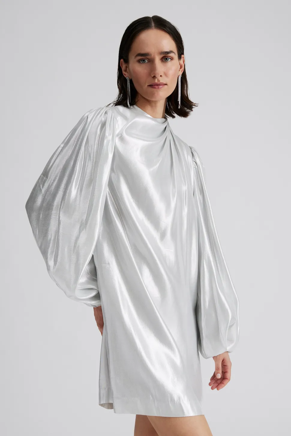 Draperad miniklänning i siden med långa ballongärmar.