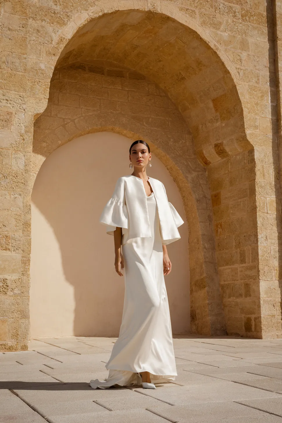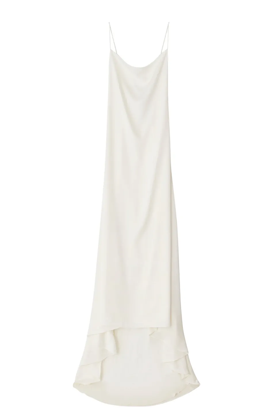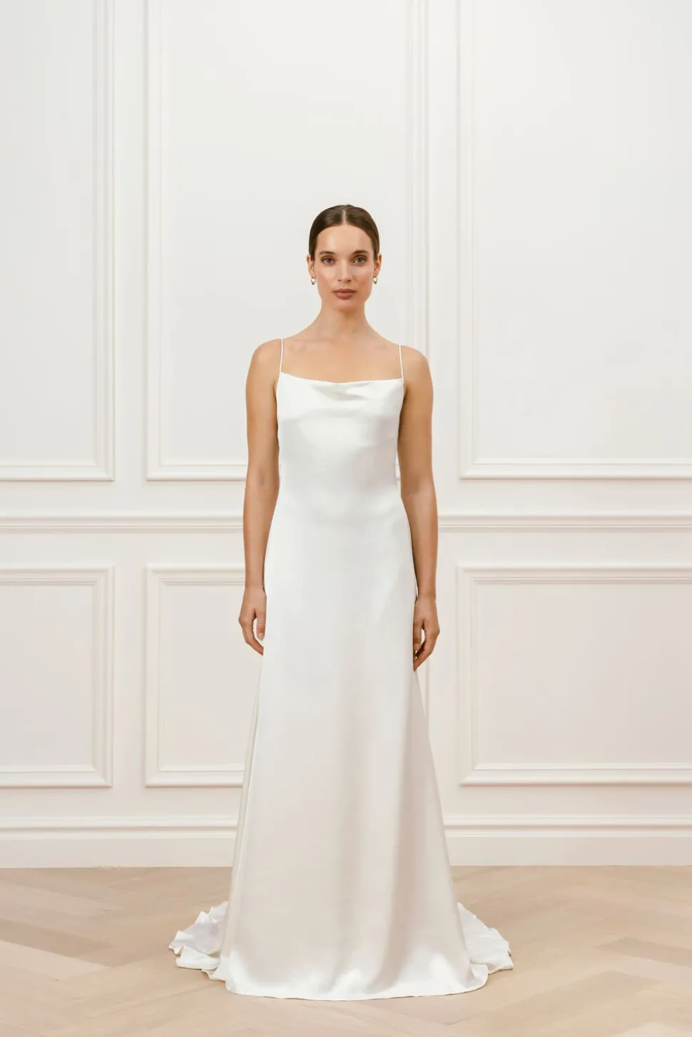 Bröllopsklänning med draperad ringning och tunna band. Klänningen har ett material med lyster, en djup öppen rygg och ett mindre släp.