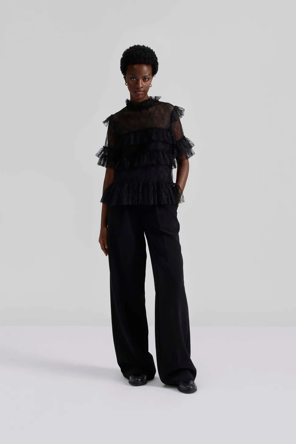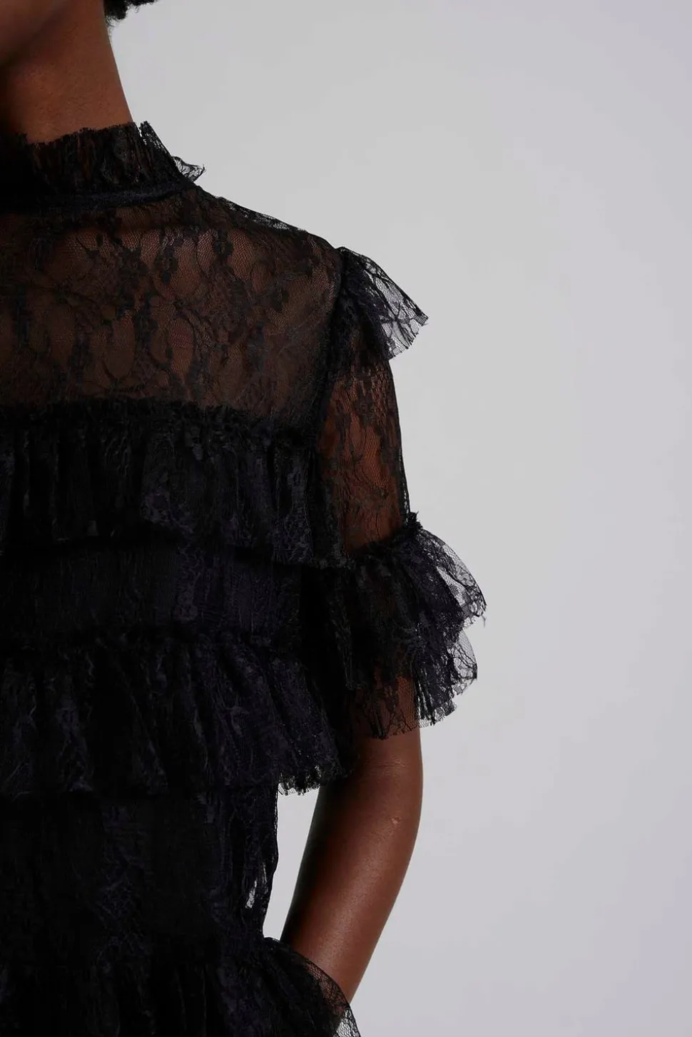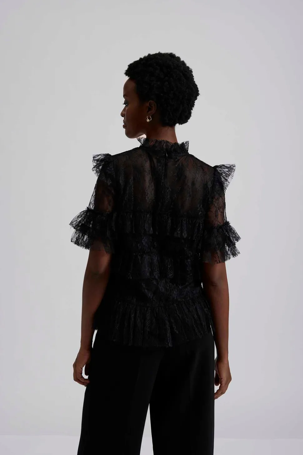 Kortärmad spetsblus med hög hals och volangdetaljer.