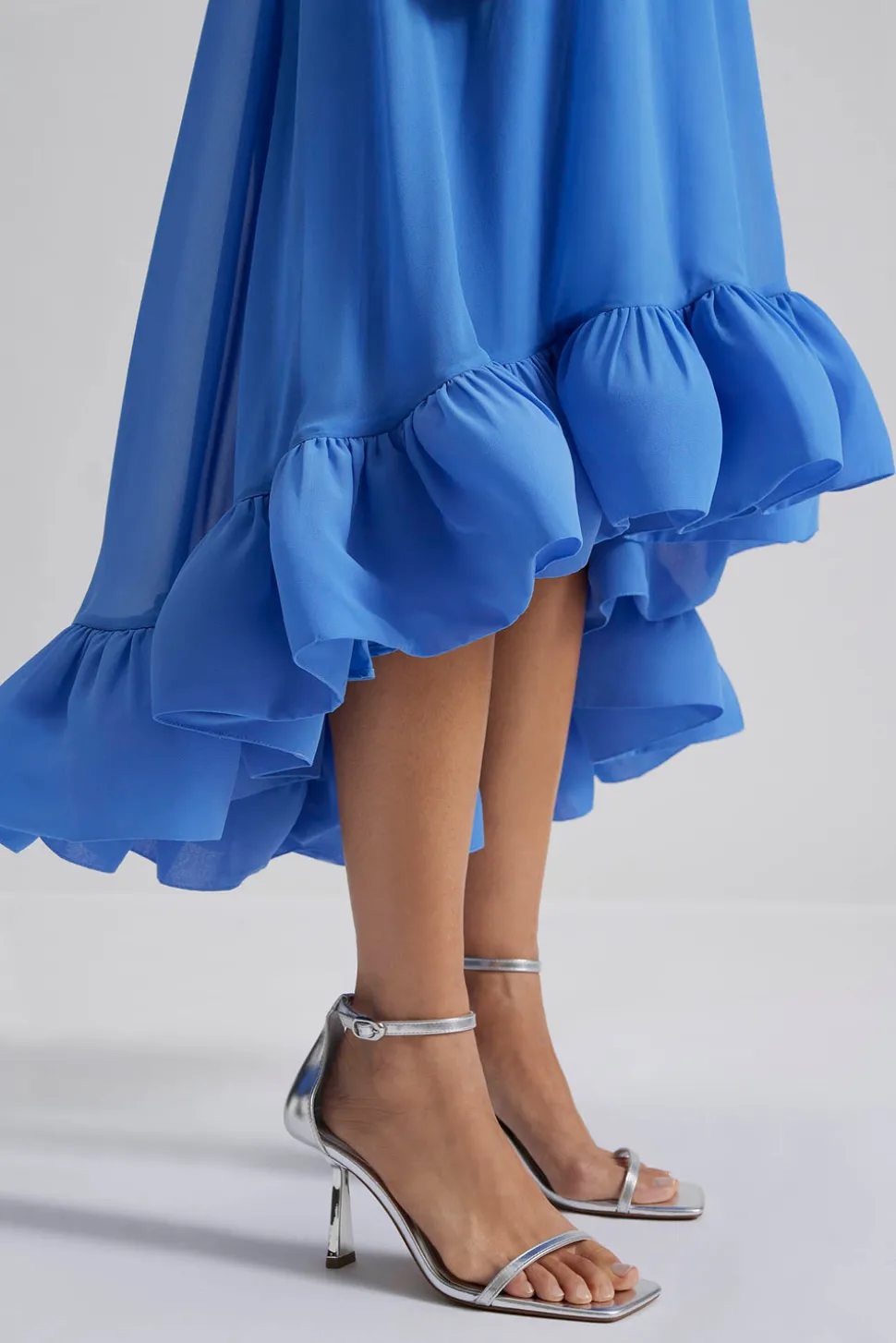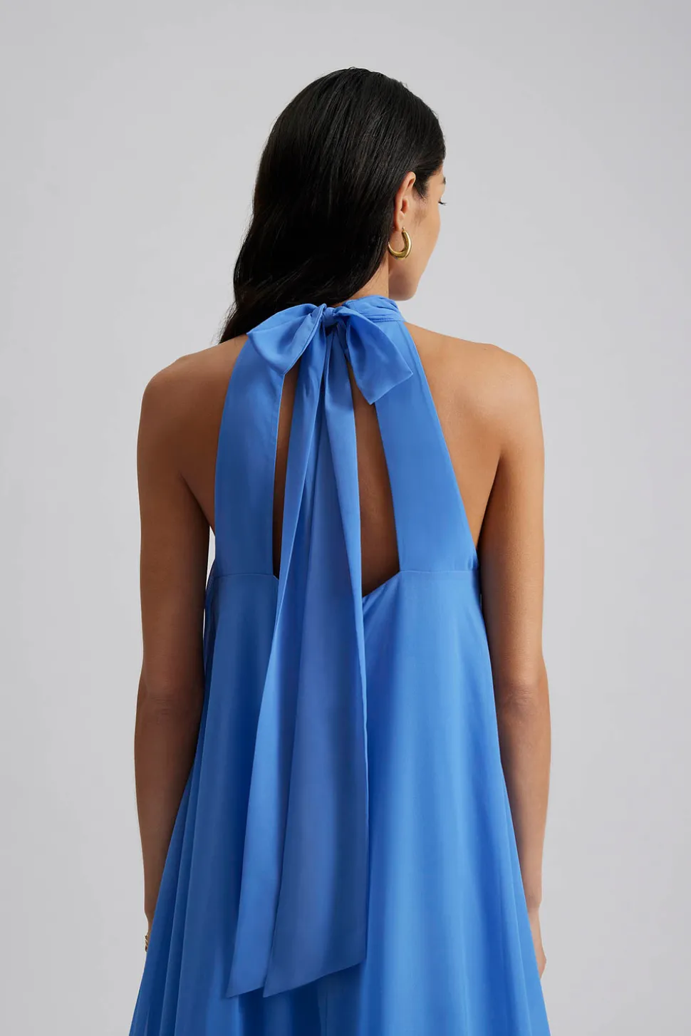 Halterneck maxiklänning med öppen rygg, volangkjol som knyts i nacken.