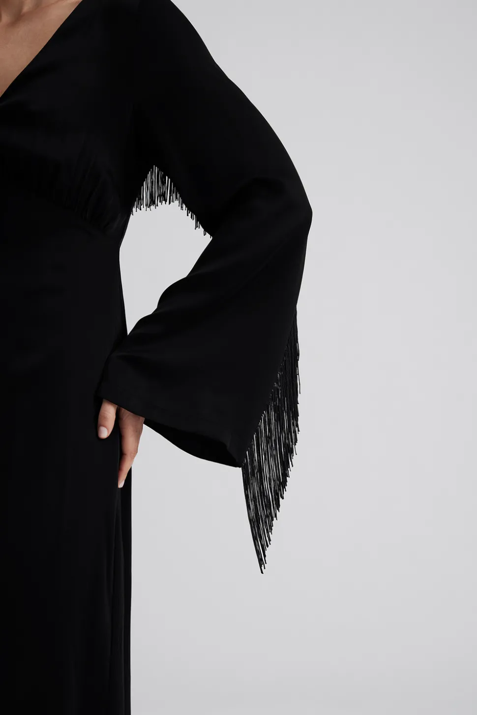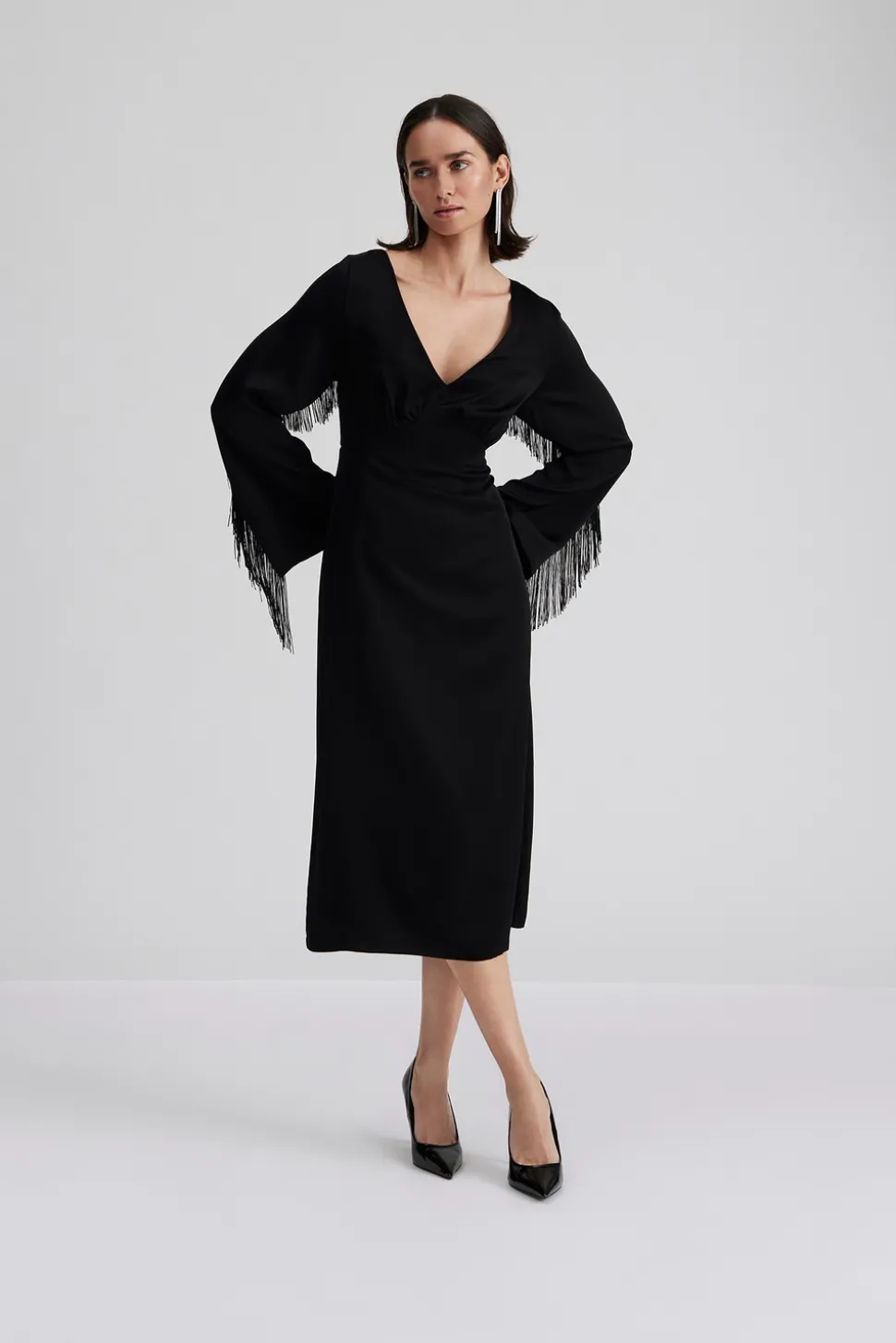 Långärmad midiklänning med djup v-ringning och fransar.