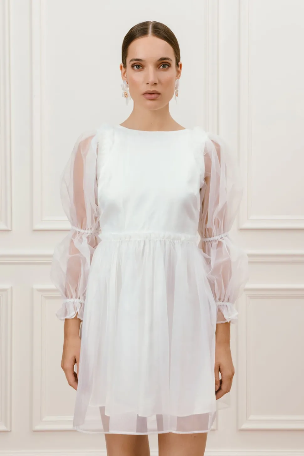 Miniklänning i organza tyg med puffärmar och öppen rygg. Den ultimata festklänningen efter vigseln.