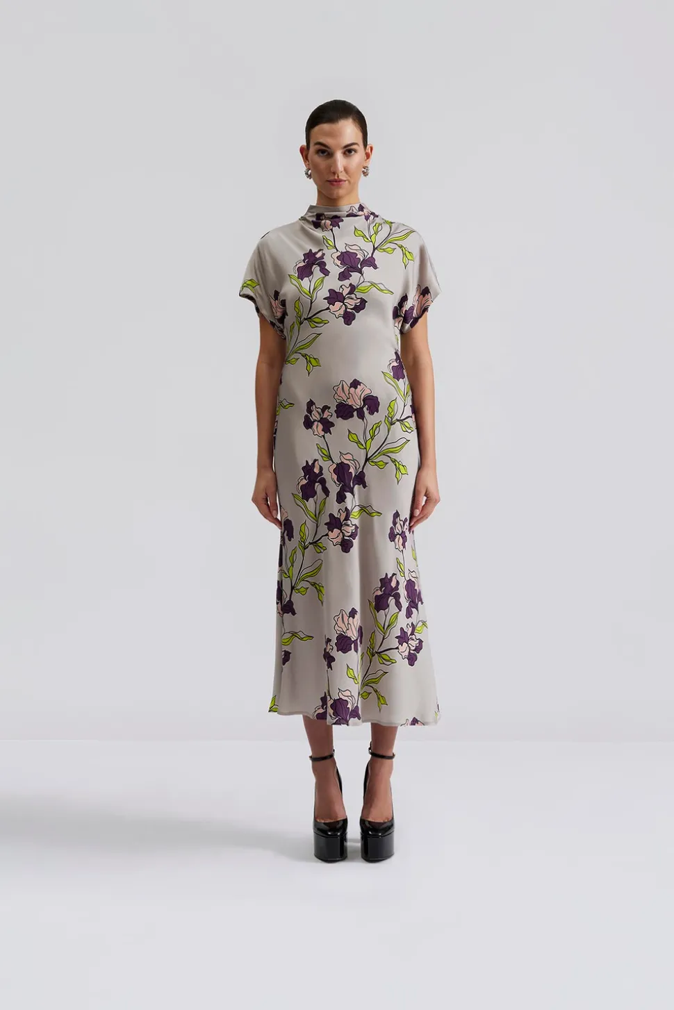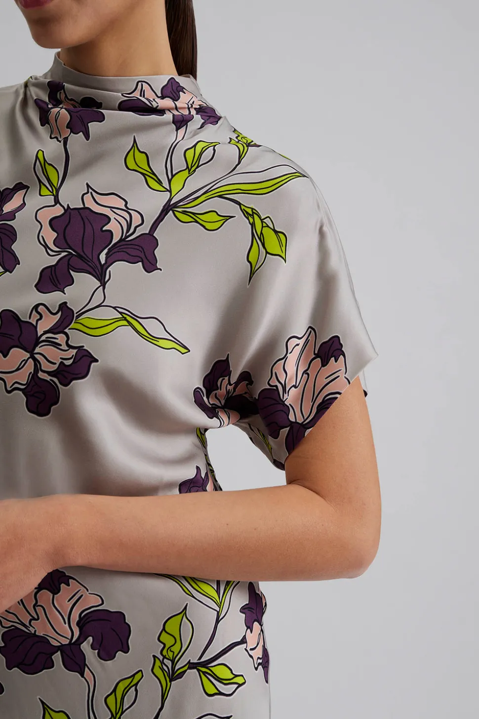 Kortärmad satin midiklänning med draperad halvpolo