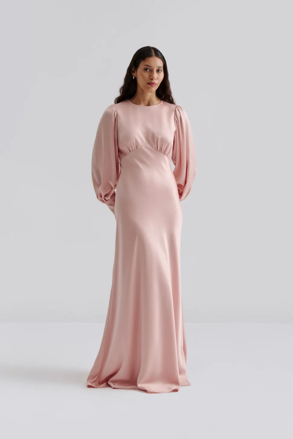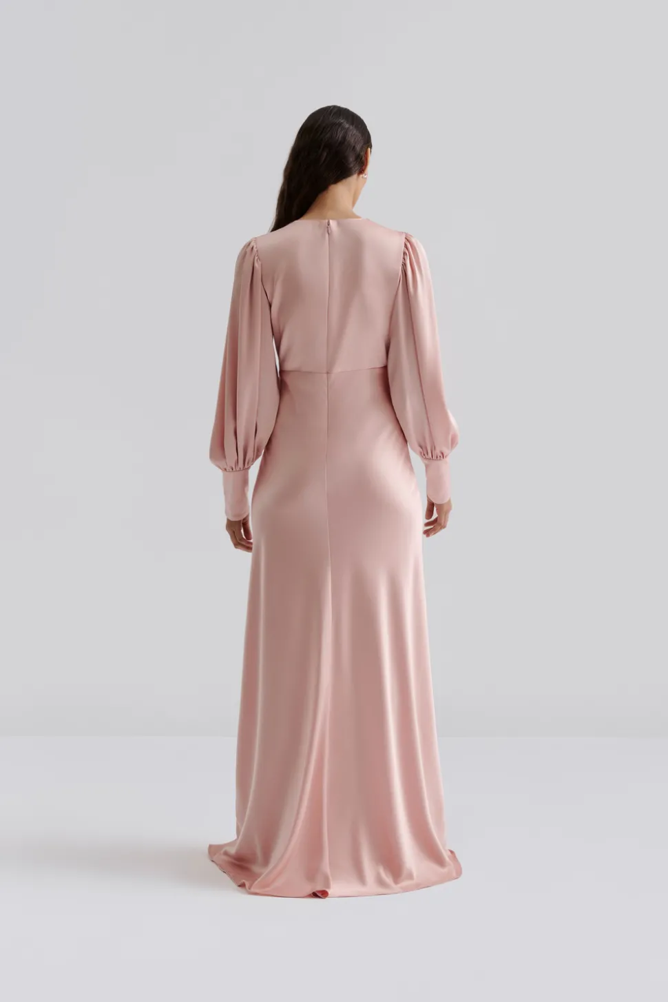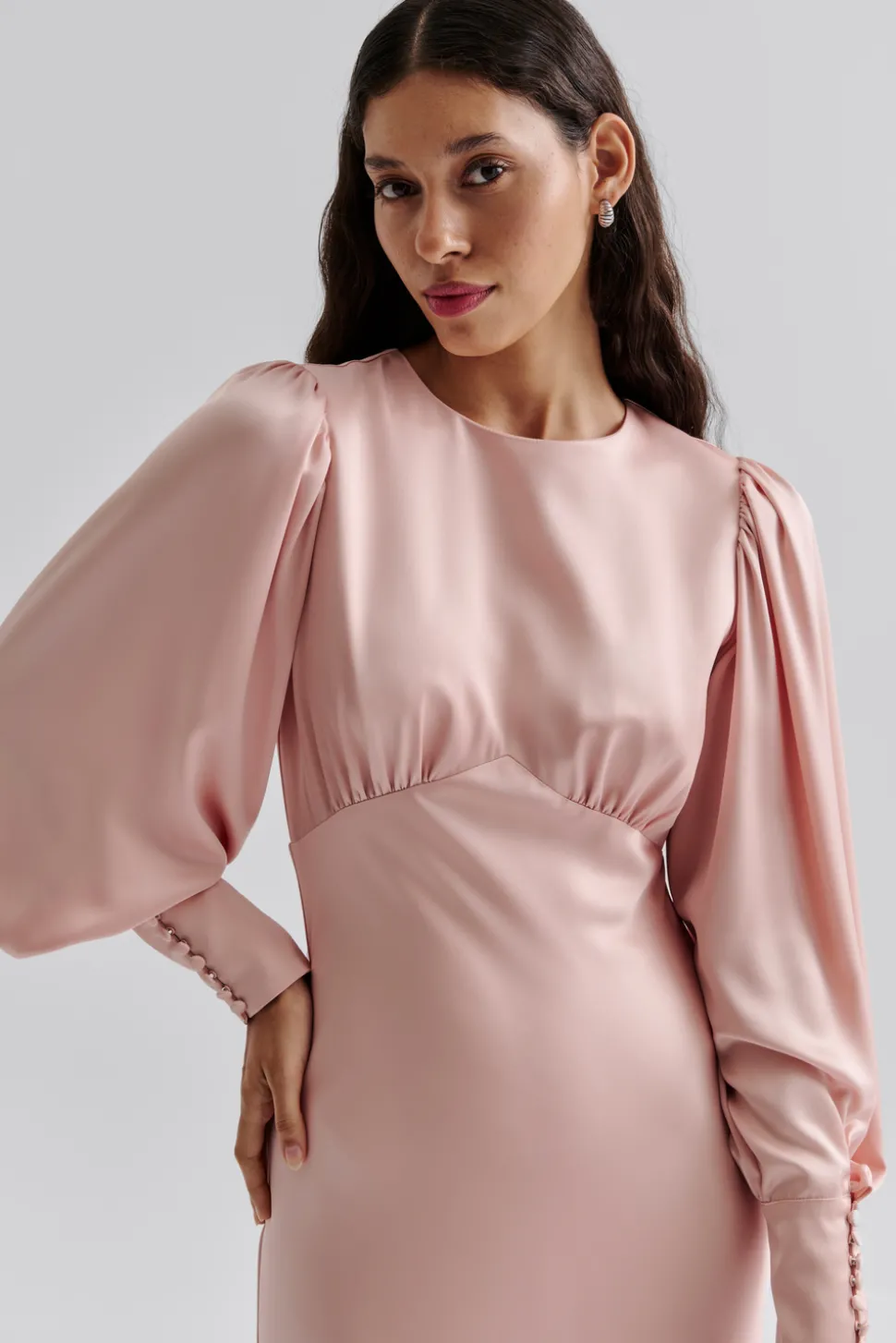 Långärmad maxiklänning i satin. Den figurnära siluetten tillsammans med de långa ballongärmarna gör denna klänning till den perfekta outfiten för fester och bröllop!