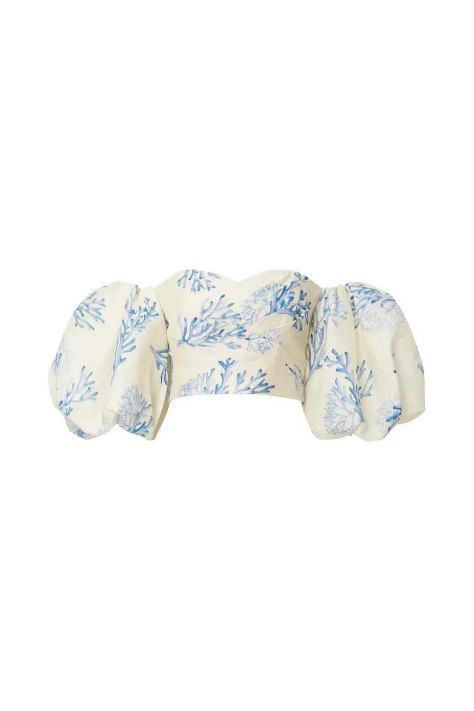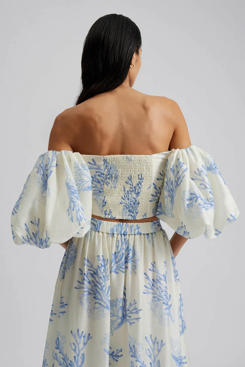 Mönstrad draperad topp med off-shoulder och puffärm.